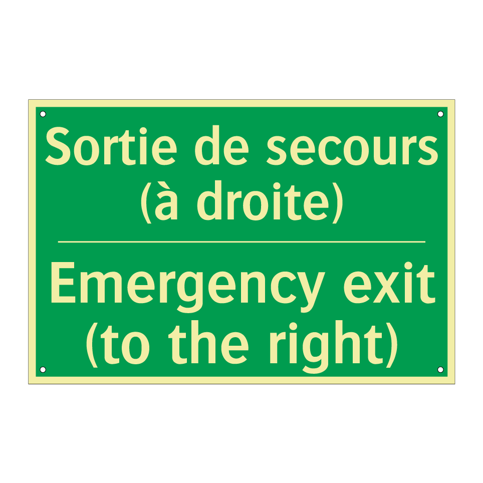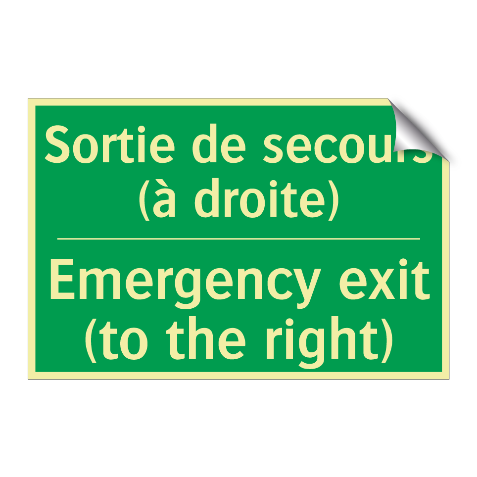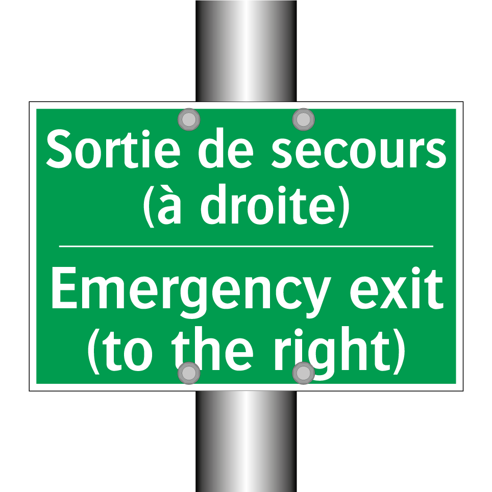 Panneau de secours bilingue avec texte en français : "Sortie de secours (à droite)", et en anglais : "Emergency exit (to the right)"
