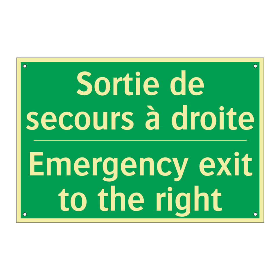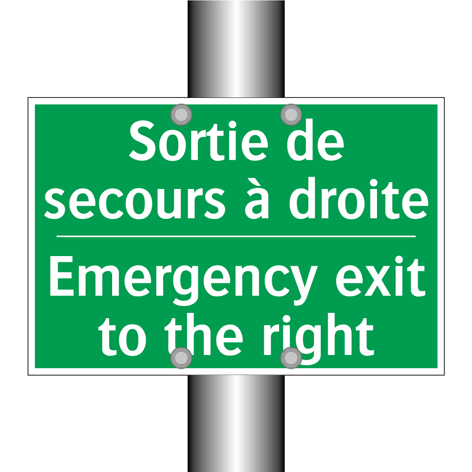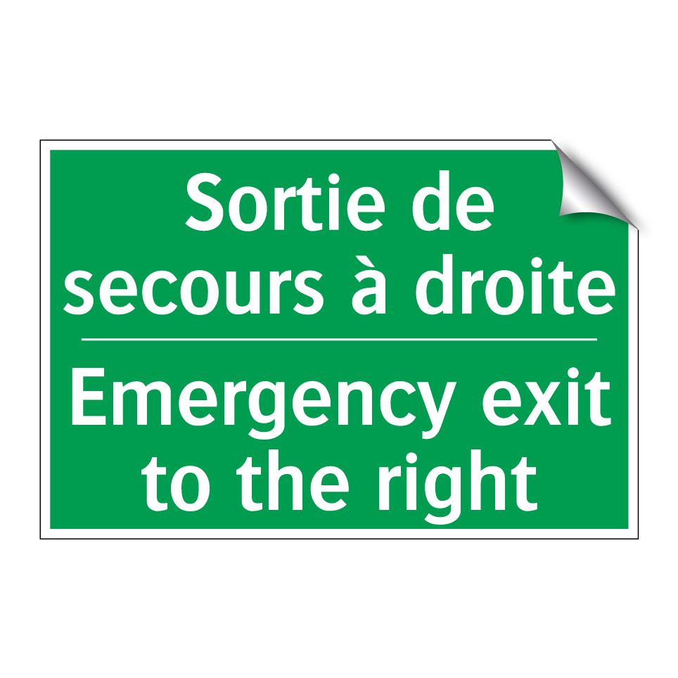 Panneau de secours bilingue avec texte en français : "Sortie de secours à droite", et en anglais : "Emergency exit to the right"