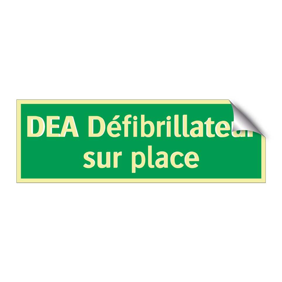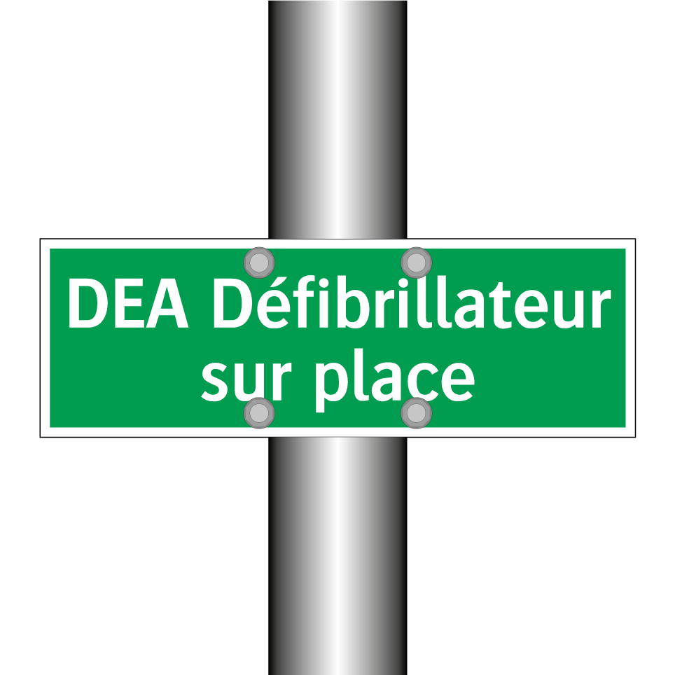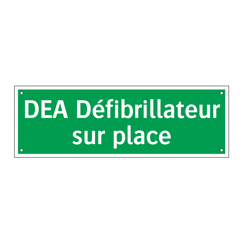 Panneau de secours avec le texte DEA Défibrillateur sur place
