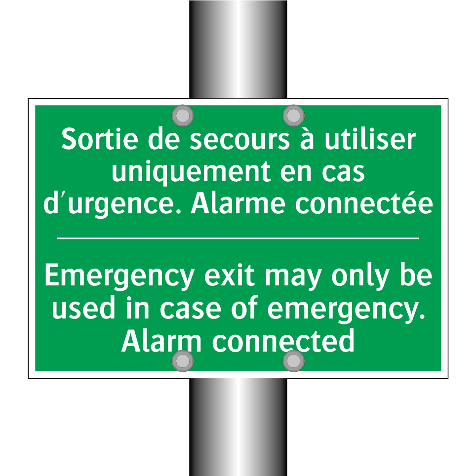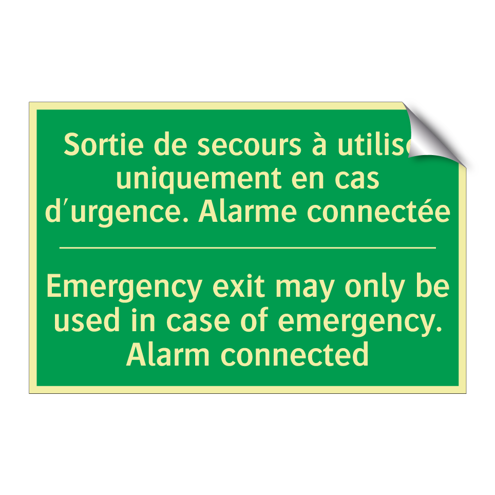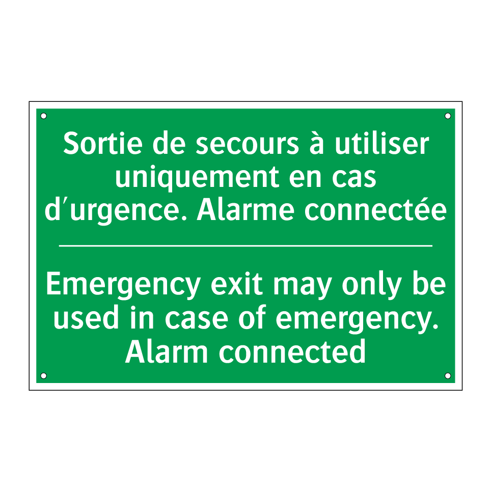 Panneau de secours bilingue avec texte en français : "Sortie de secours à utiliser uniquement en cas d'urgence. Alarme connectée", et en anglais : "Emergency exit may only be used in case of emergency. Alarm connected"