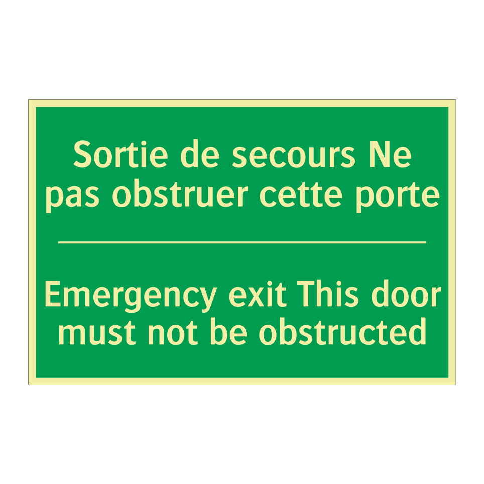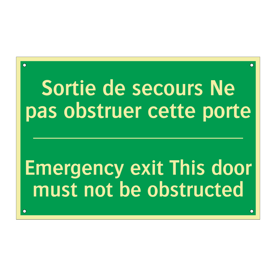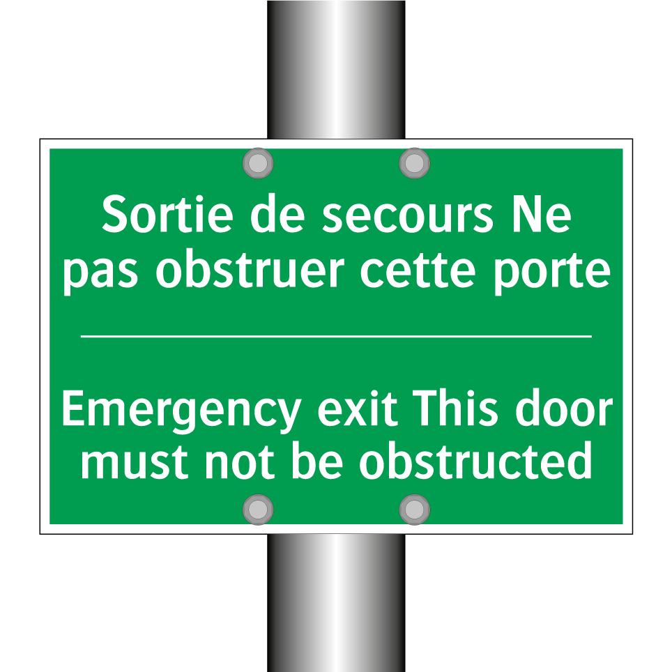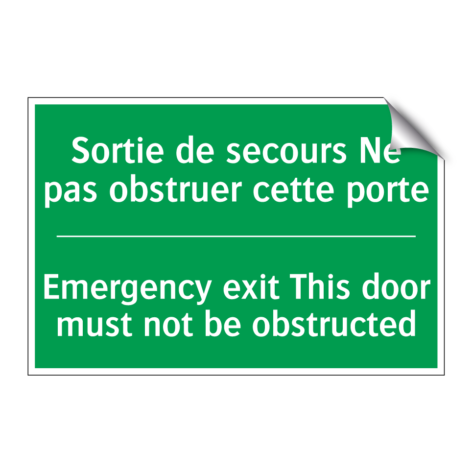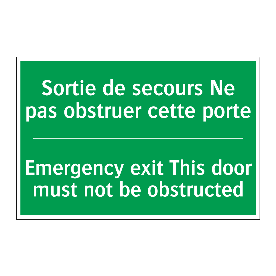 Panneau de secours bilingue avec texte en français : "Sortie de secours Ne pas obstruer cette porte", et en anglais : "Emergency exit This door must not be obstructed"