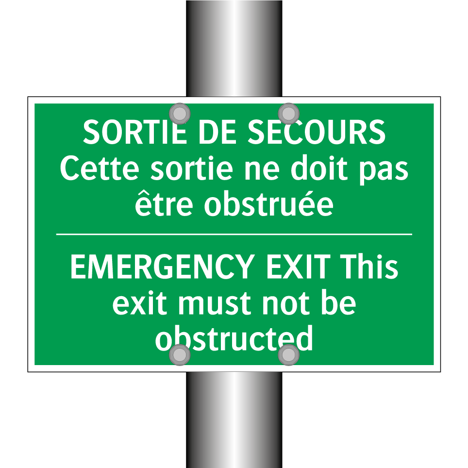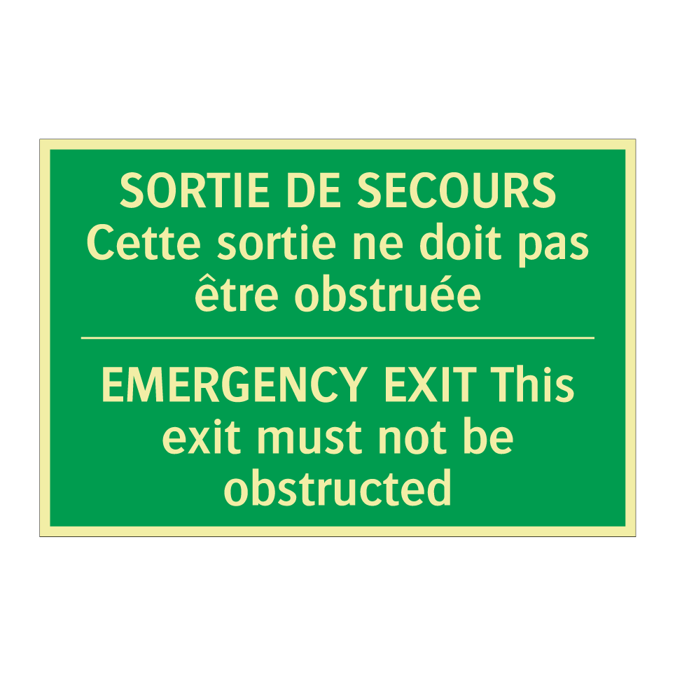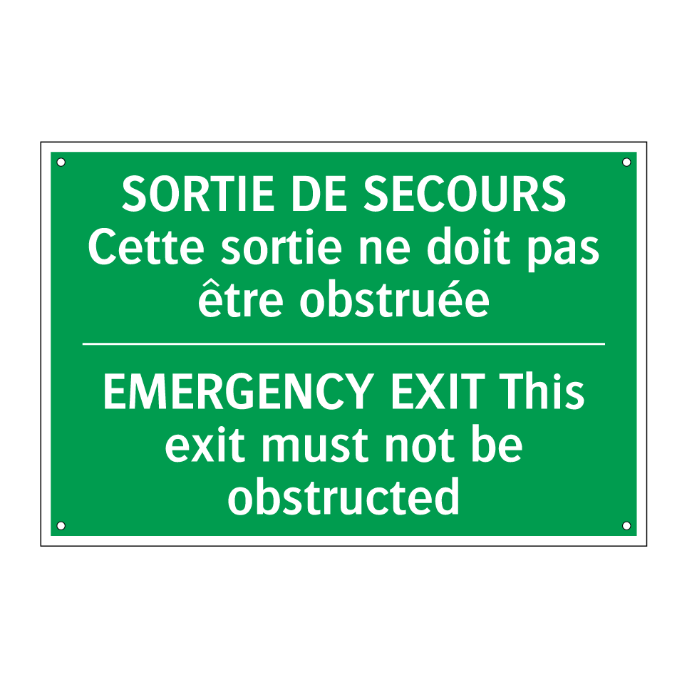 Panneau de secours bilingue avec texte en français : "SORTIE DE SECOURS Cette sortie ne doit pas être obstruée", et en anglais : "EMERGENCY EXIT This exit must not be obstructed"