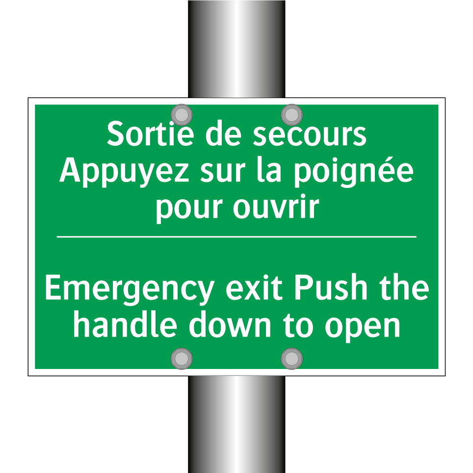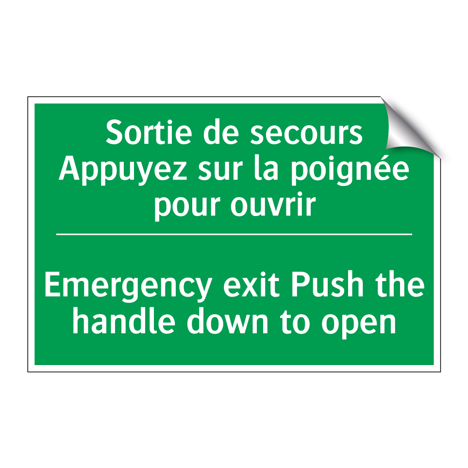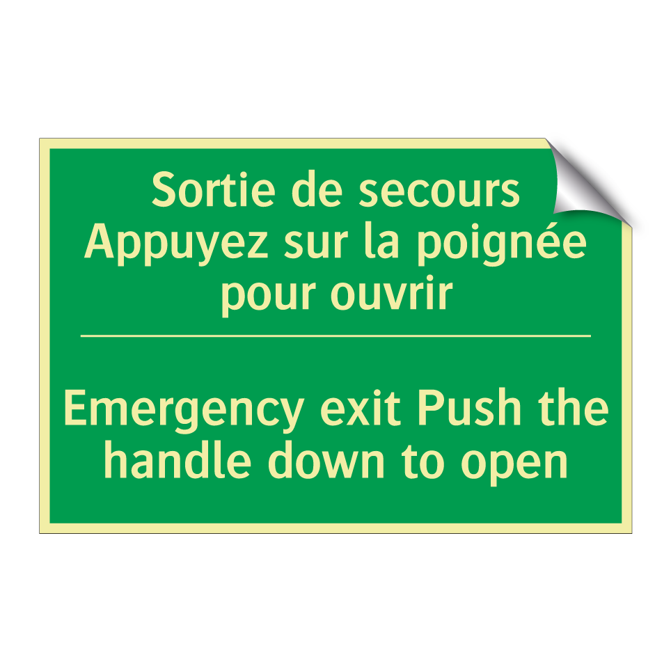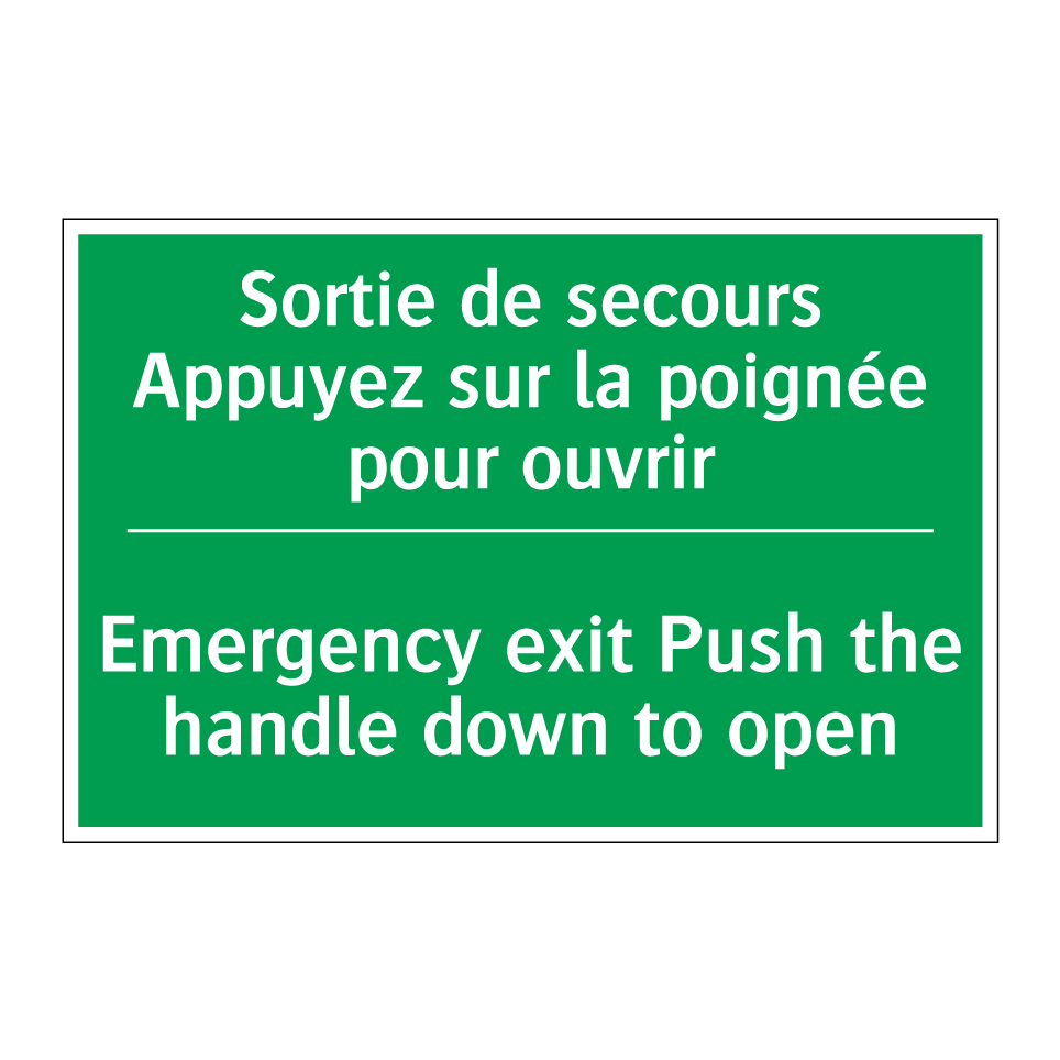 Panneau de secours bilingue avec texte en français : "Sortie de secours Appuyez sur la poignée pour ouvrir", et en anglais : "Emergency exit Push the handle down to open"