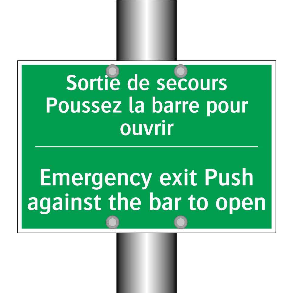 Panneau de secours bilingue avec texte en français : "Sortie de secours Poussez la barre pour ouvrir", et en anglais : "Emergency exit Push against the bar to open"