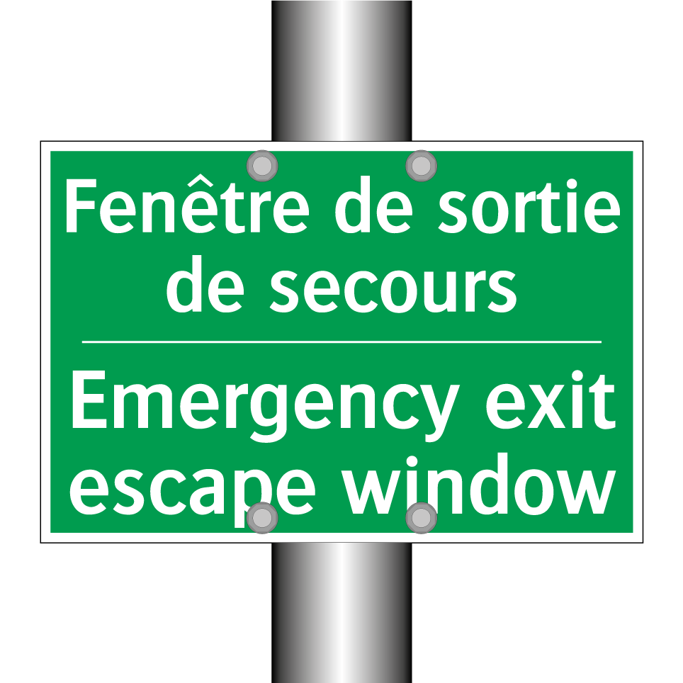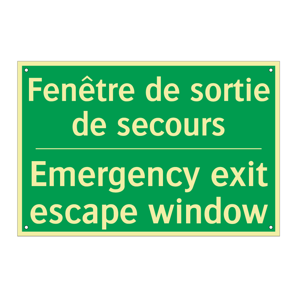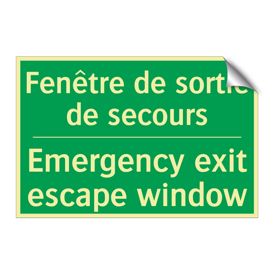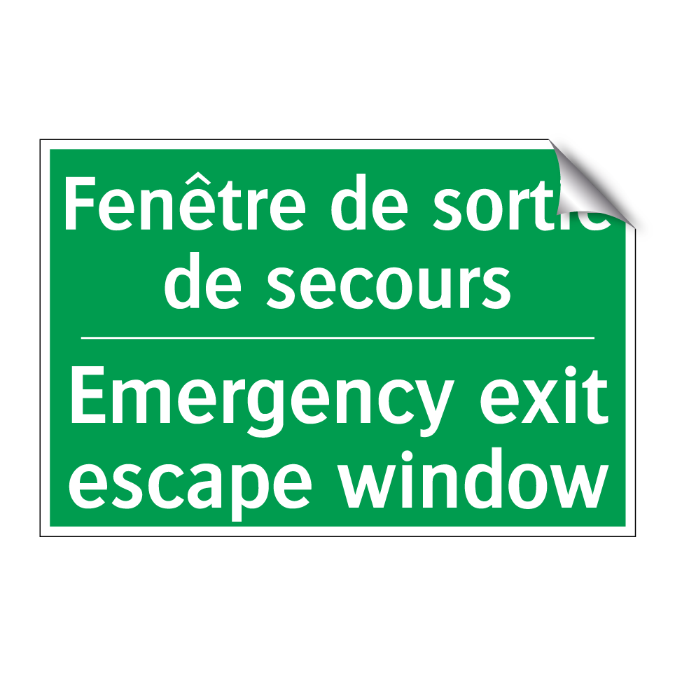 Panneau de secours bilingue avec texte en français : "Fenêtre de sortie de secours", et en anglais : "Emergency exit escape window"