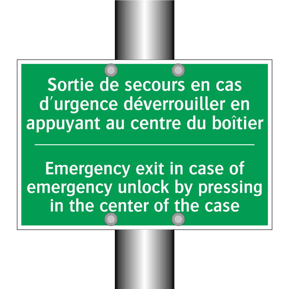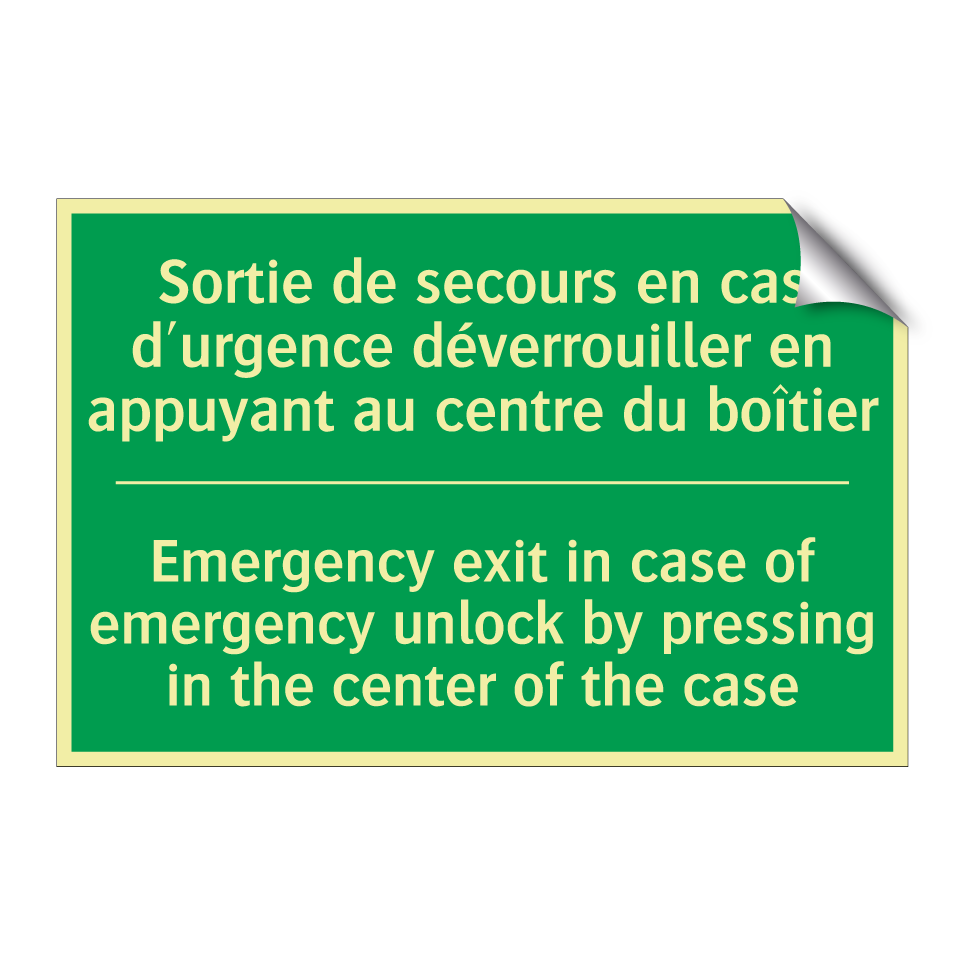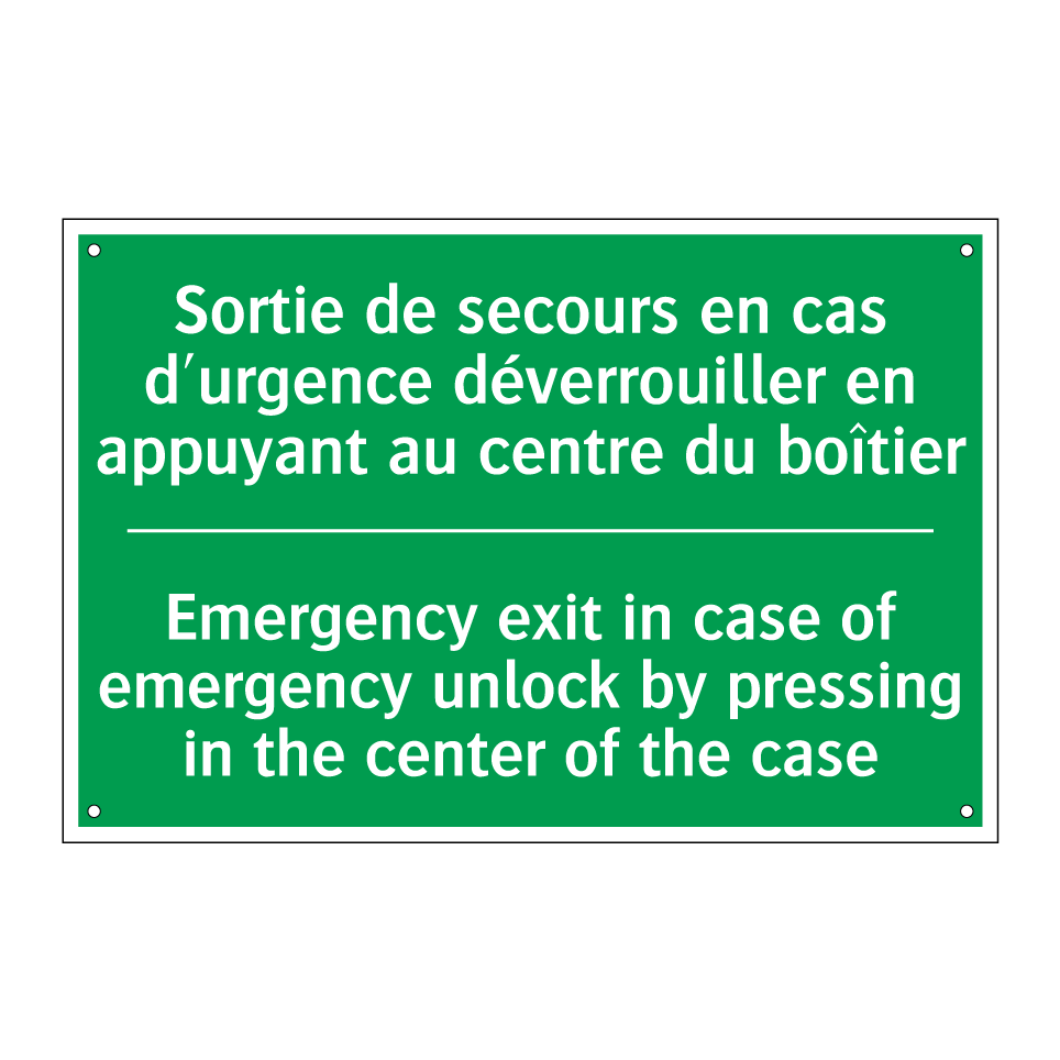 Panneau de secours bilingue avec texte en français : "Sortie de secours en cas d'urgence déverrouiller en appuyant au centre du boîtier", et en anglais : "Emergency exit in case of emergency unlock by pressing in the center of the case"