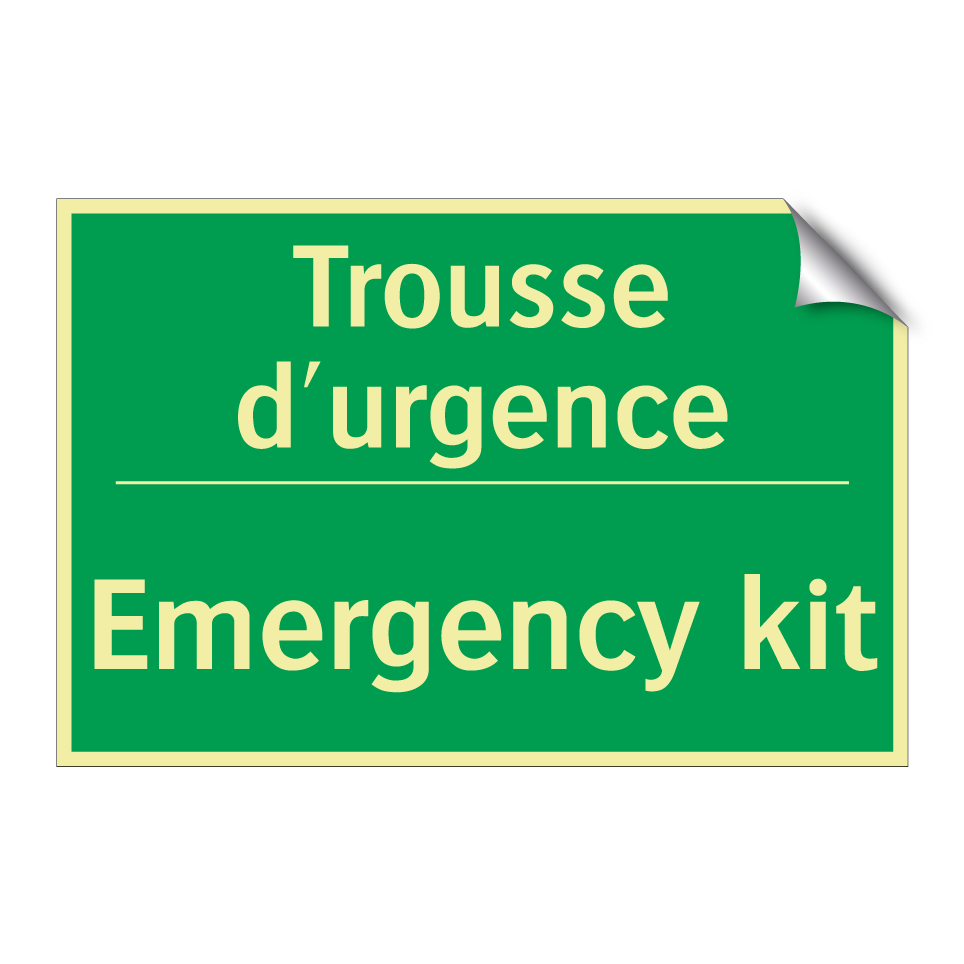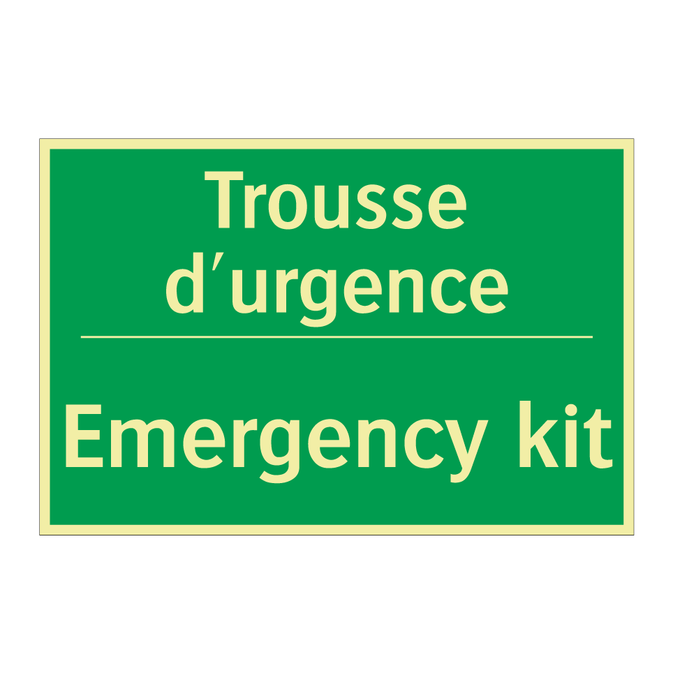 Panneau de secours bilingue avec texte en français : "Trousse d'urgence", et en anglais : "Emergency kit"