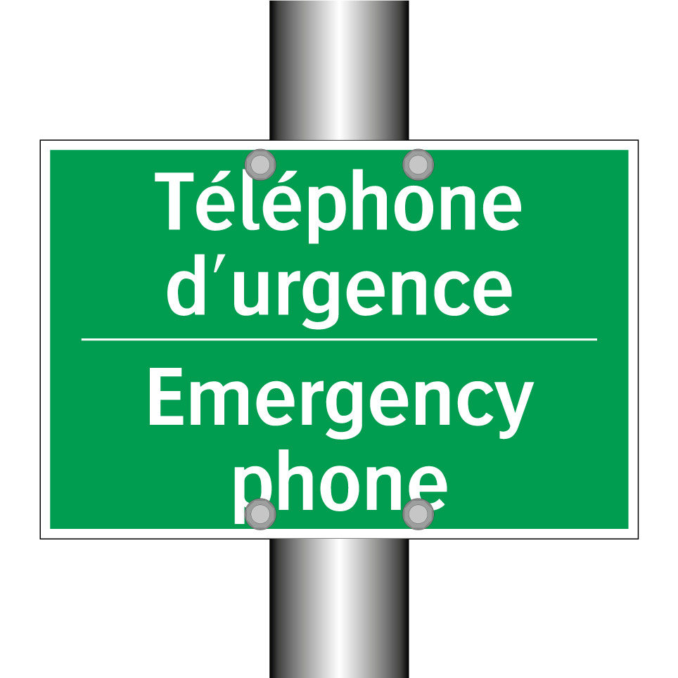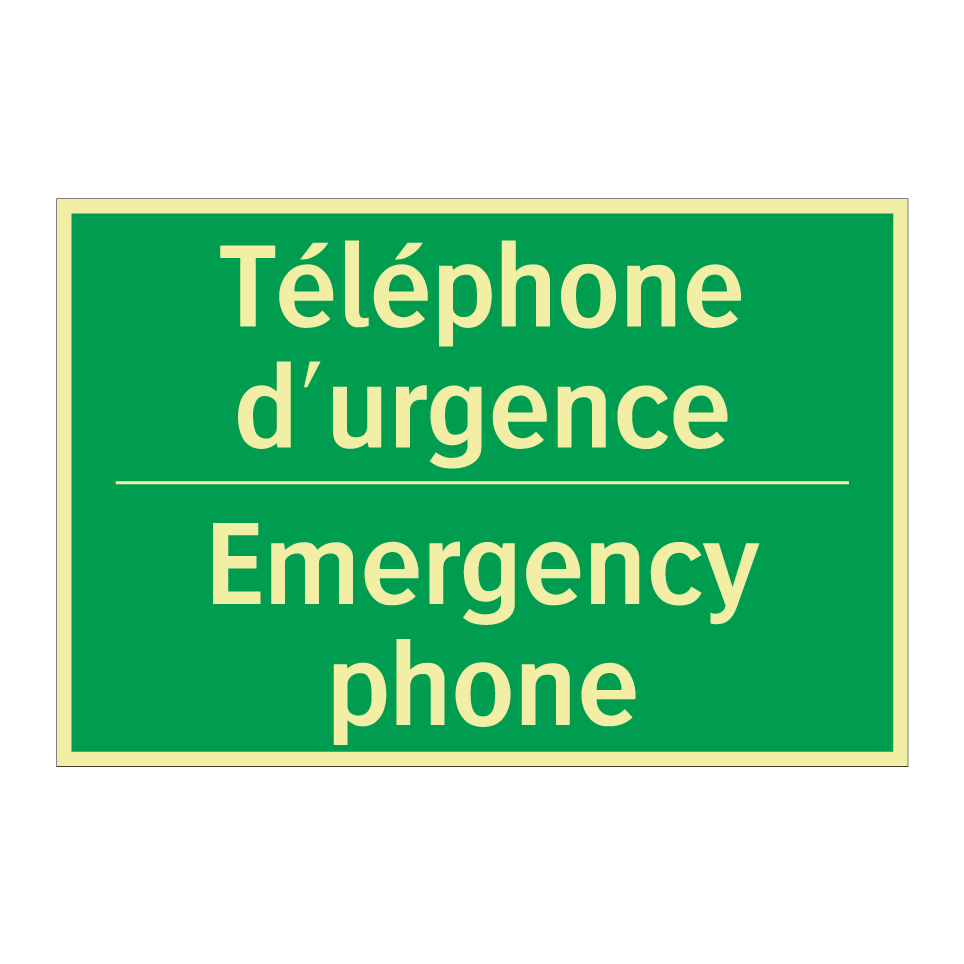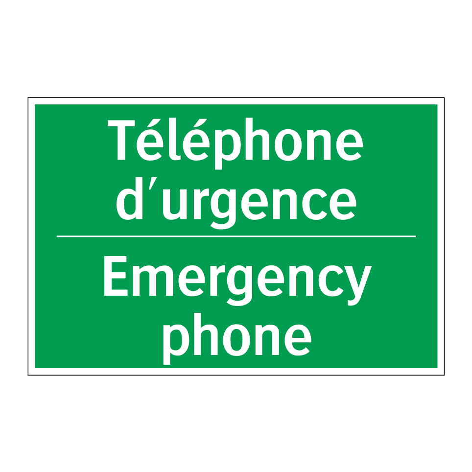 Panneau de secours bilingue avec texte en français : "Téléphone d'urgence", et en anglais : "Emergency phone"