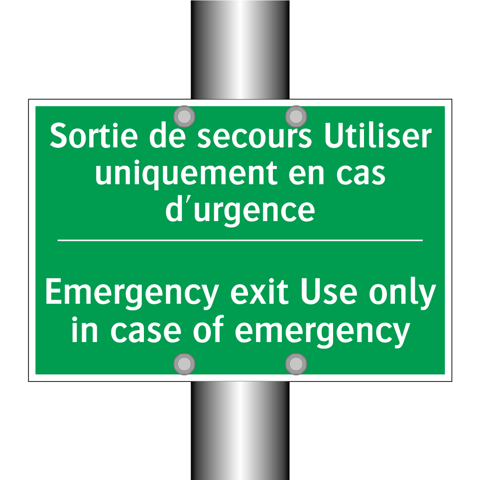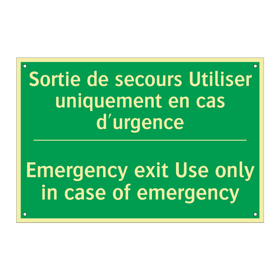 Panneau de secours bilingue avec texte en français : "Sortie de secours Utiliser uniquement en cas d'urgence", et en anglais : "Emergency exit Use only in case of emergency"