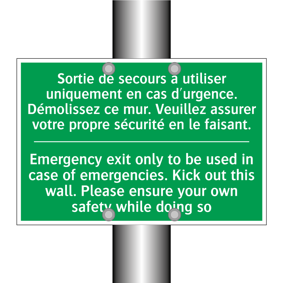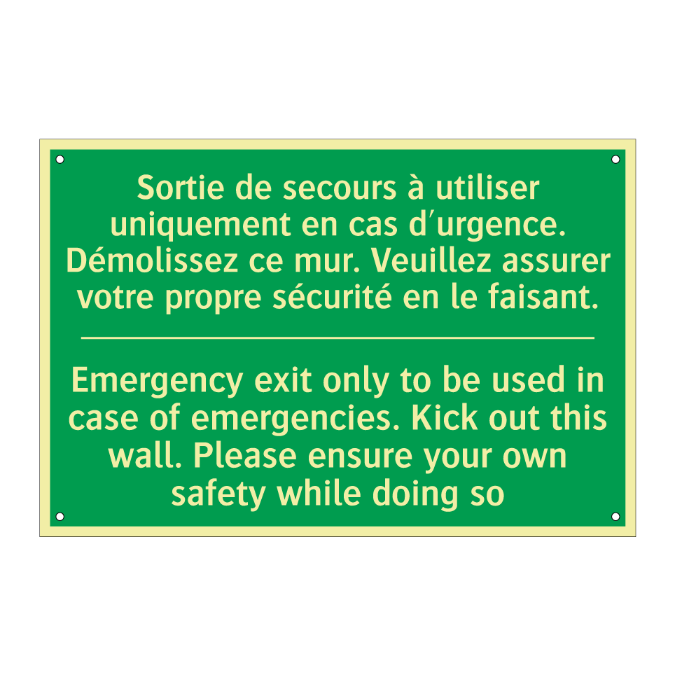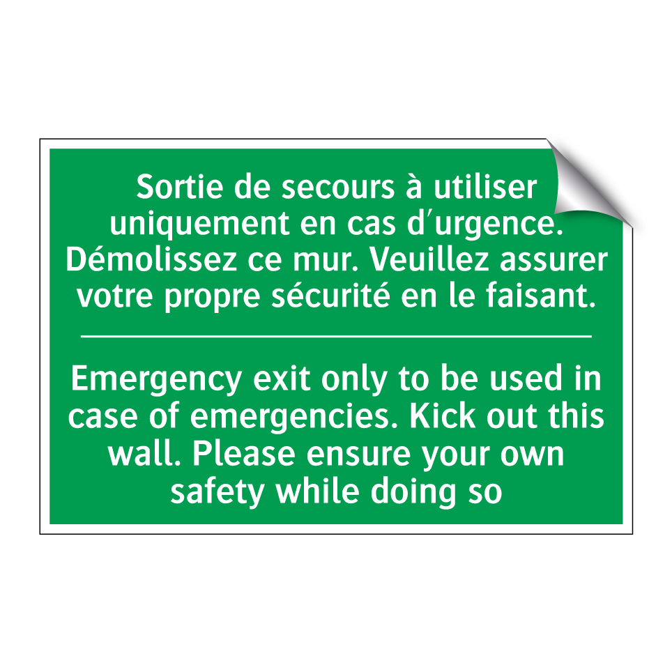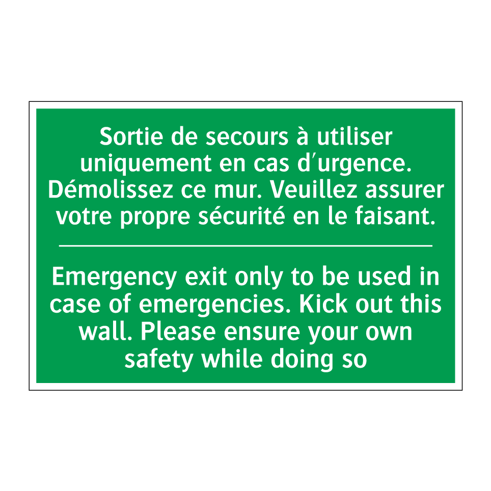 Panneau de secours bilingue avec texte en français : "Sortie de secours à utiliser uniquement en cas d'urgence. Démolissez ce mur. Veuillez assurer votre propre sécurité en le faisant.", et en anglais : "Emergency exit only to be used in case of emergencies. Kick out this wall. Please ensure your own safety while doing so"