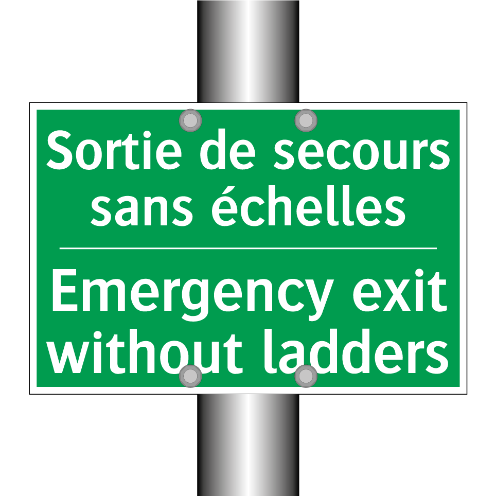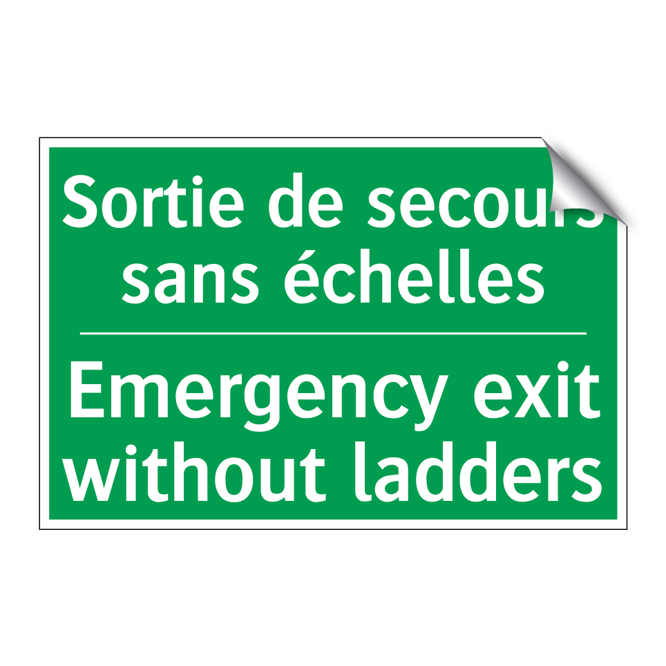 Panneau de secours bilingue avec texte en français : "Sortie de secours sans échelles", et en anglais : "Emergency exit without ladders"
