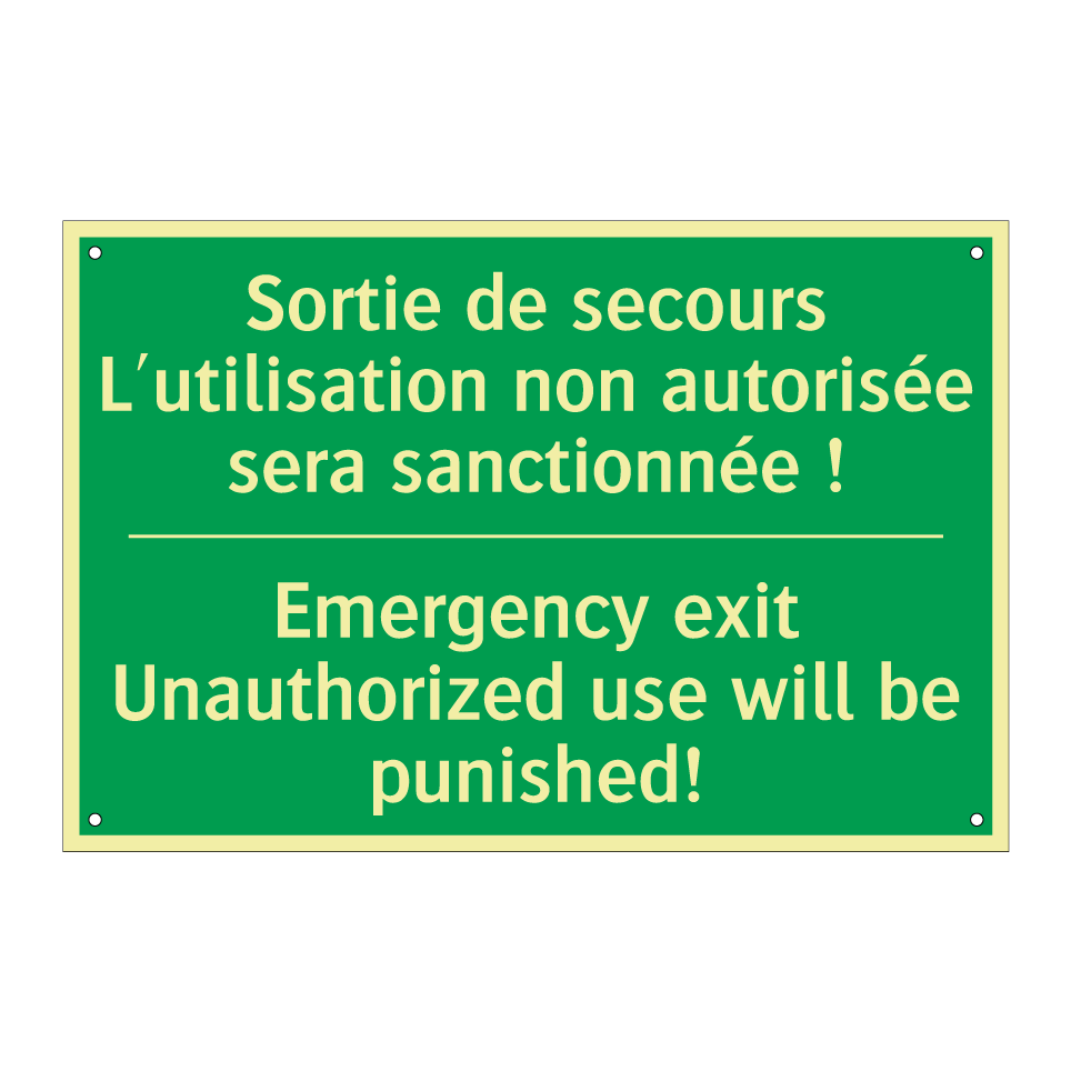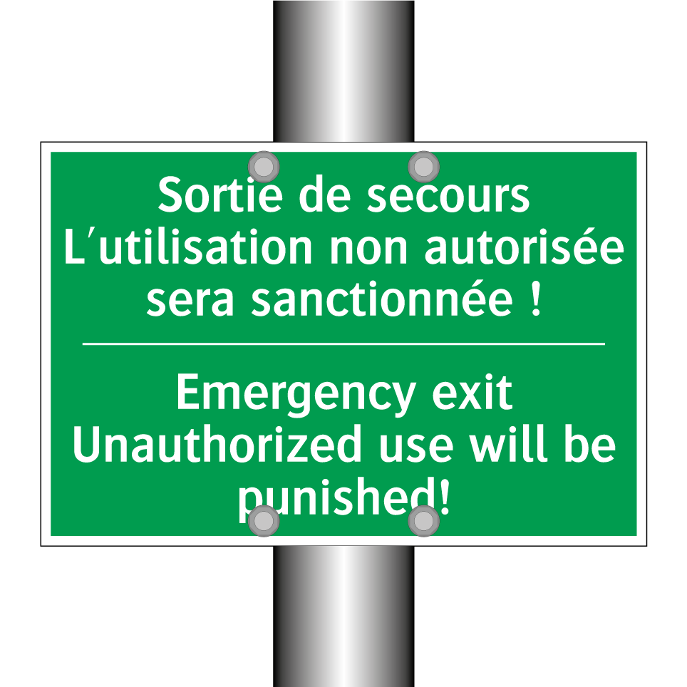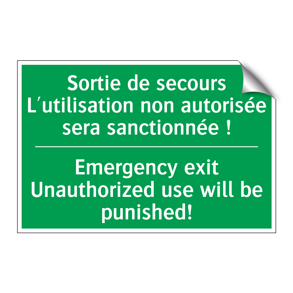 Panneau de secours bilingue avec texte en français : "Sortie de secours L'utilisation non autorisée sera sanctionnée !", et en anglais : "Emergency exit Unauthorized use will be punished!"