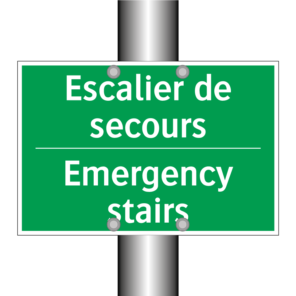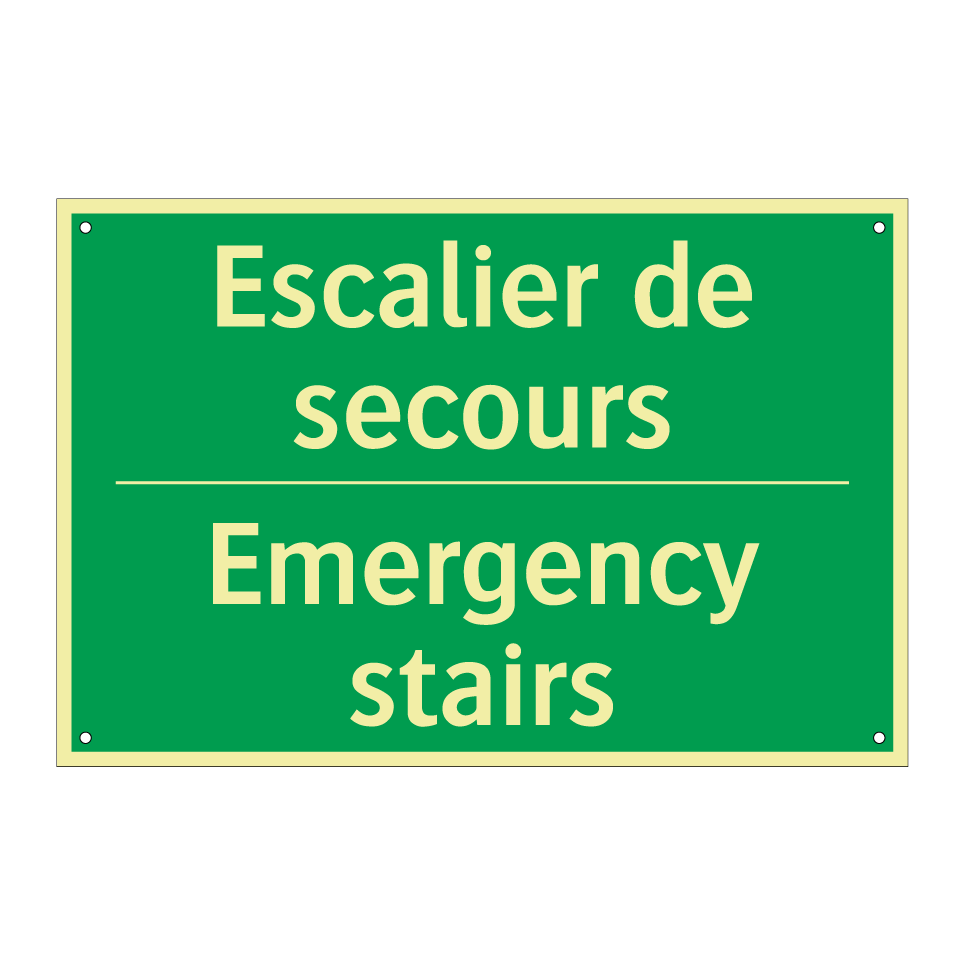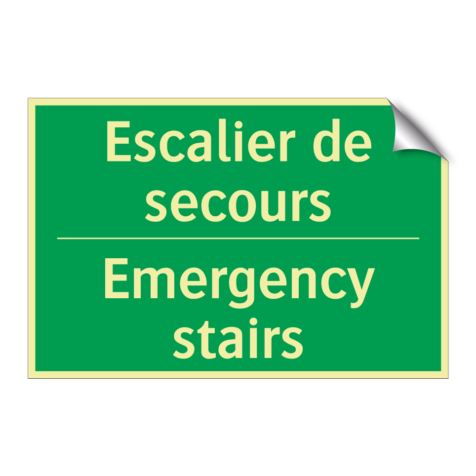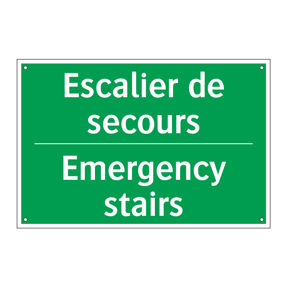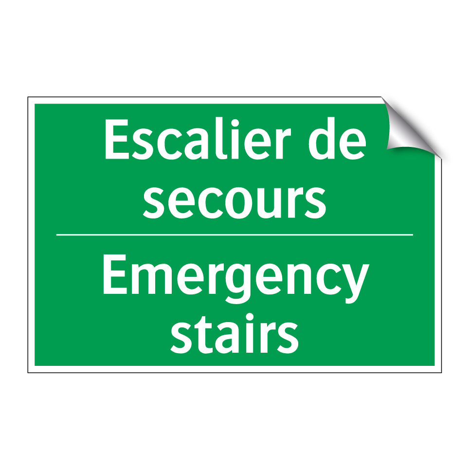 Panneau de secours bilingue avec texte en français : "Escalier de secours", et en anglais : "Emergency stairs"
