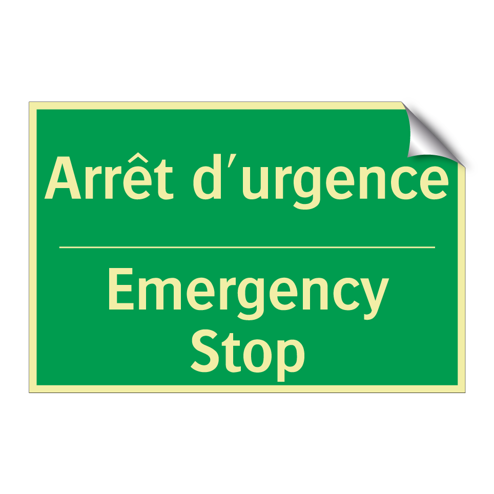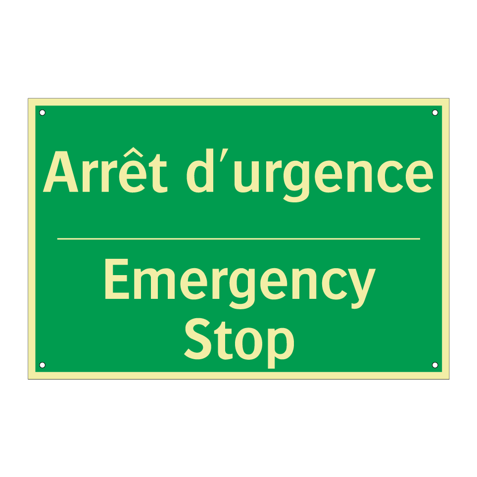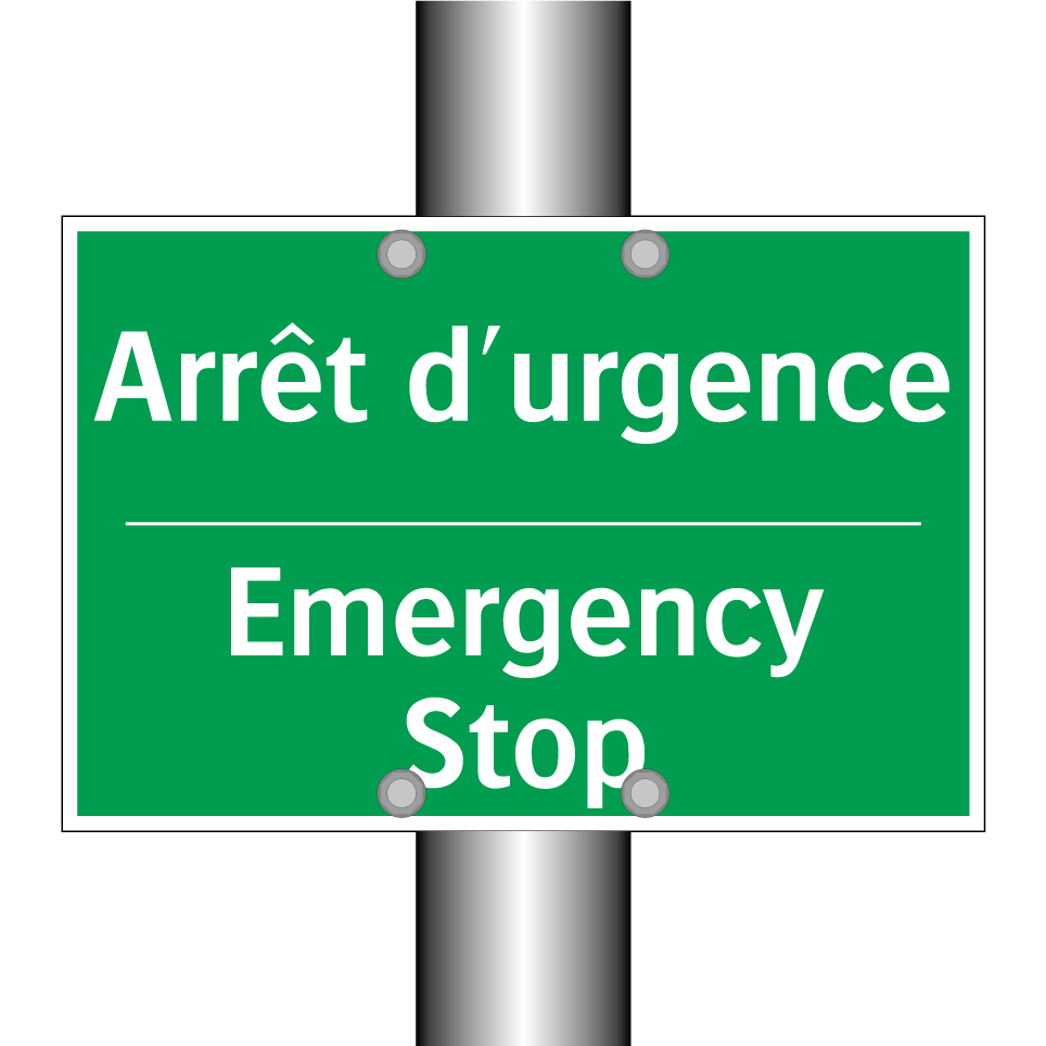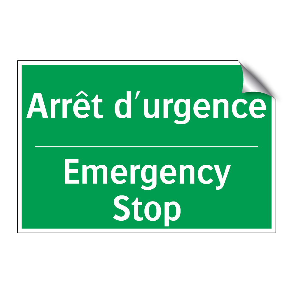 Panneau de secours bilingue avec texte en français : "Arrêt d'urgence", et en anglais : "Emergency Stop"