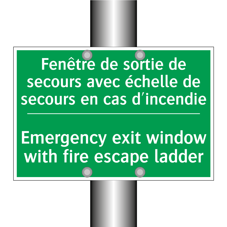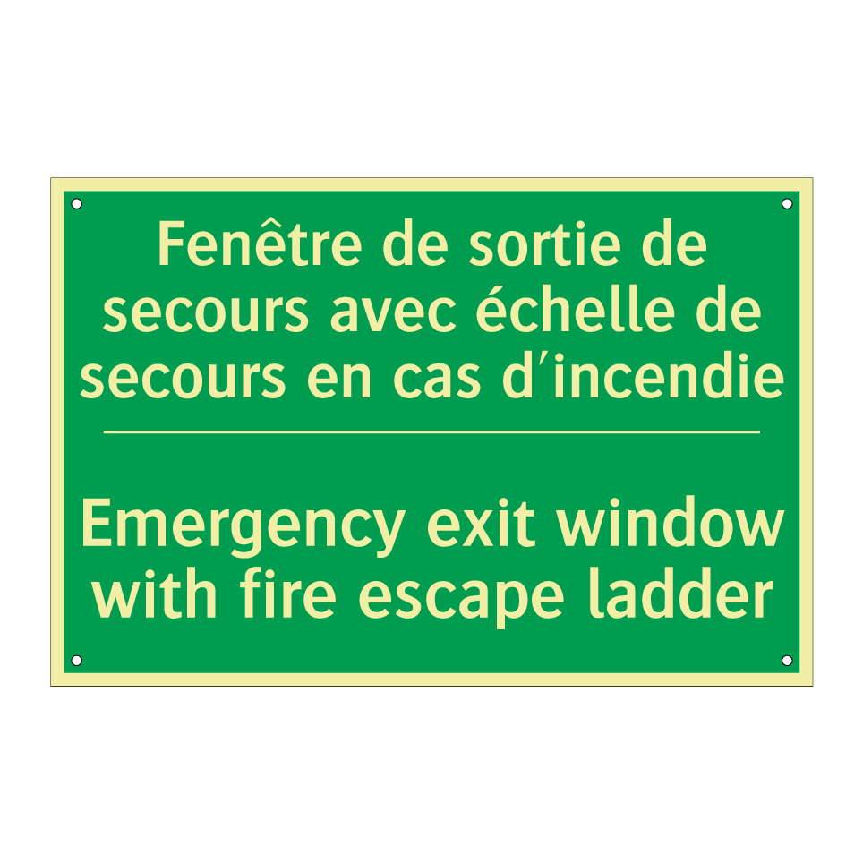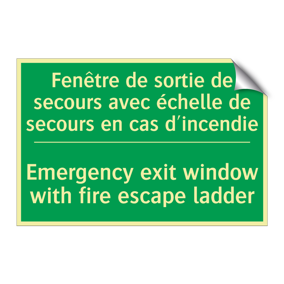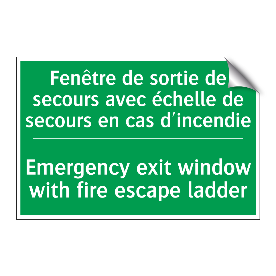 Panneau de secours bilingue avec texte en français : "Fenêtre de sortie de secours avec échelle de secours en cas d'incendie", et en anglais : "Emergency exit window with fire escape ladder"