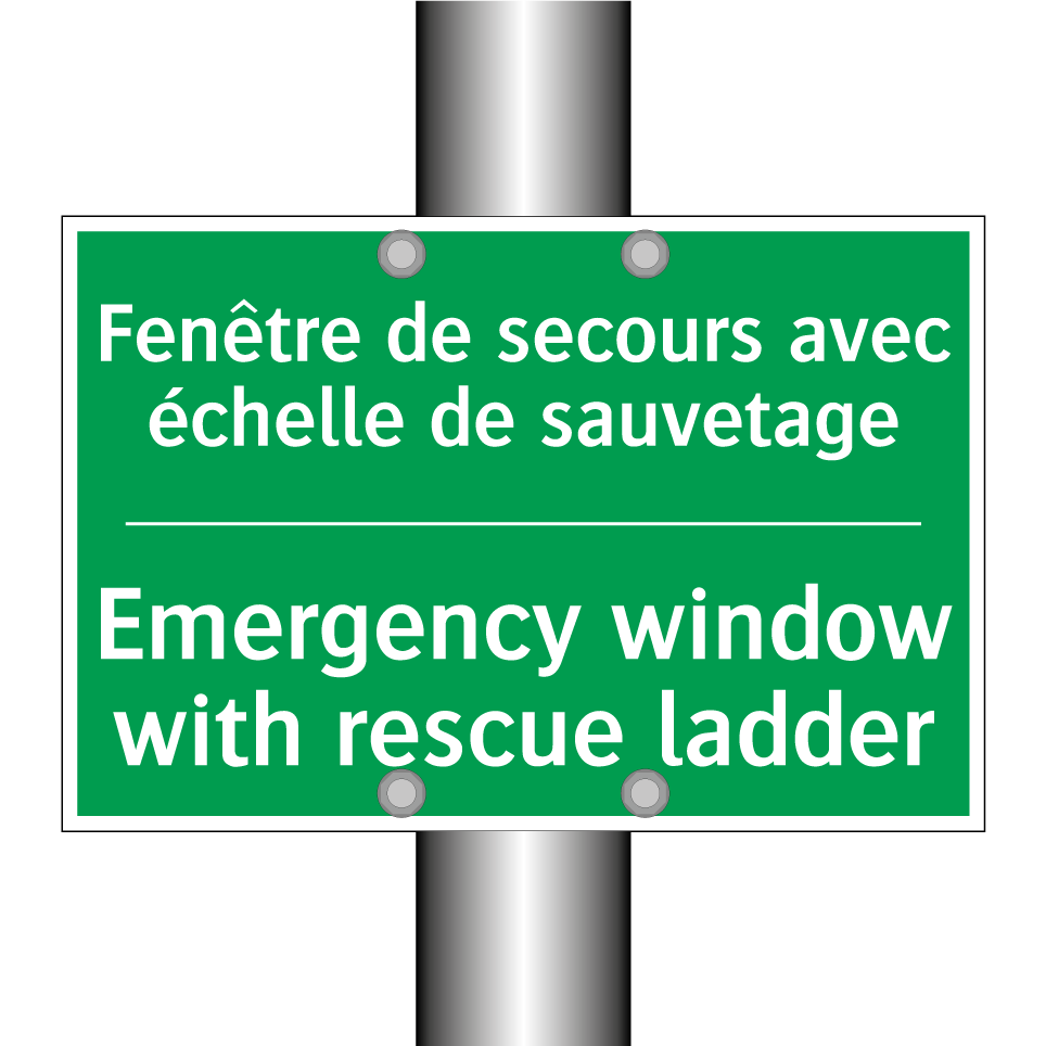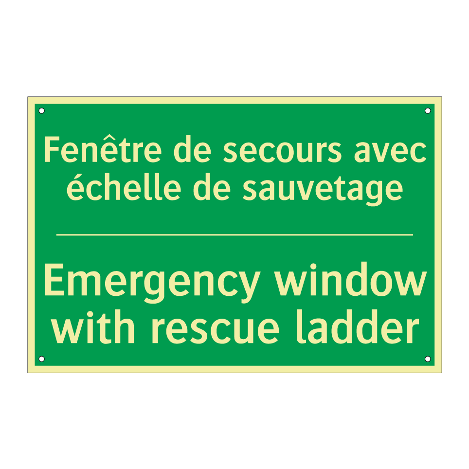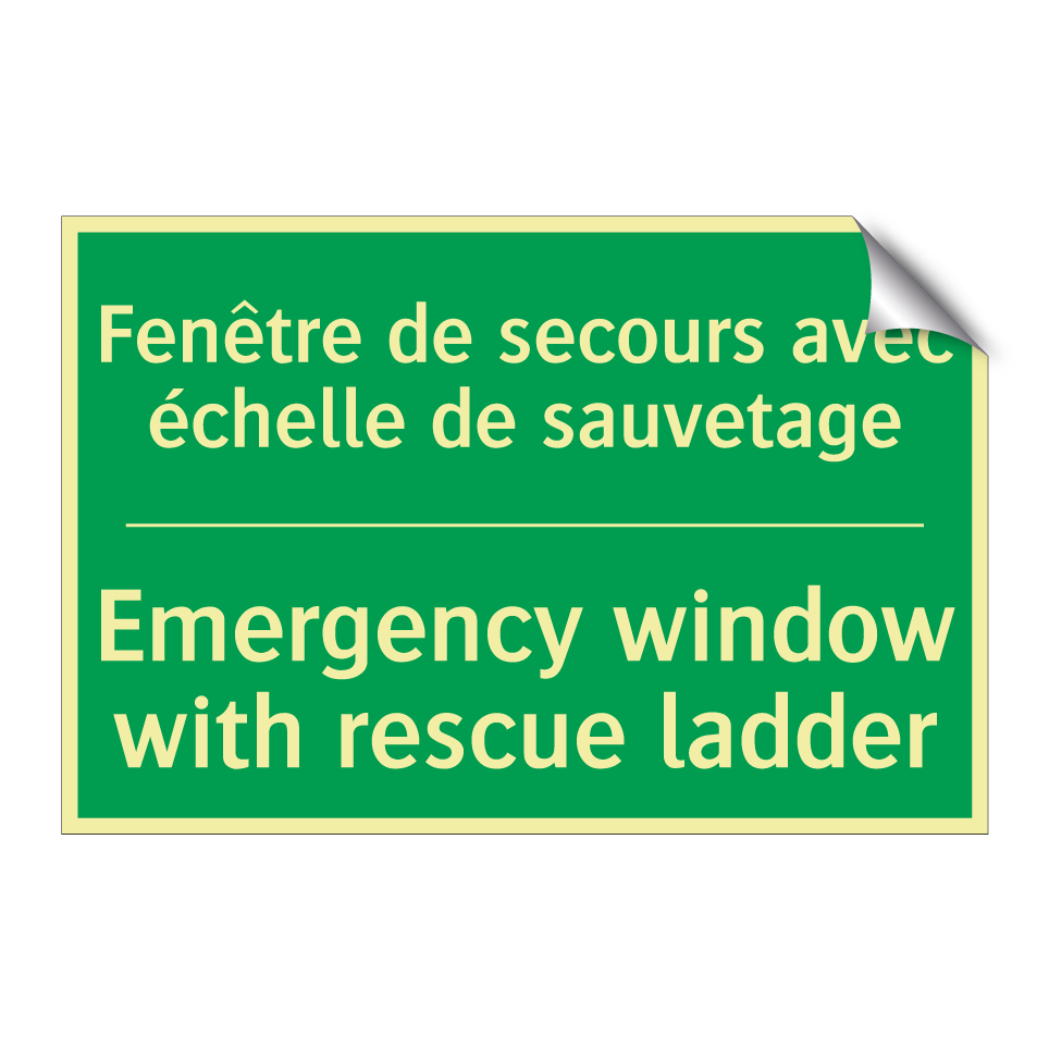 Panneau de secours bilingue avec texte en français : "Fenêtre de secours avec échelle de sauvetage", et en anglais : "Emergency window with rescue ladder"
