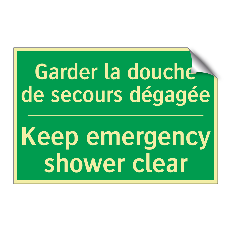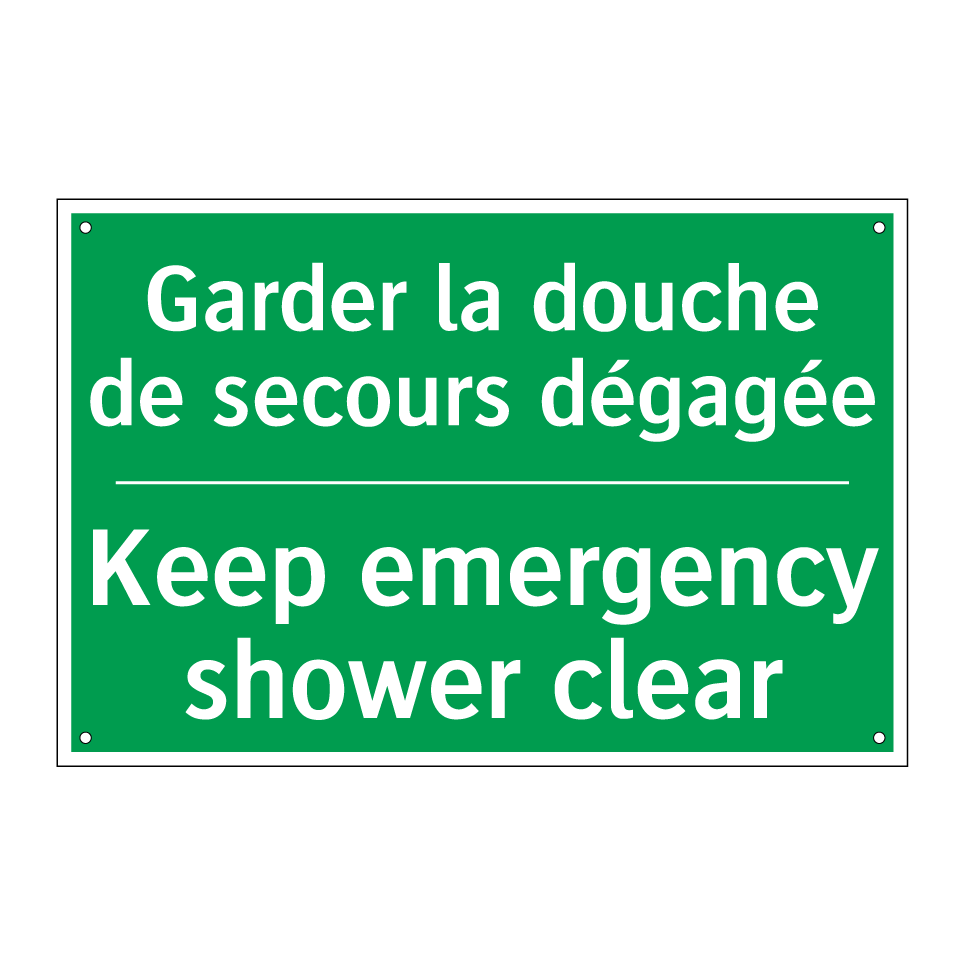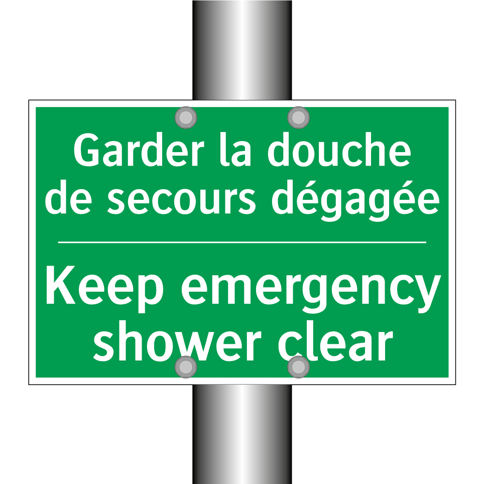 Panneau de secours bilingue avec texte en français : "Garder la douche de secours dégagée", et en anglais : "Keep emergency shower clear"