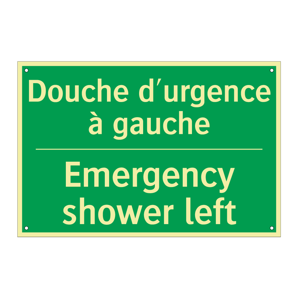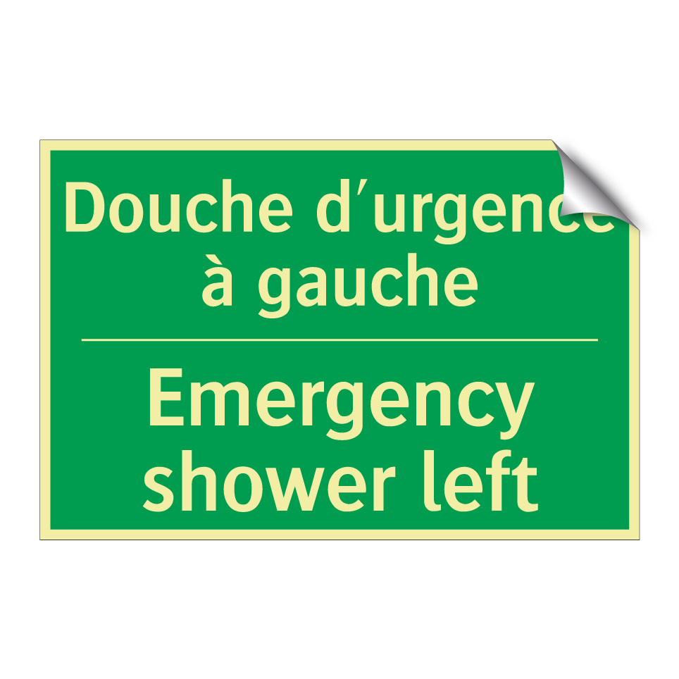 Panneau de secours bilingue avec texte en français : "Douche d'urgence à gauche", et en anglais : "Emergency shower left"