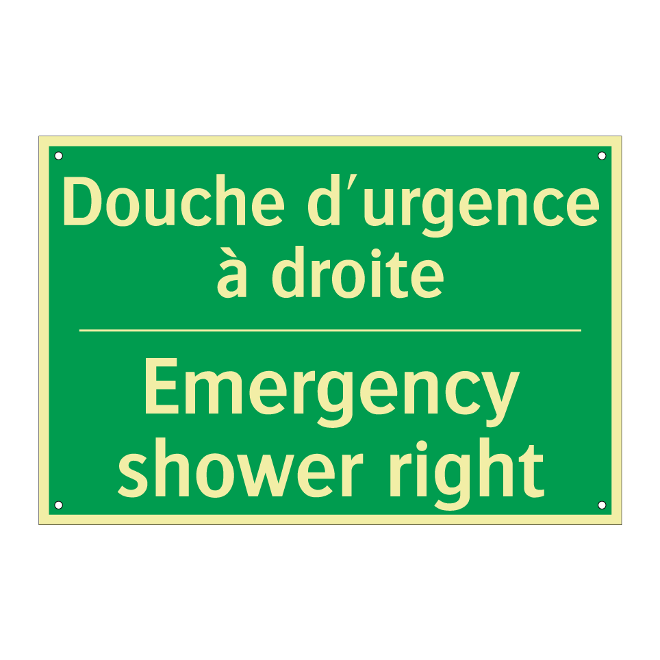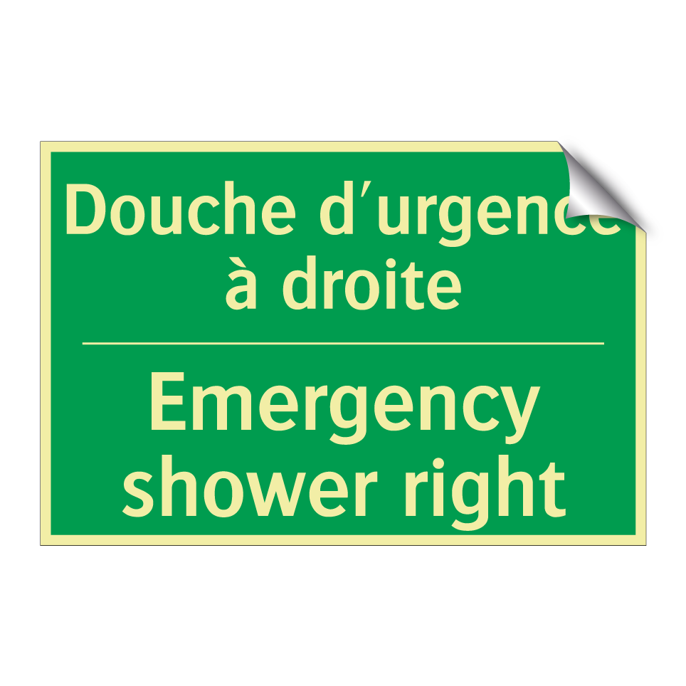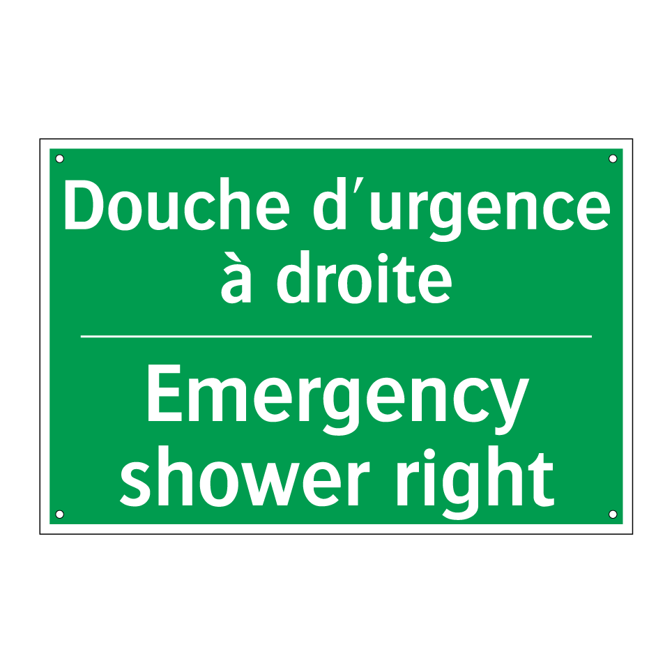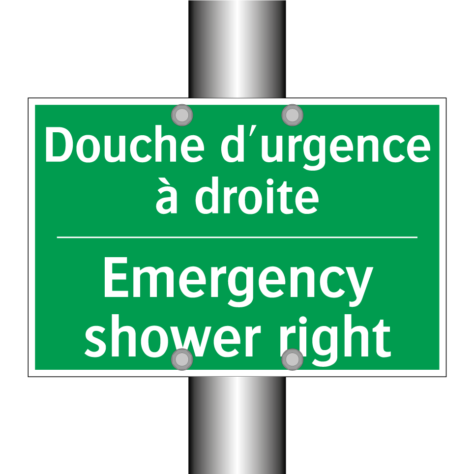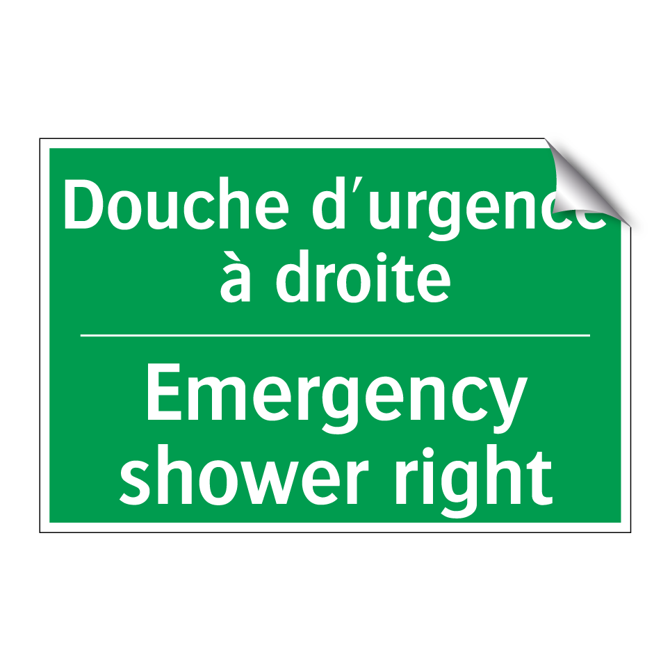 Panneau de secours bilingue avec texte en français : "Douche d'urgence à droite", et en anglais : "Emergency shower right"