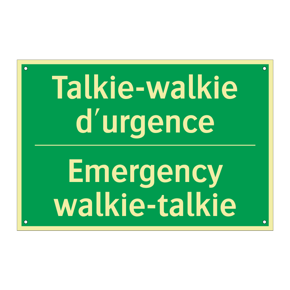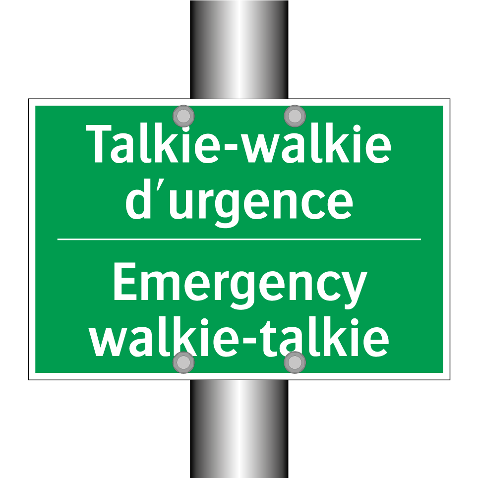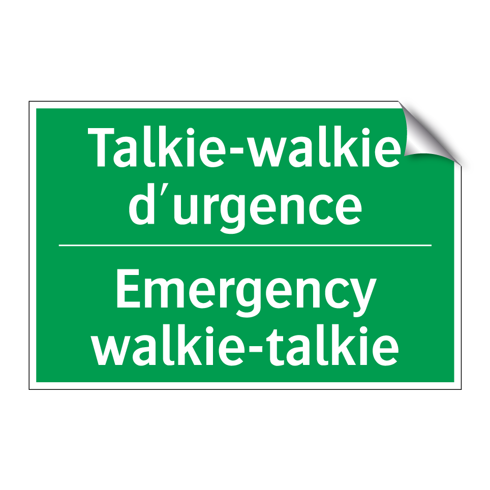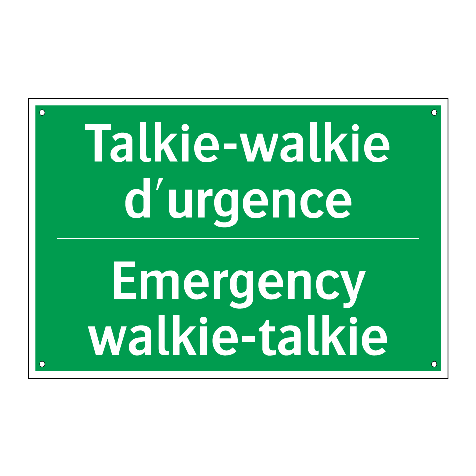 Panneau de secours bilingue avec texte en français : "Talkie-walkie d'urgence", et en anglais : "Emergency walkie-talkie"