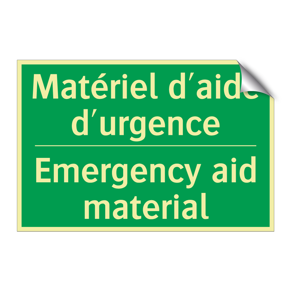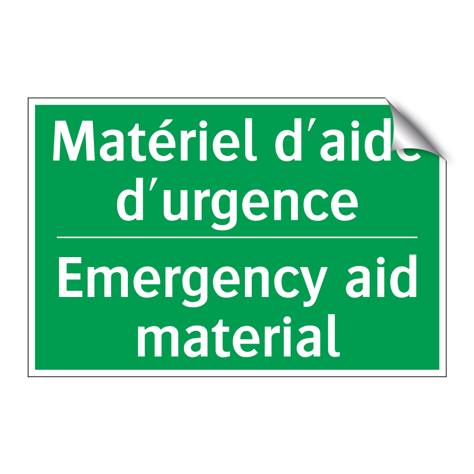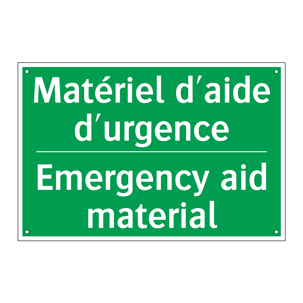 Panneau de secours bilingue avec texte en français : "Matériel d'aide d'urgence", et en anglais : "Emergency aid material"