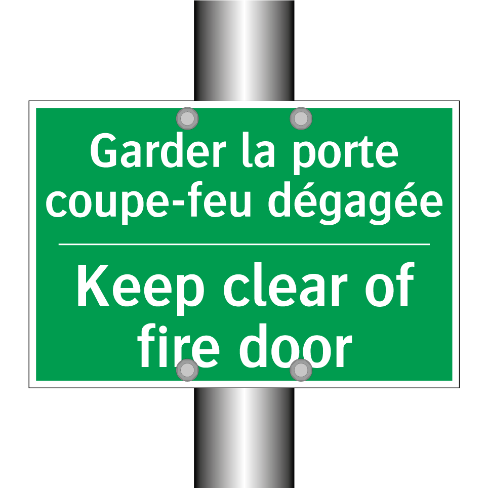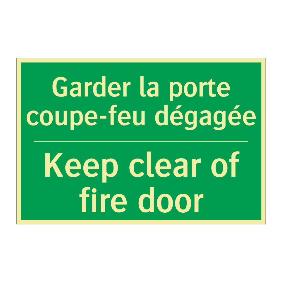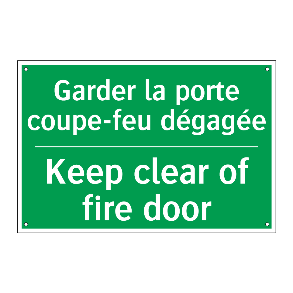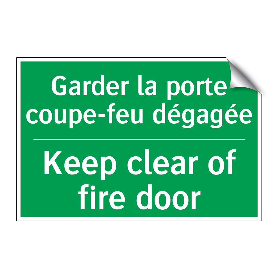 Panneau de secours bilingue avec texte en français : "Garder la porte coupe-feu dégagée", et en anglais : "Keep clear of fire door"