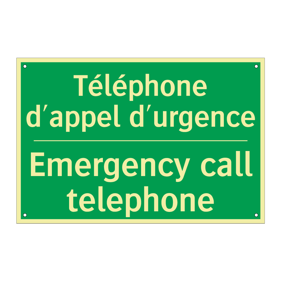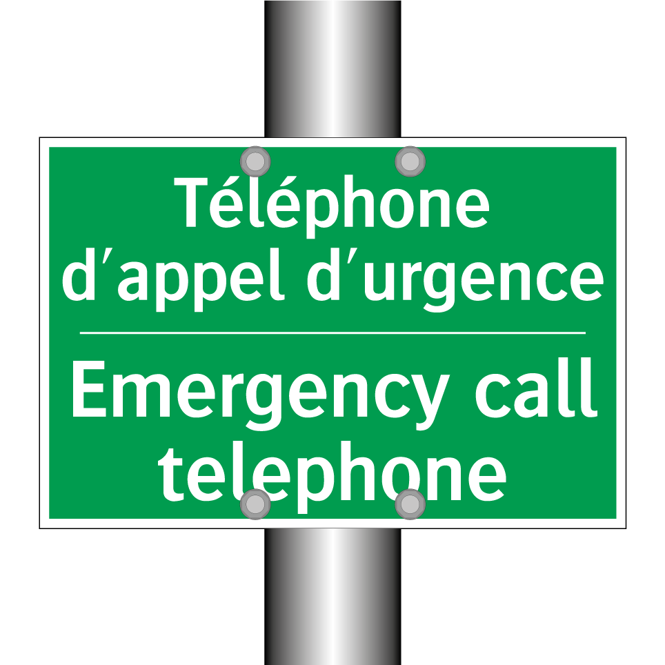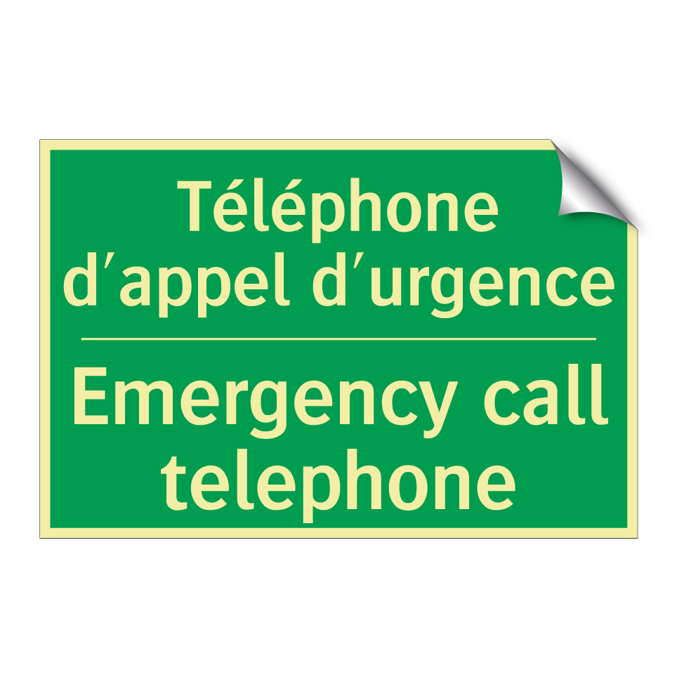 Panneau de secours bilingue avec texte en français : "Téléphone d'appel d'urgence", et en anglais : "Emergency call telephone"