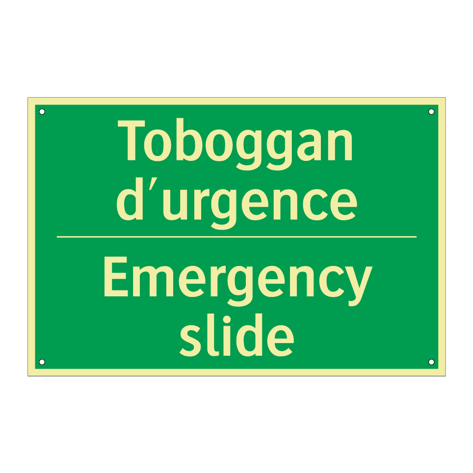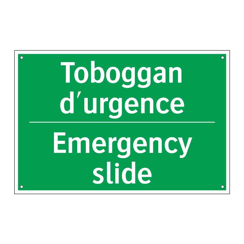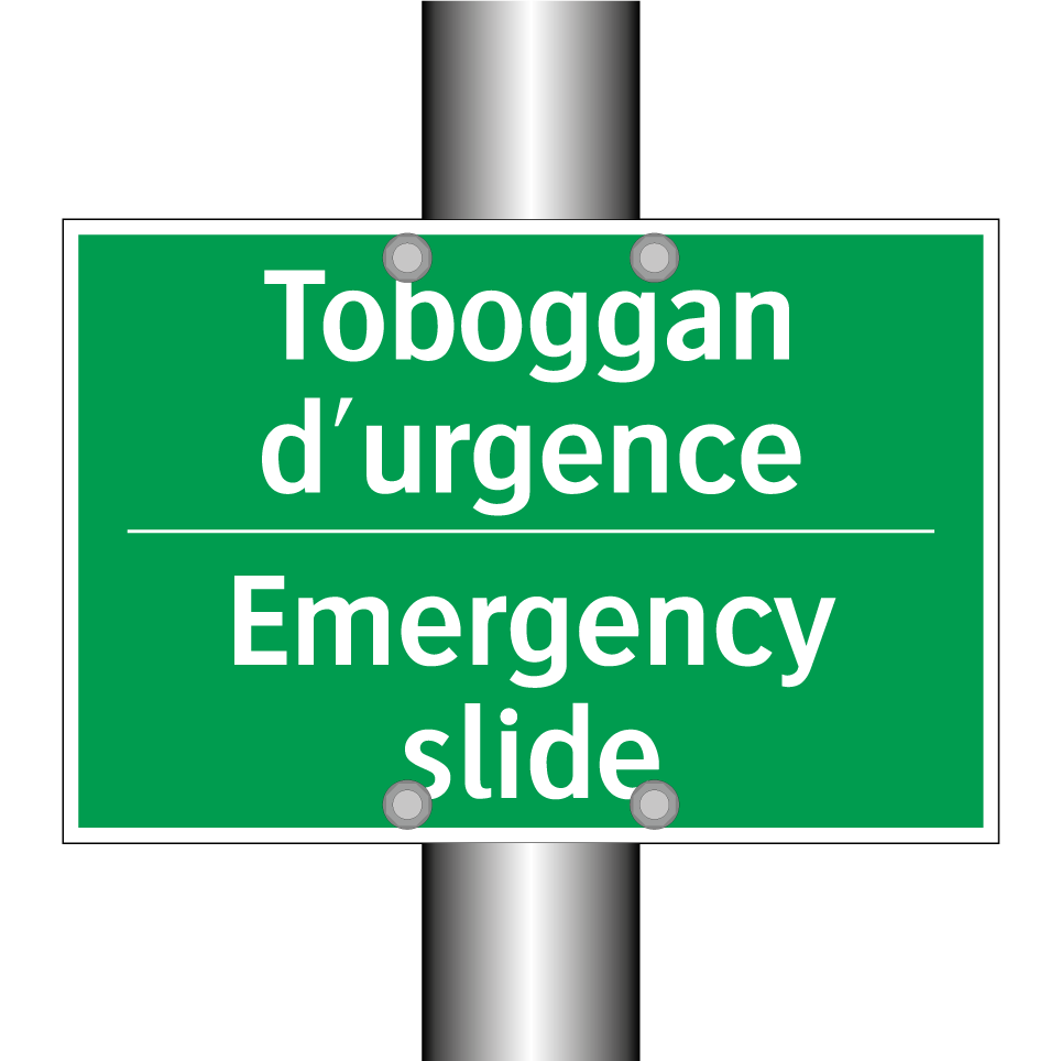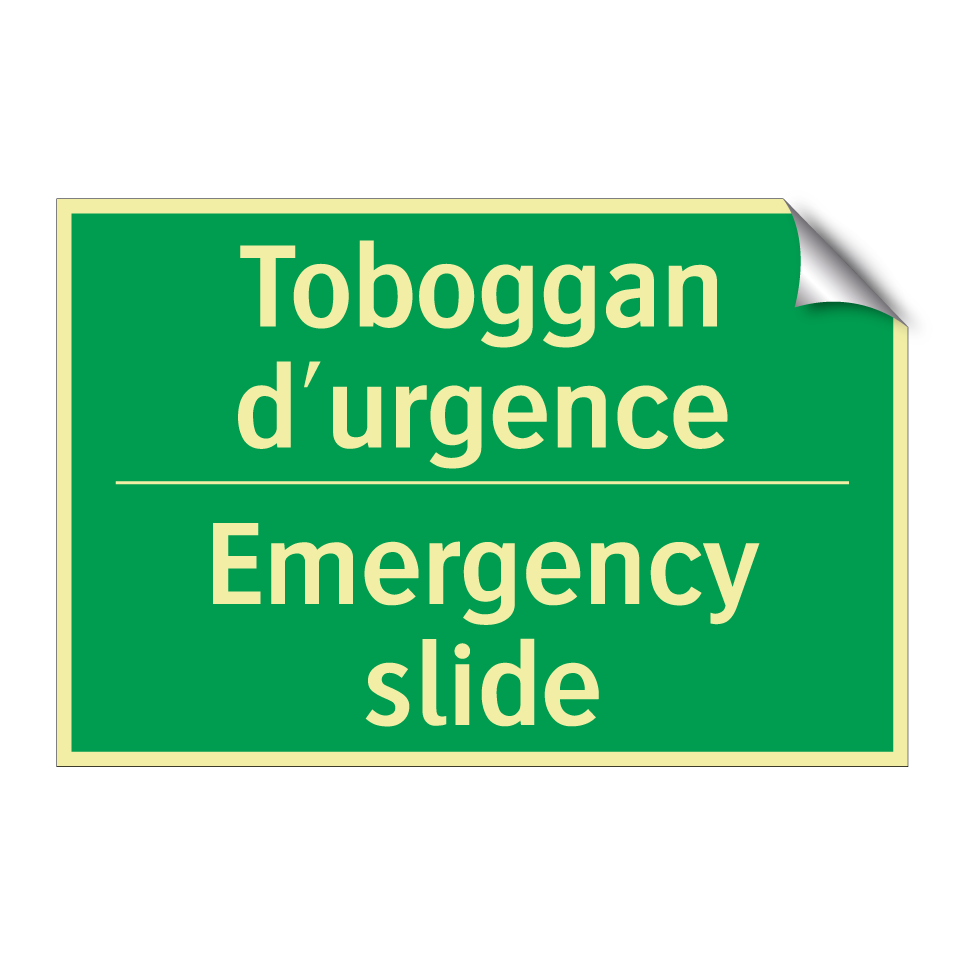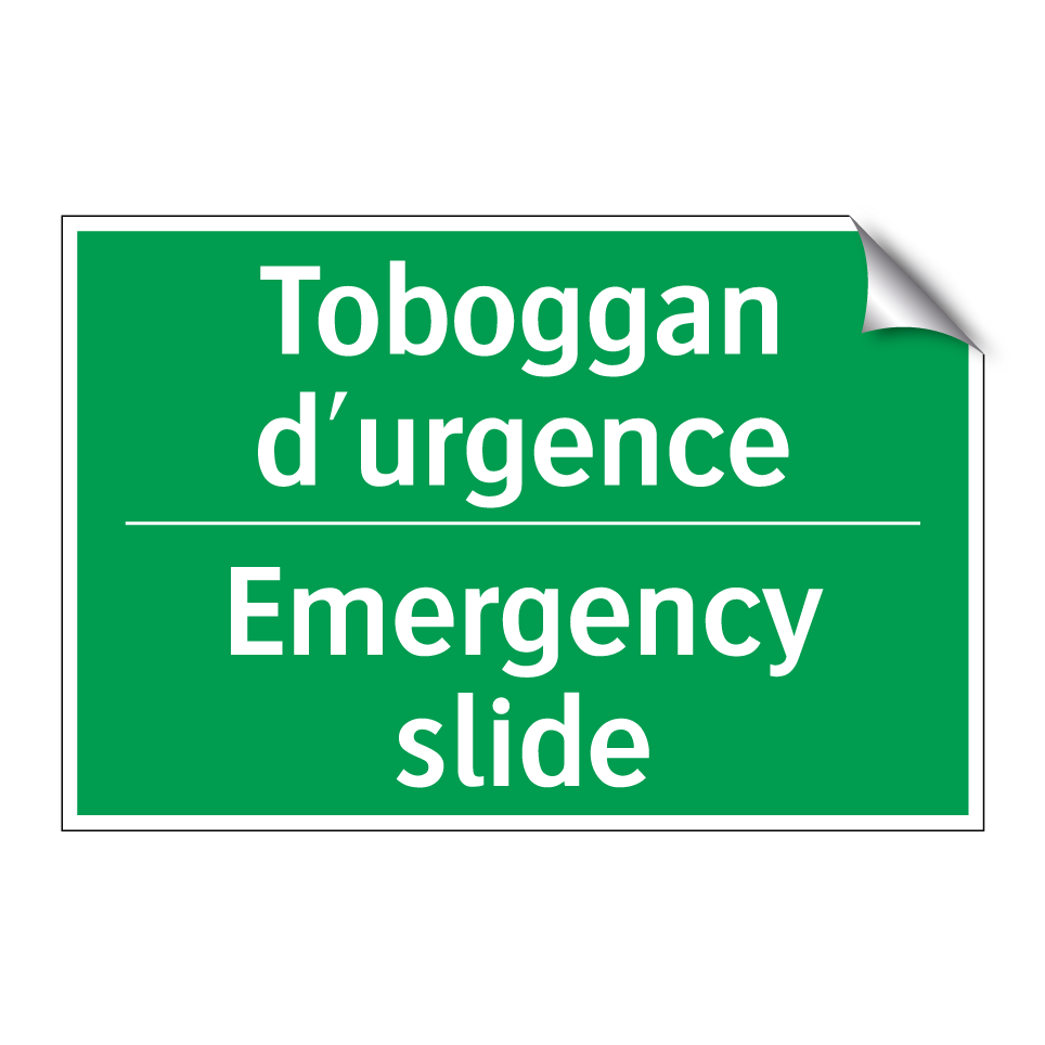 Panneau de secours bilingue avec texte en français : "Toboggan d'urgence", et en anglais : "Emergency slide"