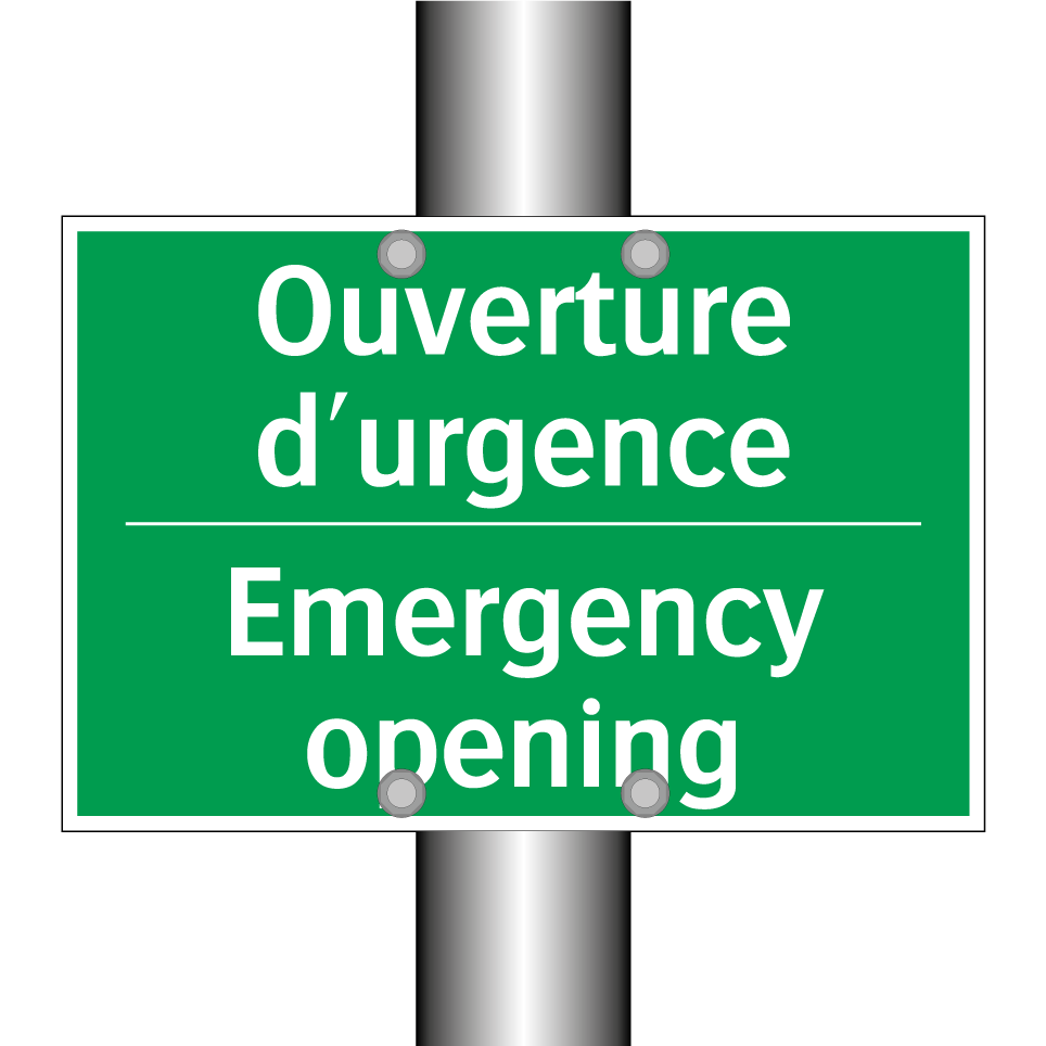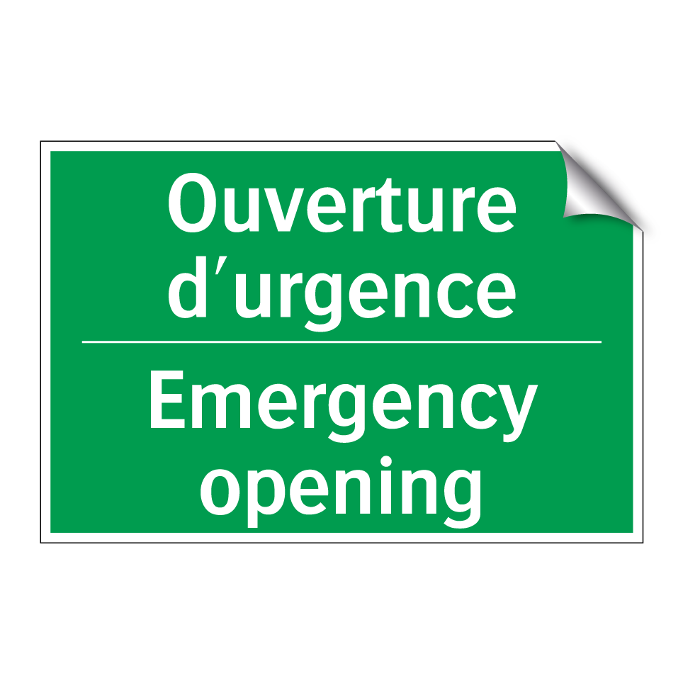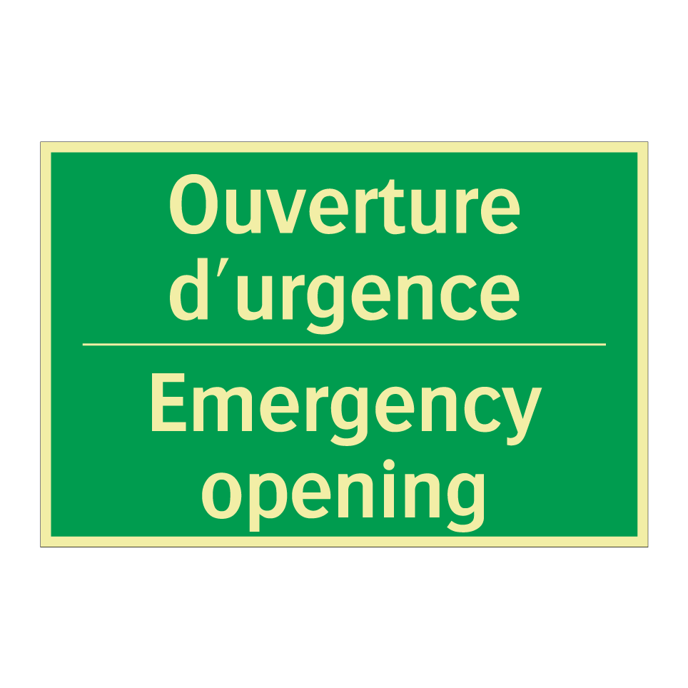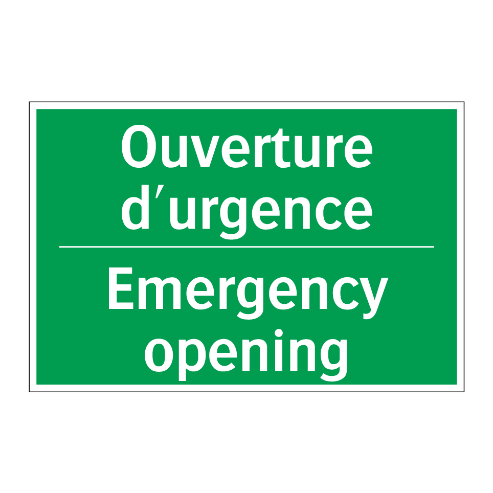 Panneau de secours bilingue avec texte en français : "Ouverture d'urgence", et en anglais : "Emergency opening"