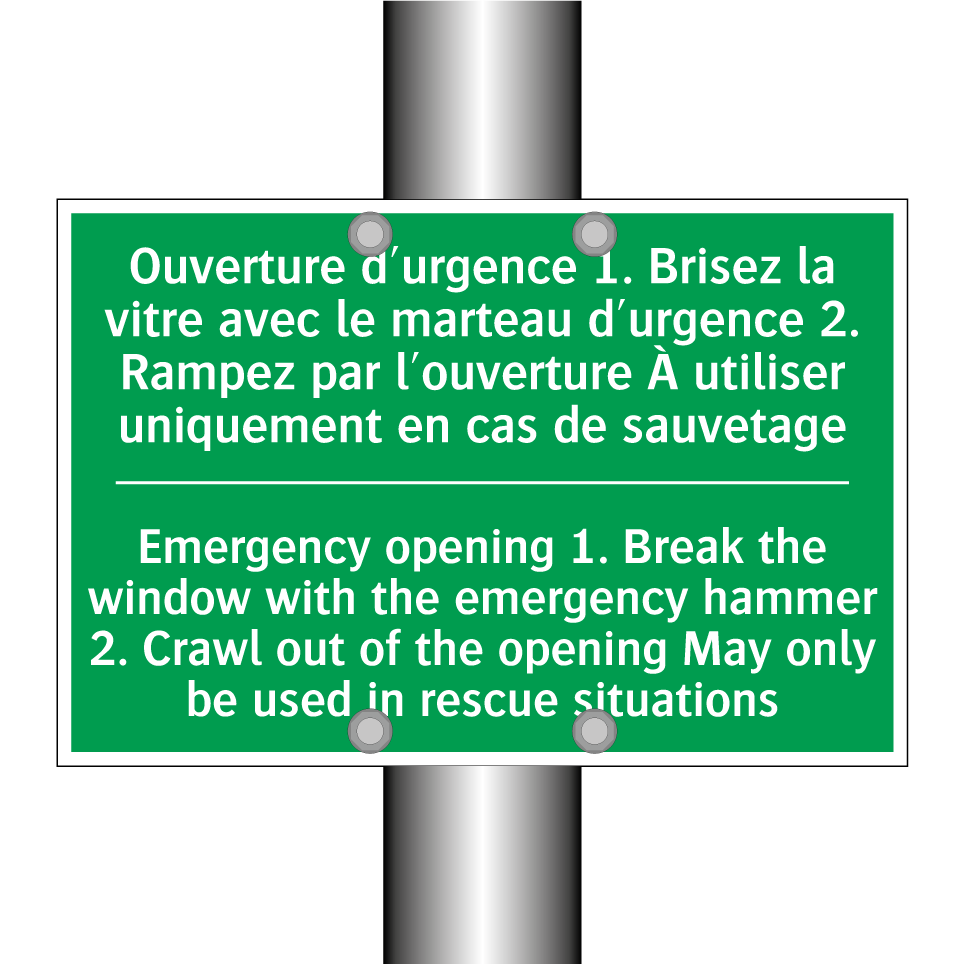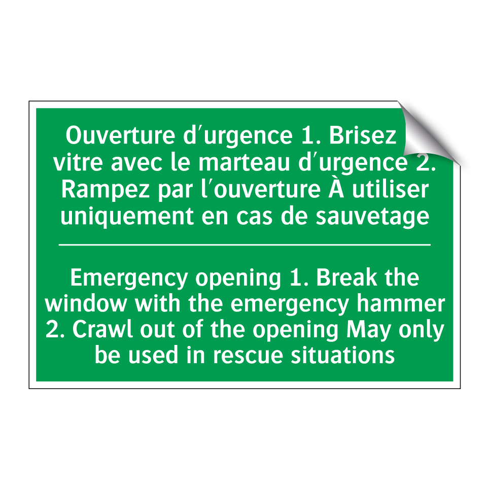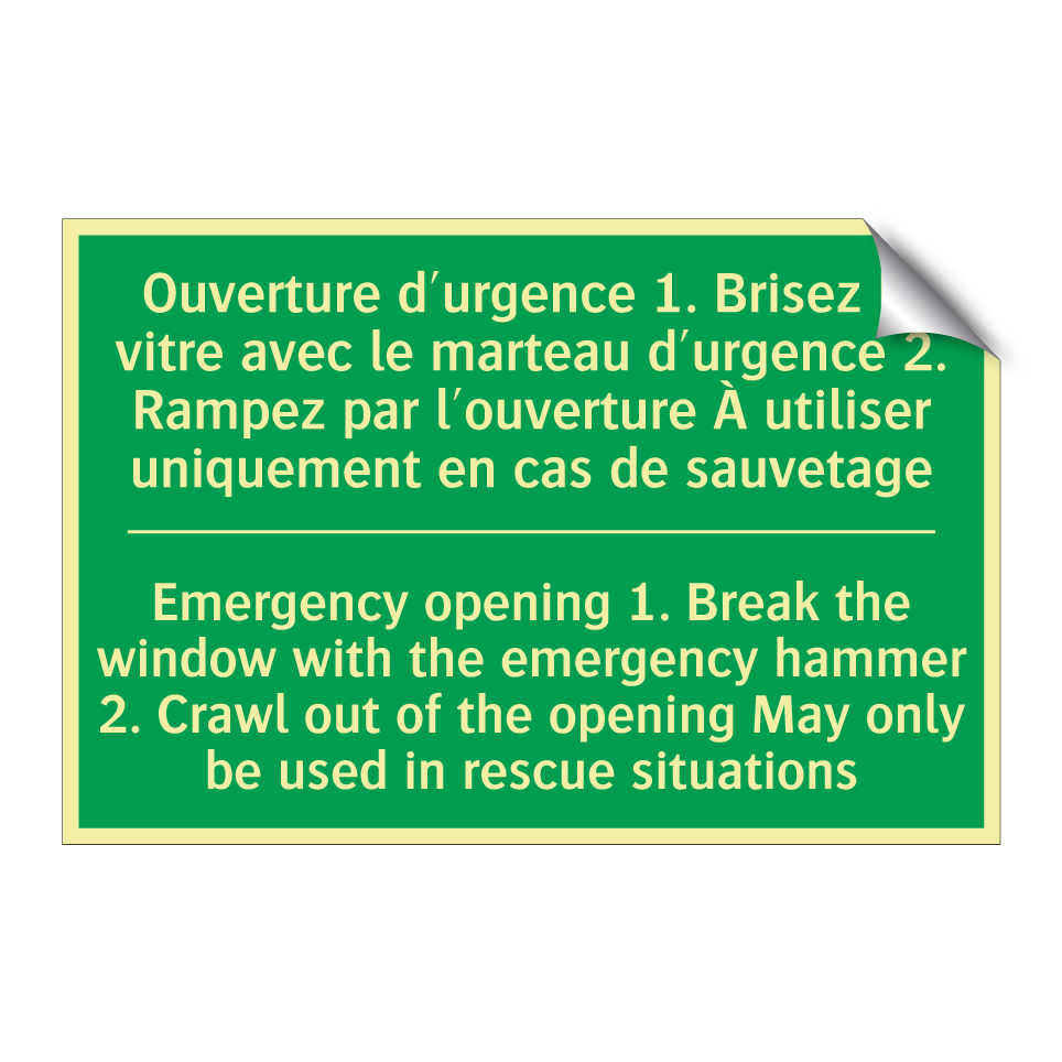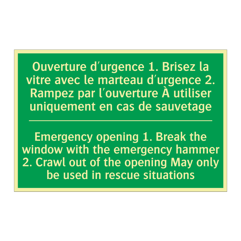 Panneau de secours bilingue avec texte en français : "Ouverture d'urgence 1. Brisez la vitre avec le marteau d'urgence 2. Rampez par l'ouverture À utiliser uniquement en cas de sauvetage", et en anglais : "Emergency opening 1. Break the window with the emergency hammer 2. Crawl out of the opening May only be used in rescue situations"