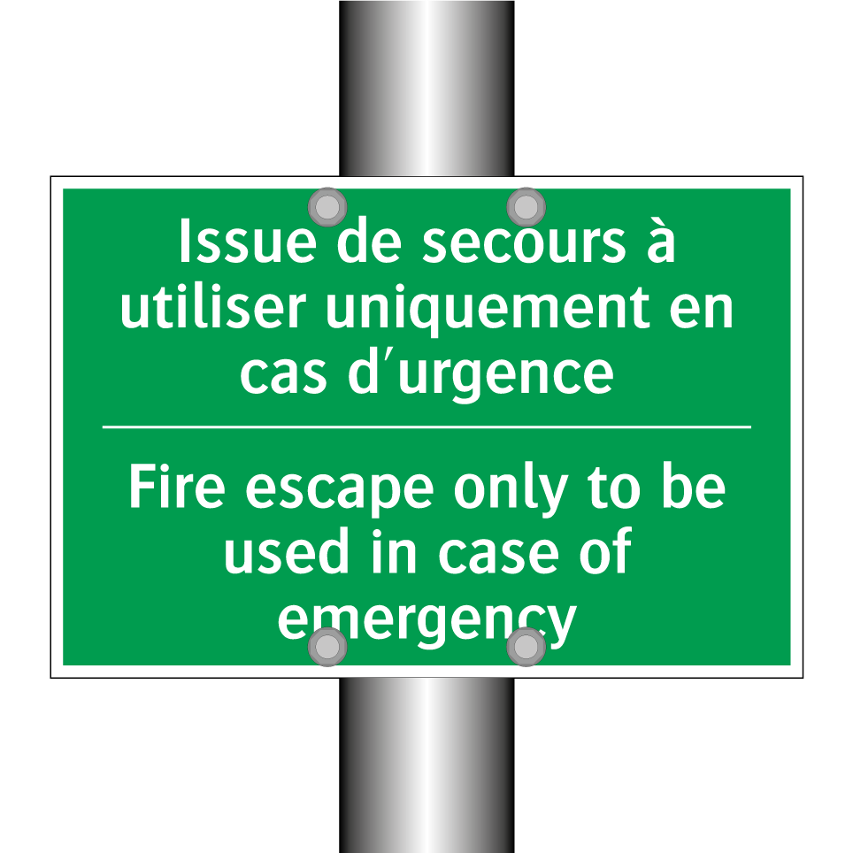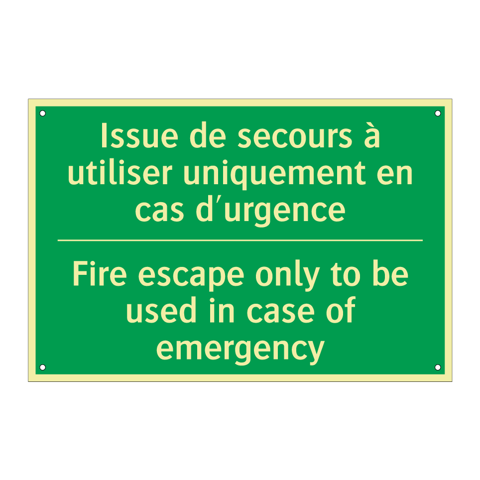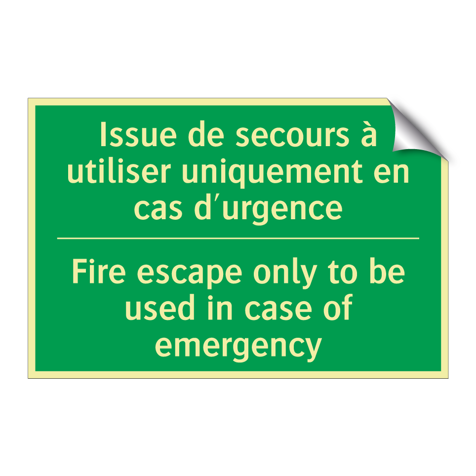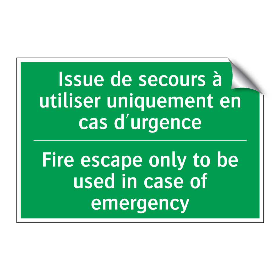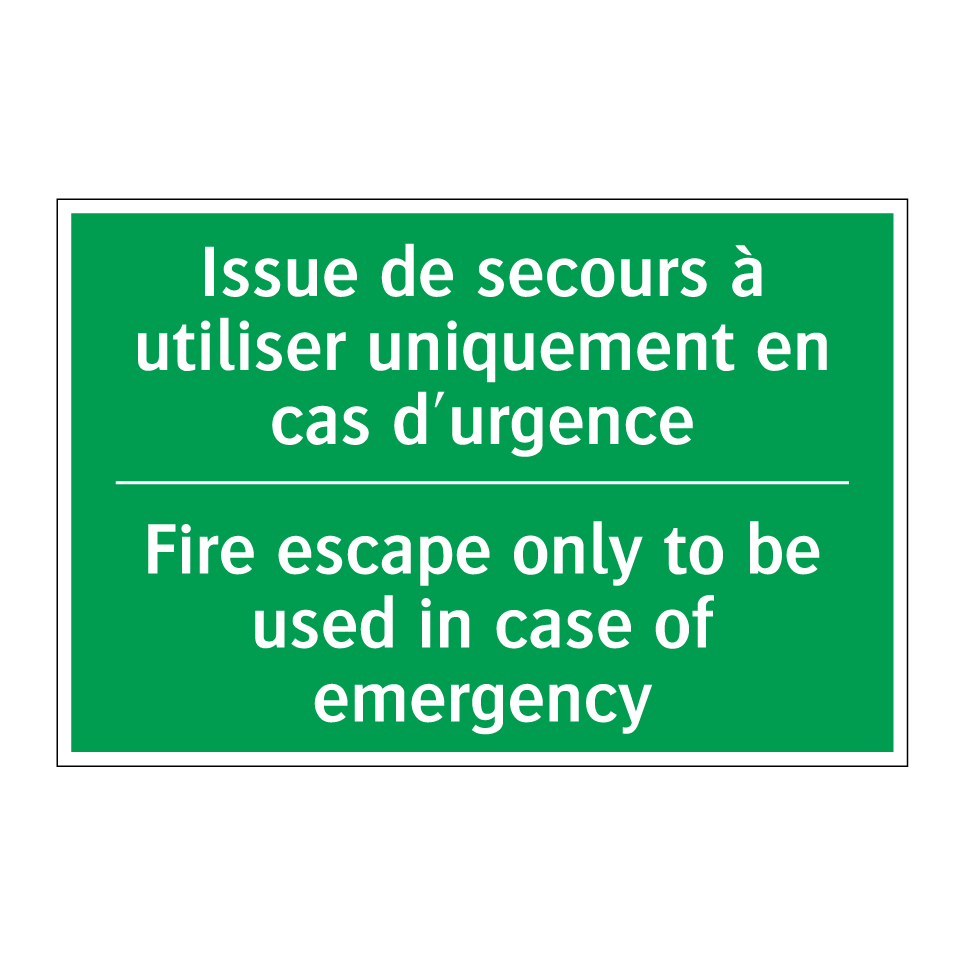 Panneau de secours bilingue avec texte en français : "Issue de secours à utiliser uniquement en cas d'urgence", et en anglais : "Fire escape only to be used in case of emergency"