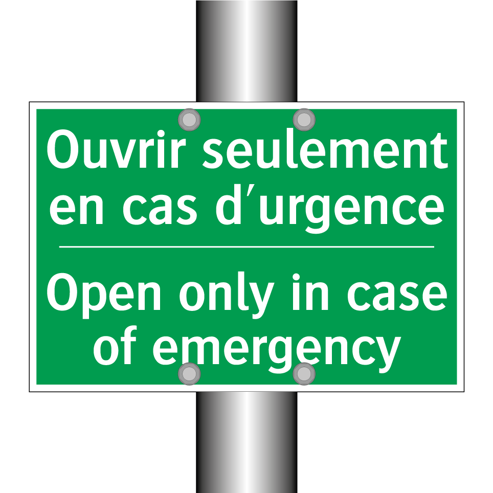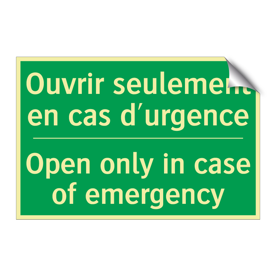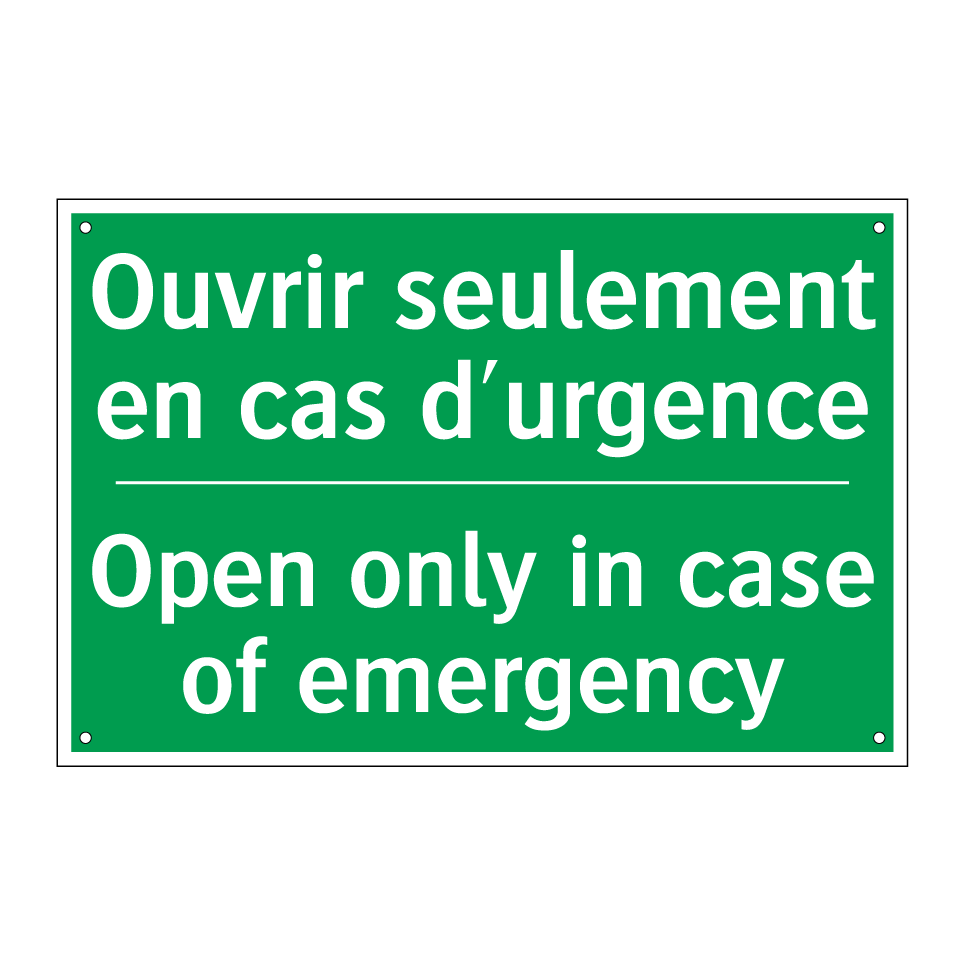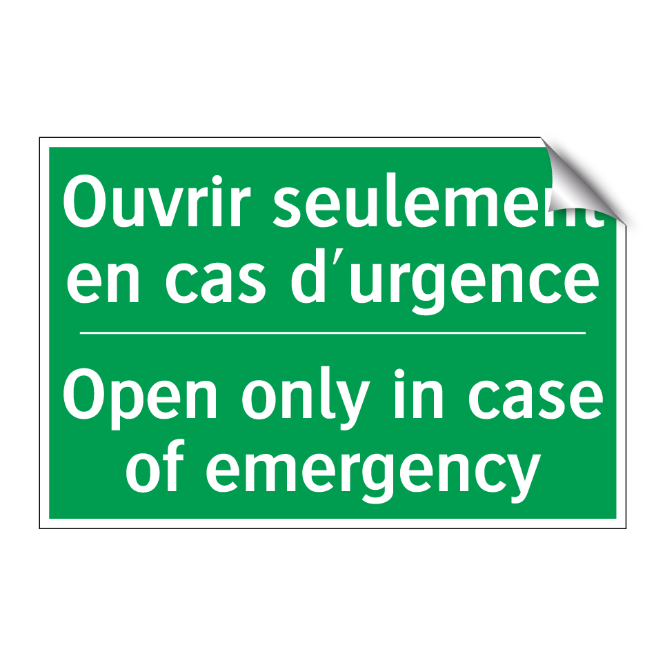 Panneau de secours bilingue avec texte en français : "Ouvrir seulement en cas d'urgence", et en anglais : "Open only in case of emergency"