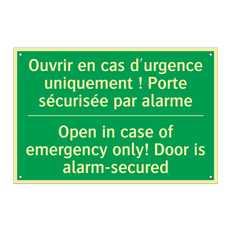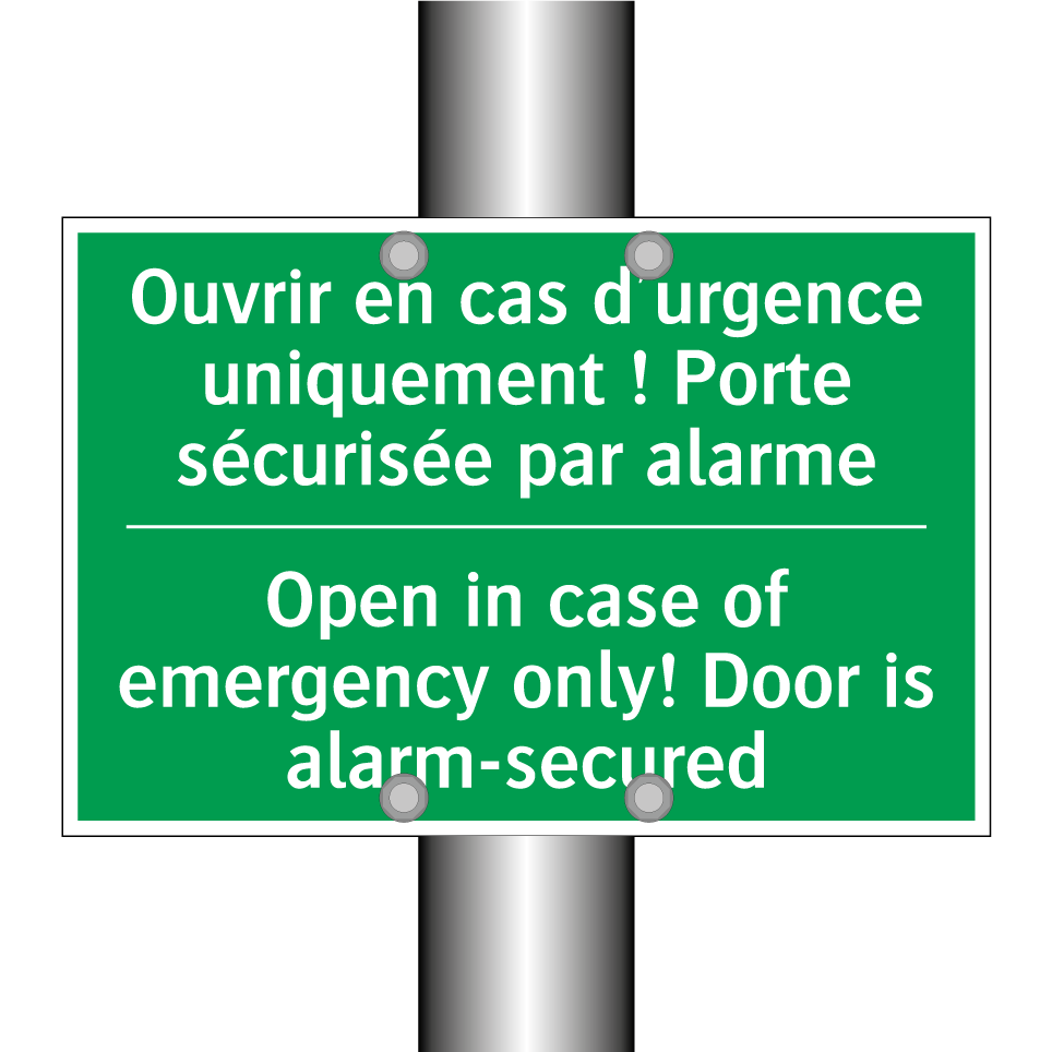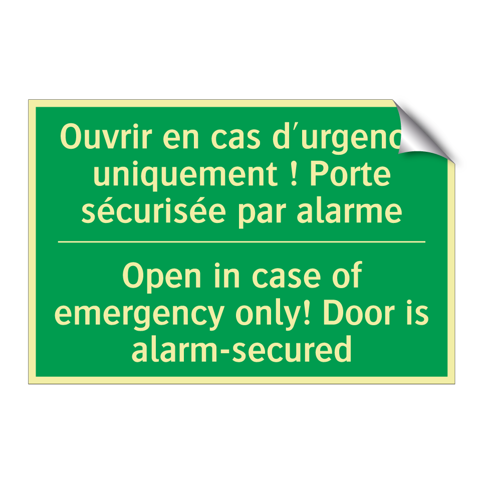 Panneau de secours bilingue avec texte en français : "Ouvrir en cas d'urgence uniquement ! Porte sécurisée par alarme", et en anglais : "Open in case of emergency only! Door is alarm-secured"