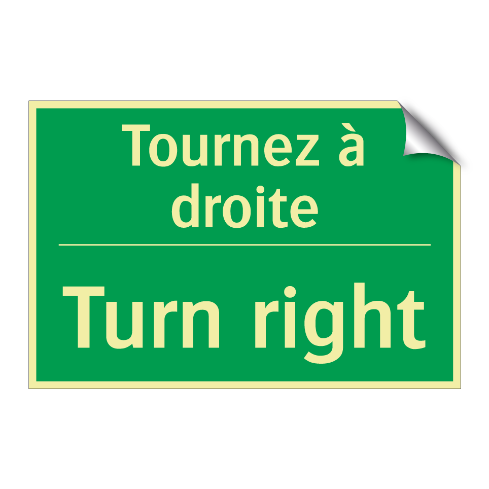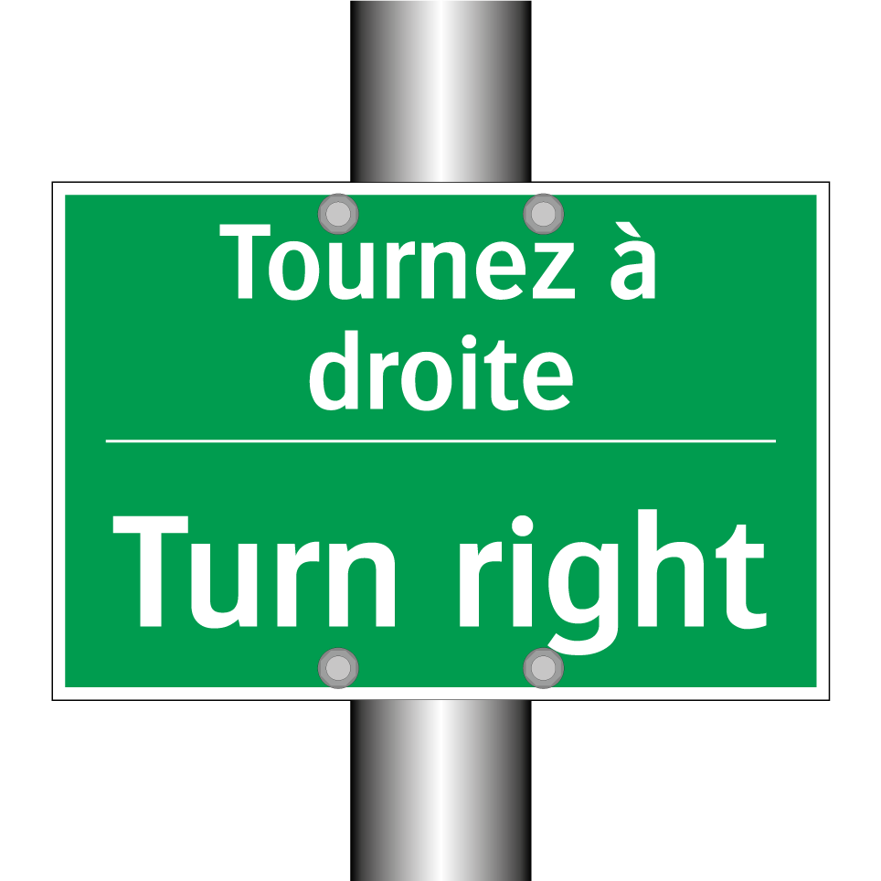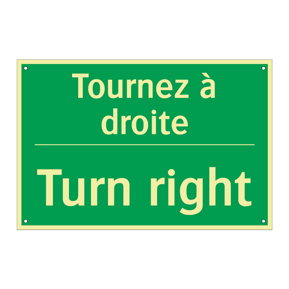 Panneau de secours bilingue avec texte en français : "Tournez à droite", et en anglais : "Turn right"
