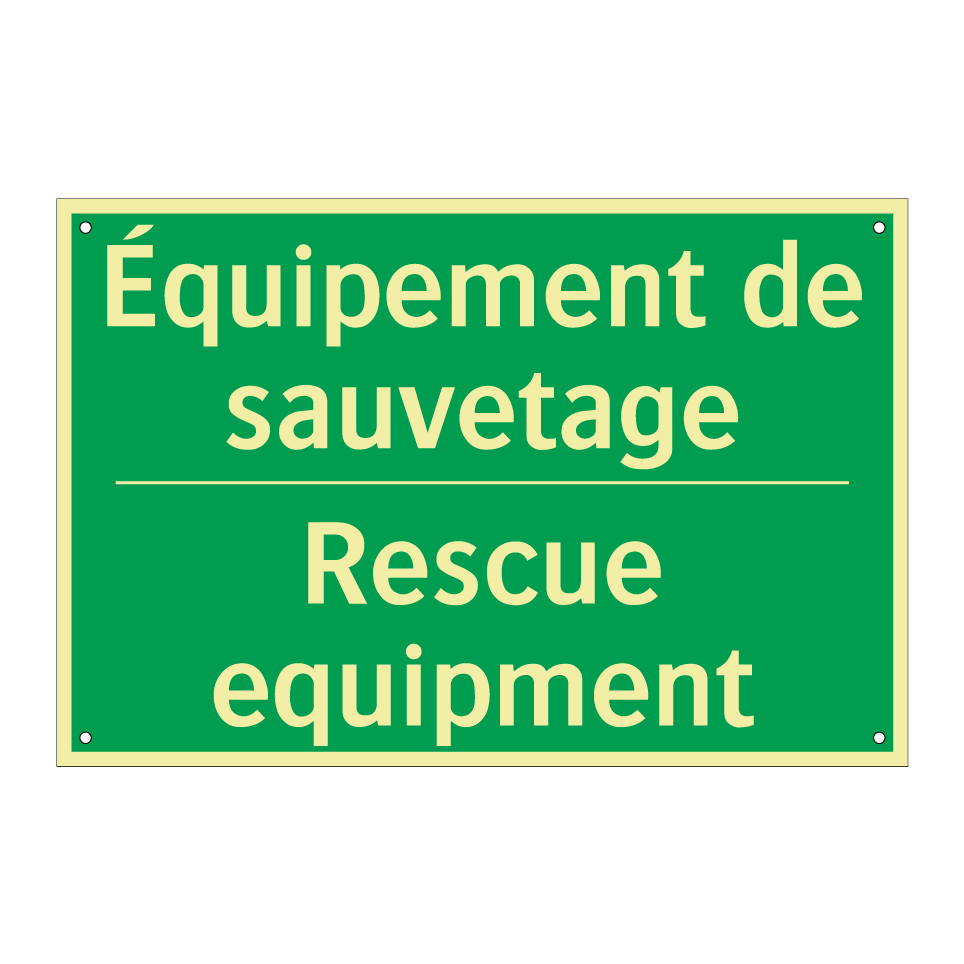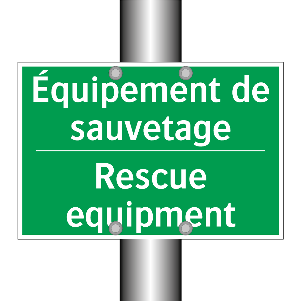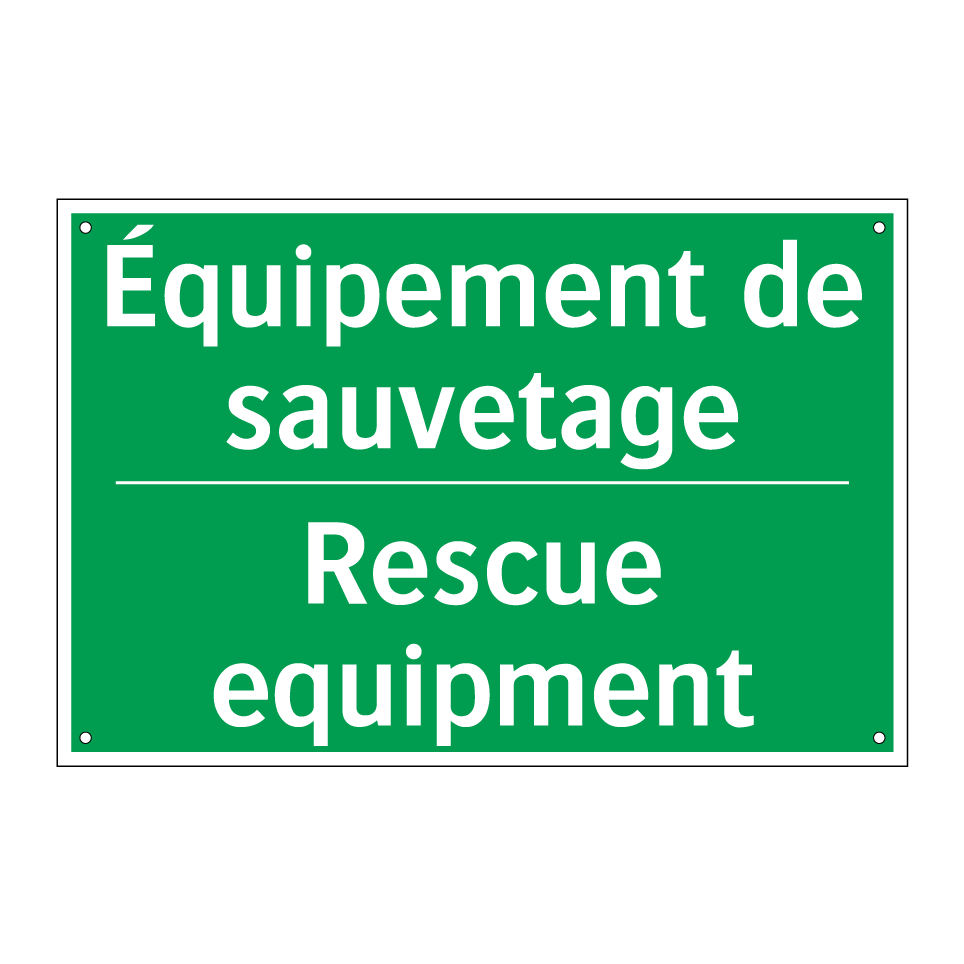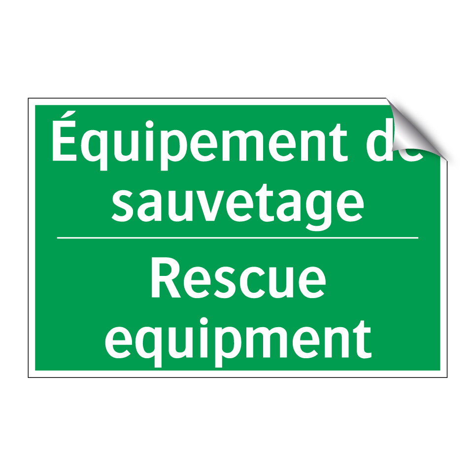 Panneau de secours bilingue avec texte en français : "Équipement de sauvetage", et en anglais : "Rescue equipment"
