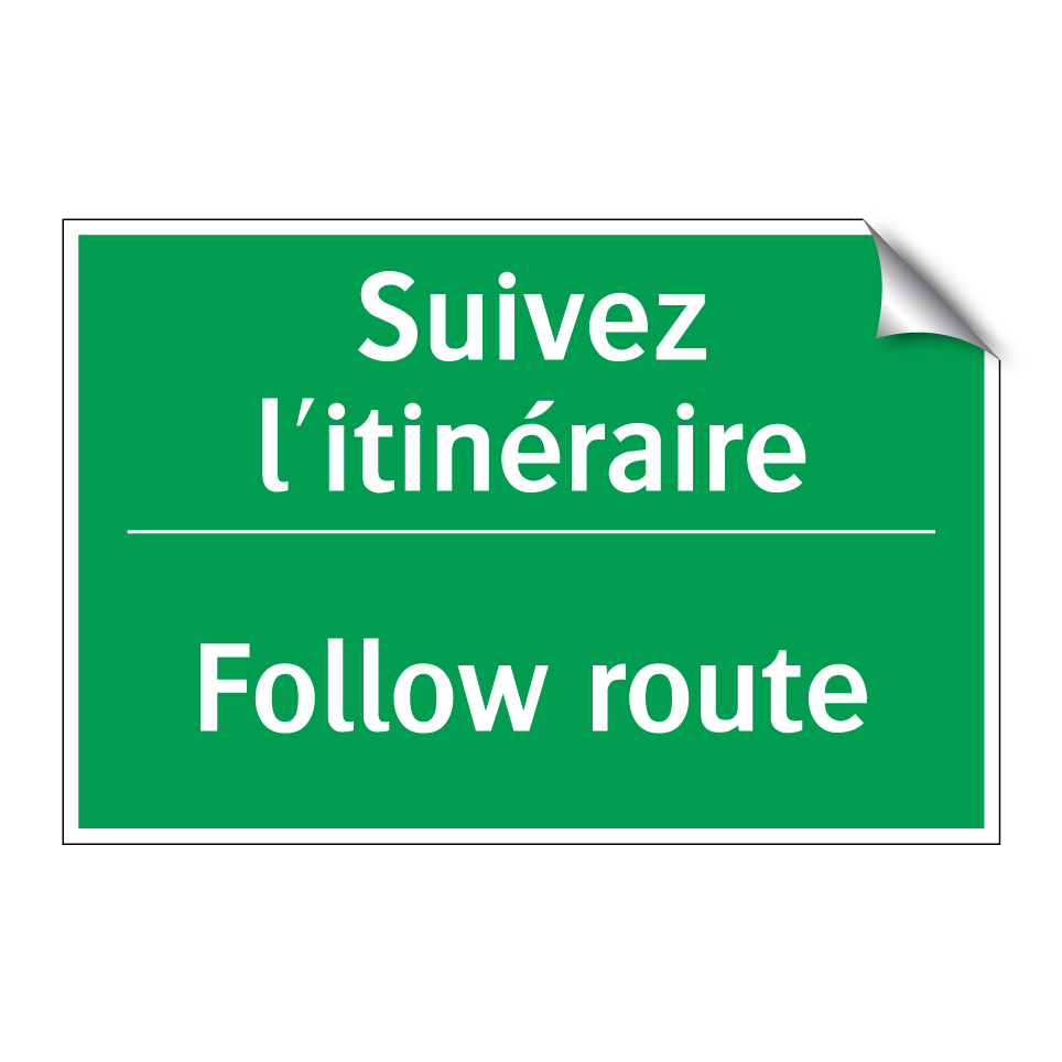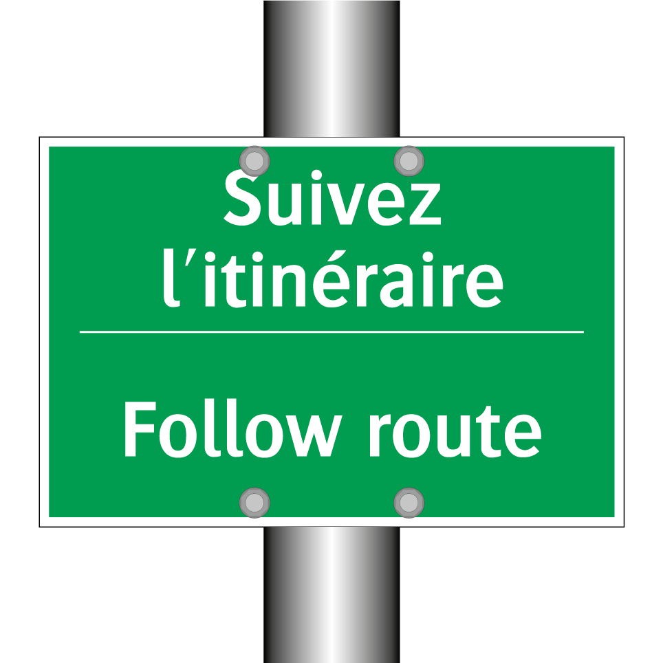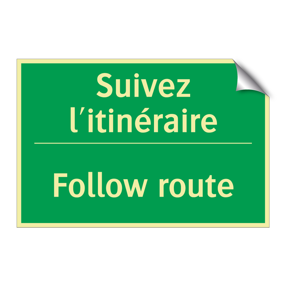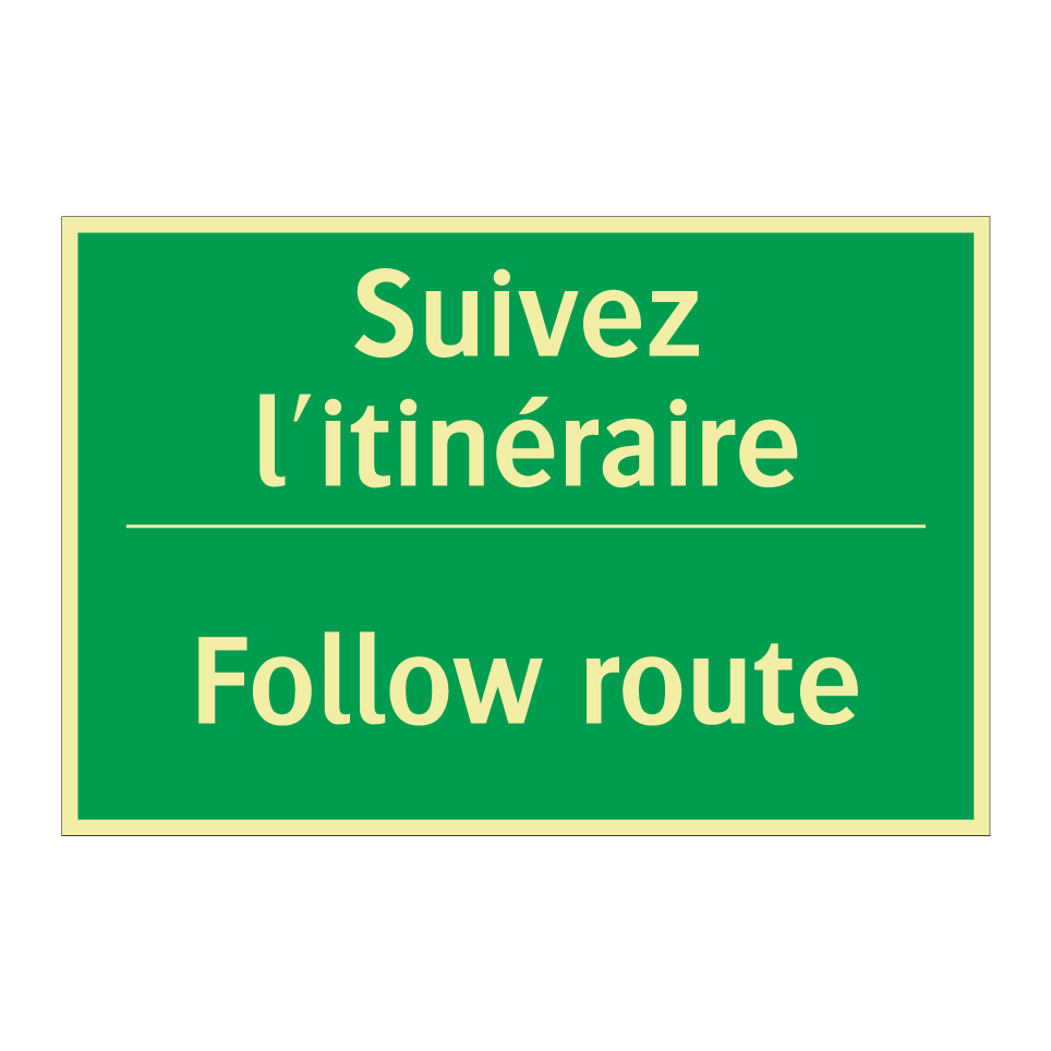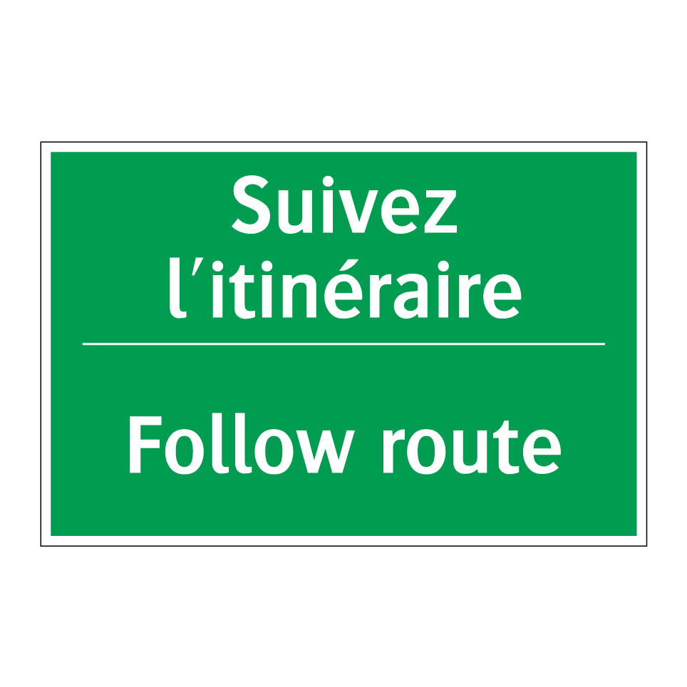Panneau de secours bilingue avec texte en français : "Suivez l'itinéraire", et en anglais : "Follow route"
