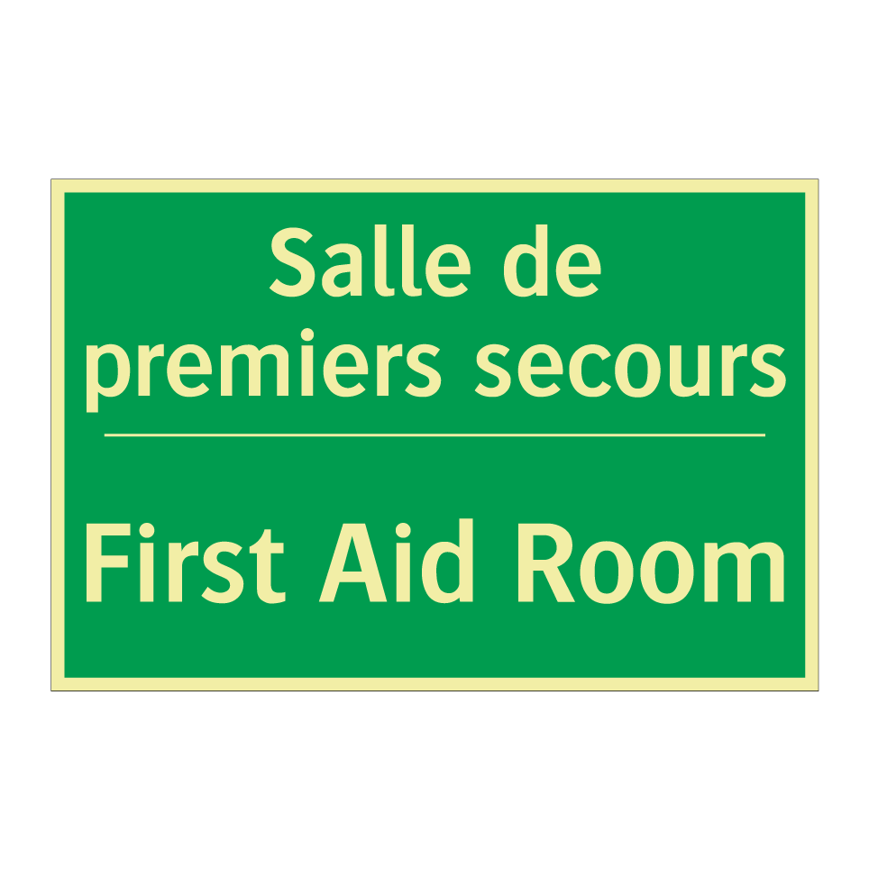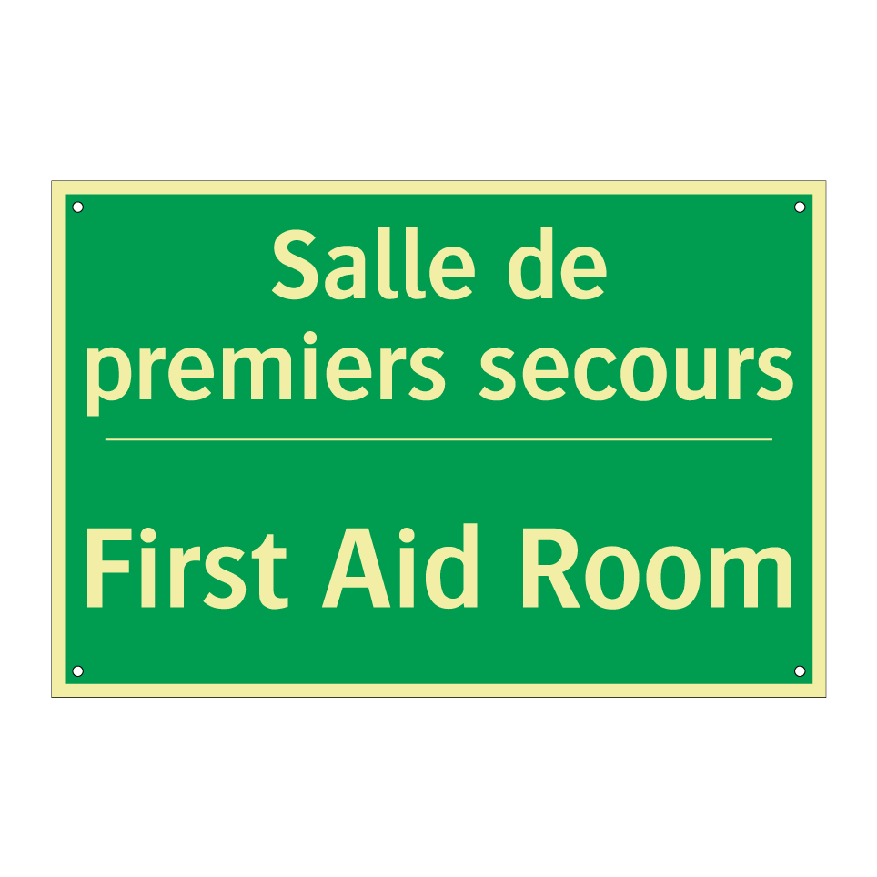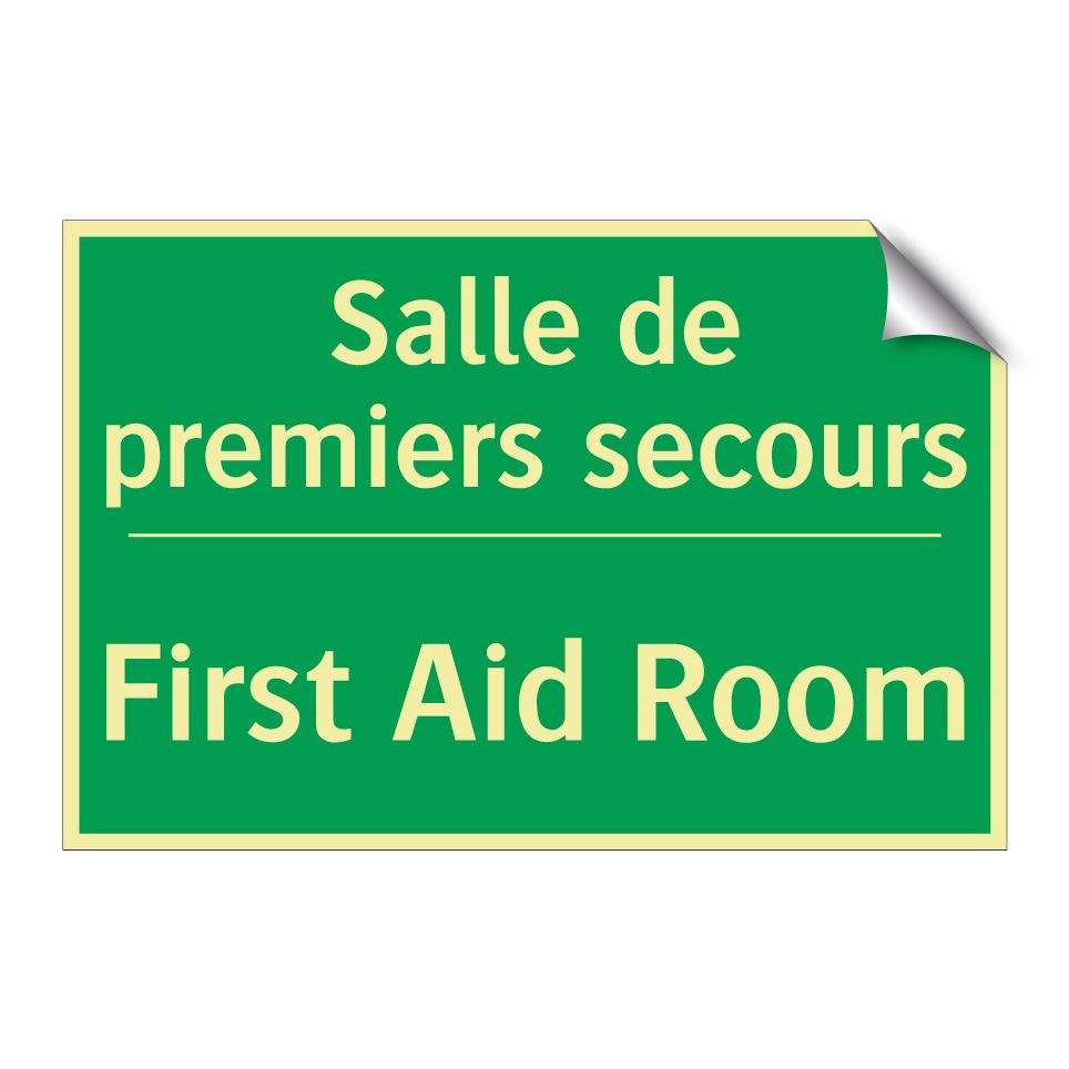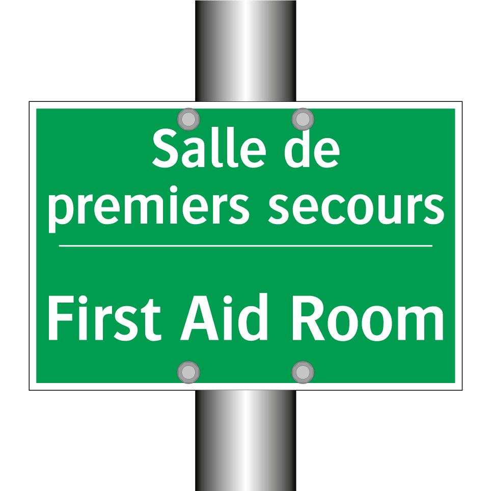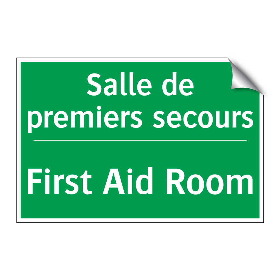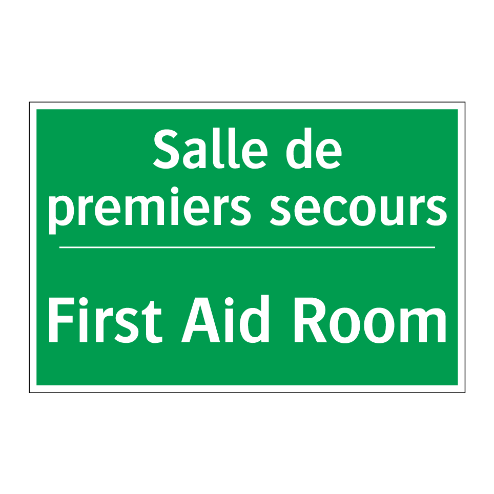 Panneau de secours bilingue avec texte en français : "Salle de premiers secours", et en anglais : "First Aid Room"
