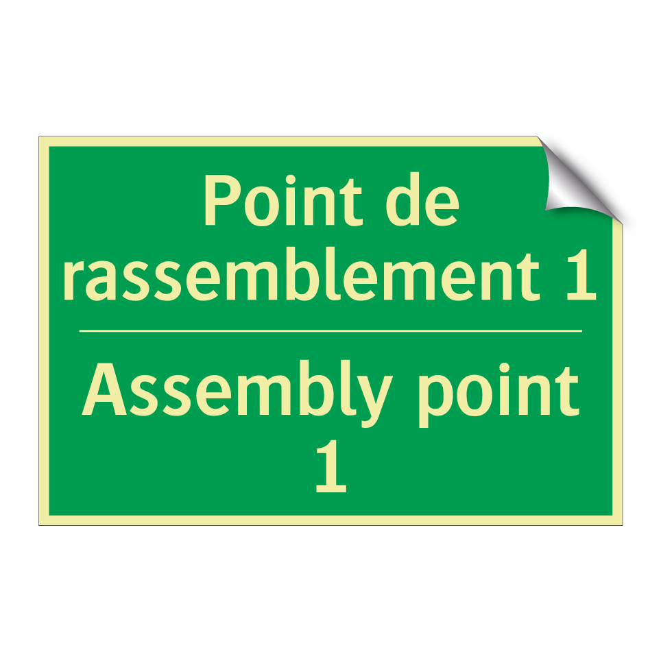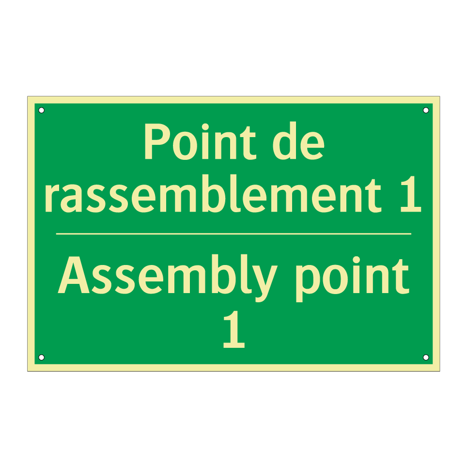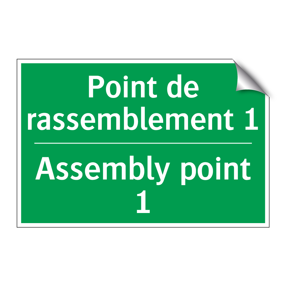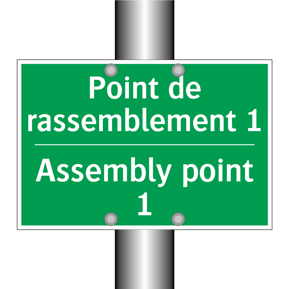 Panneau de secours bilingue avec texte en français : "Point de rassemblement 1", et en anglais : "Assembly point 1"
