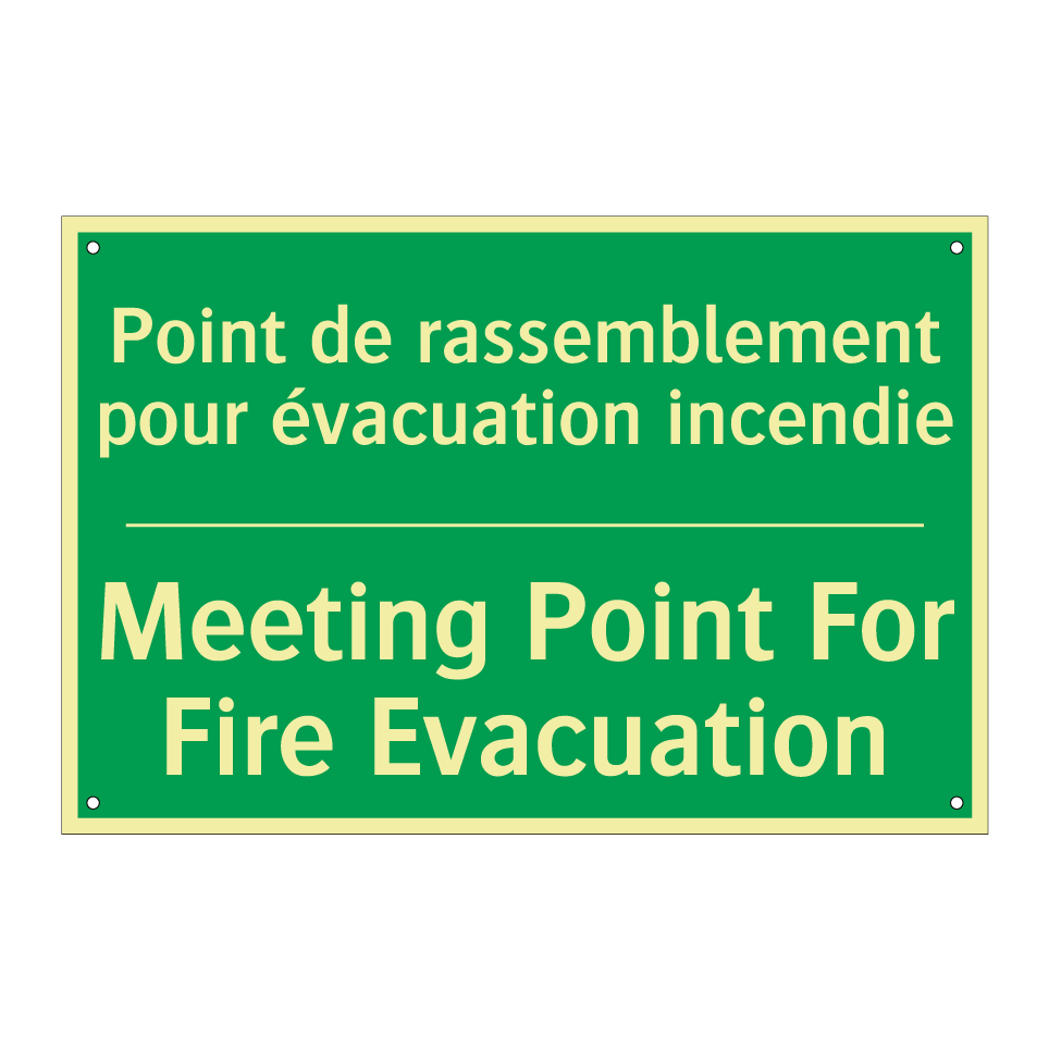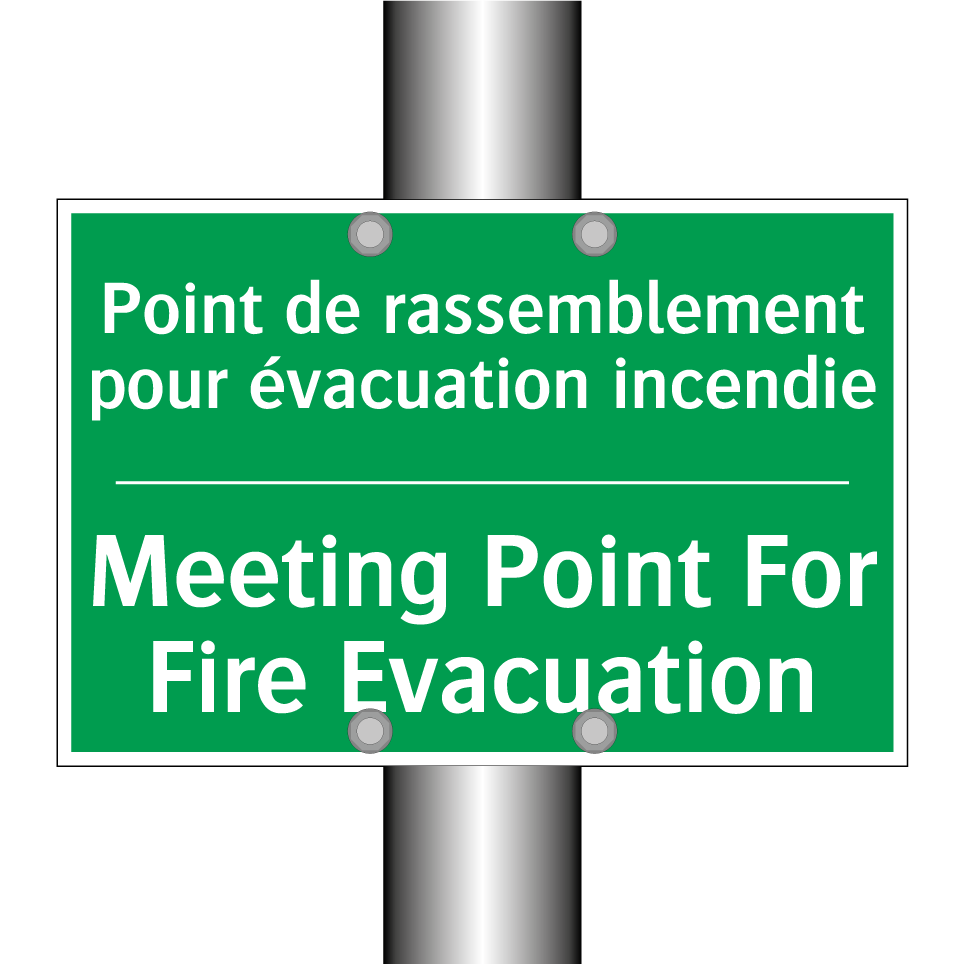 Panneau de secours bilingue avec texte en français : "Point de rassemblement pour évacuation incendie", et en anglais : "Meeting Point For Fire Evacuation"