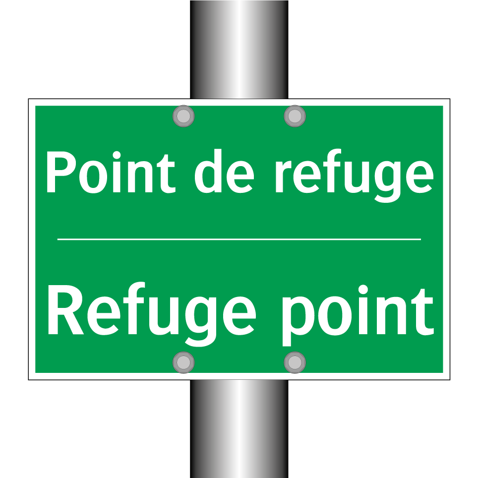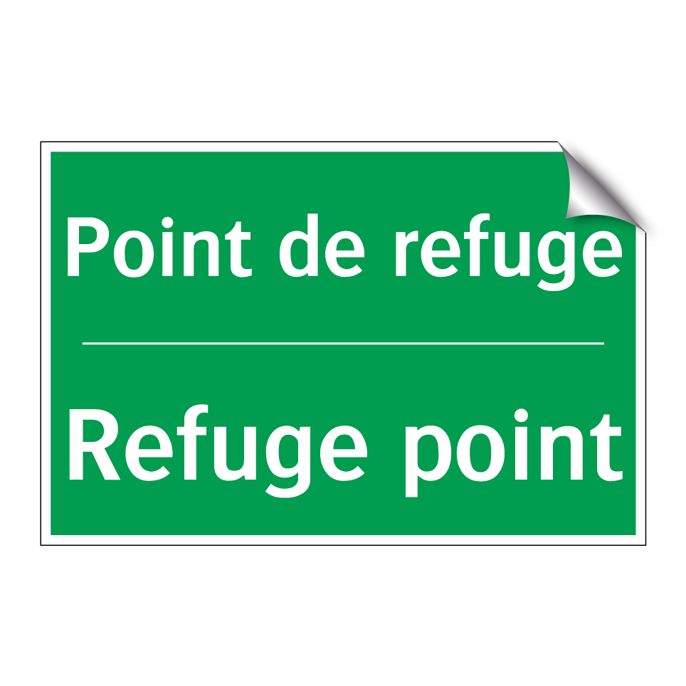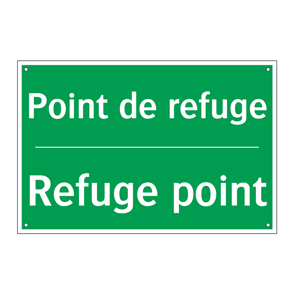Panneau de secours bilingue avec texte en français : "Point de refuge", et en anglais : "Refuge point"
