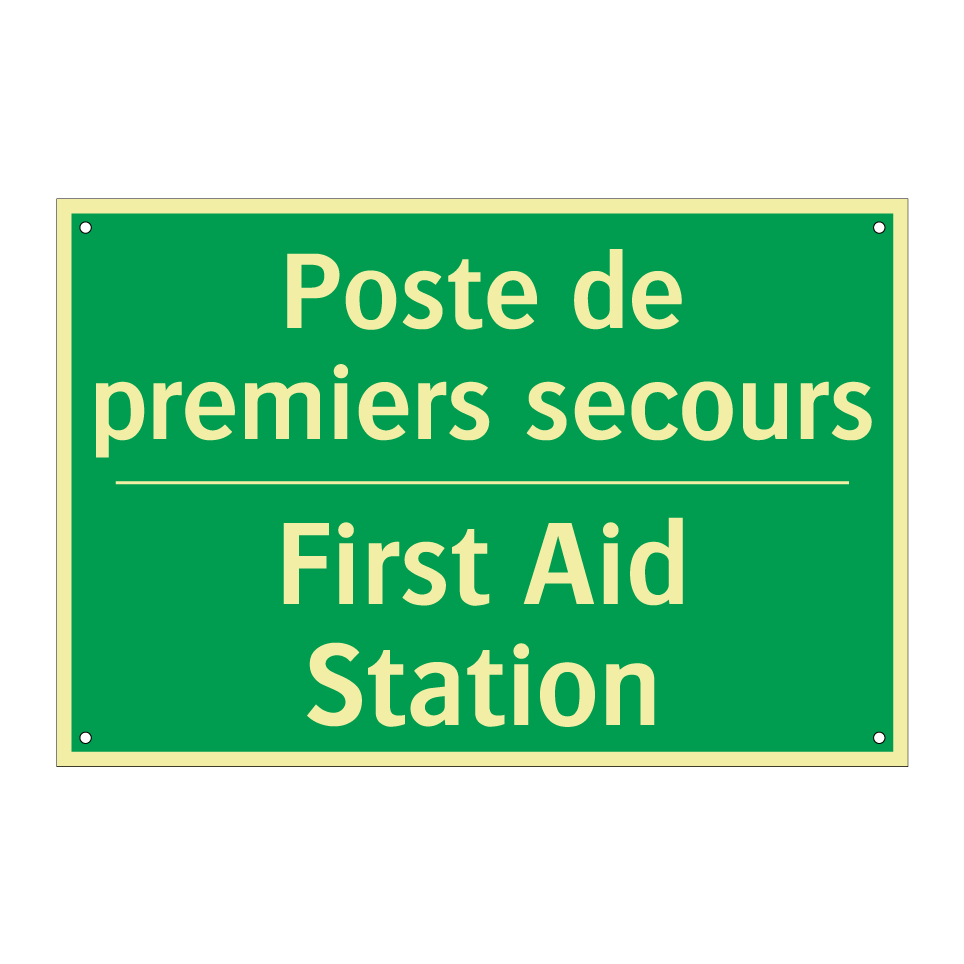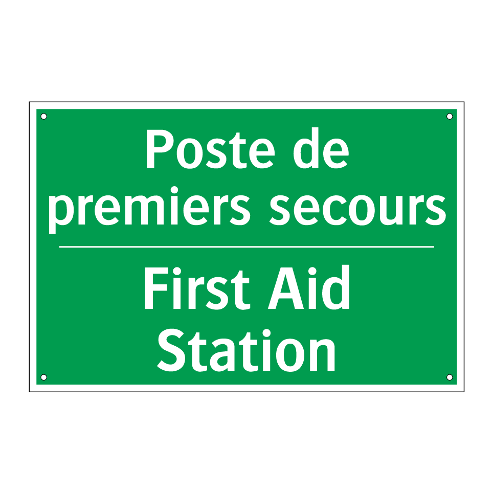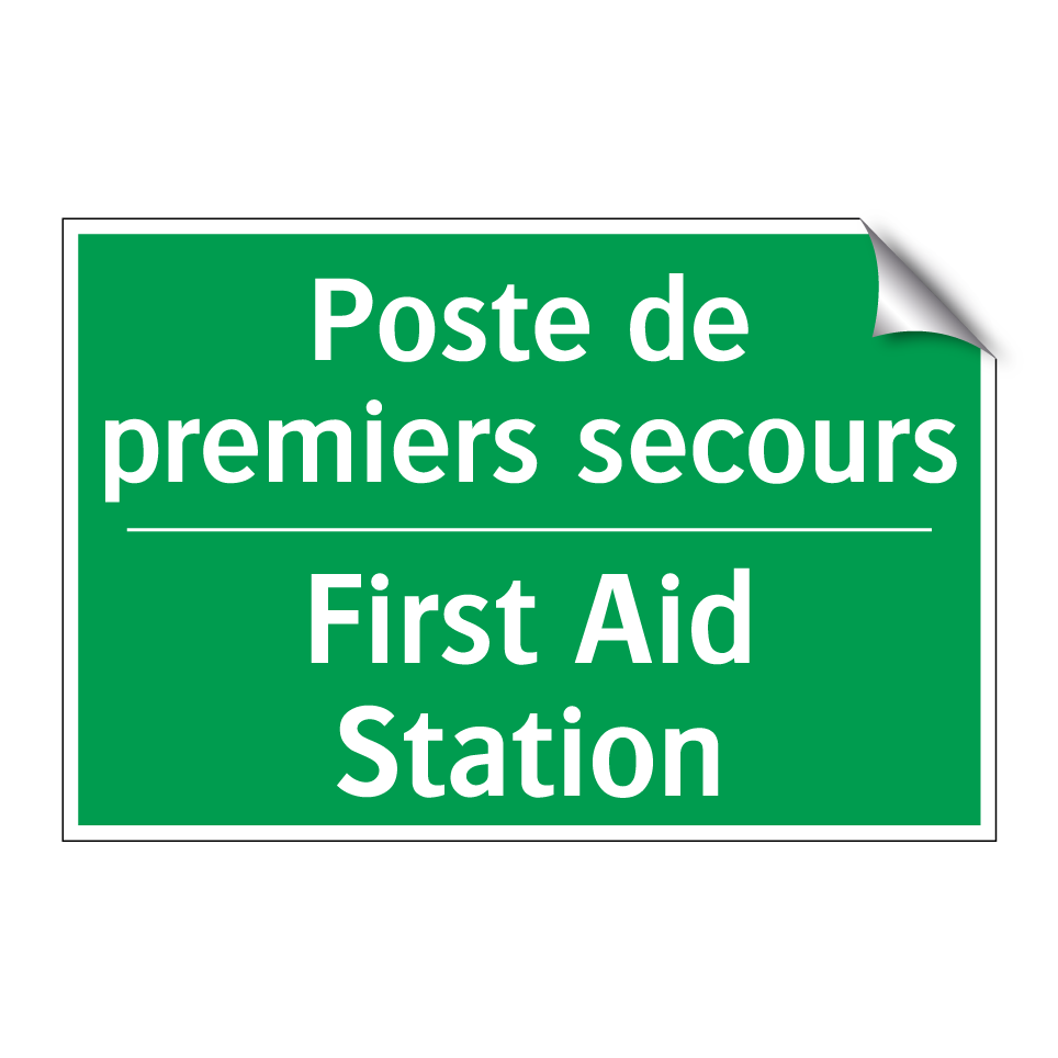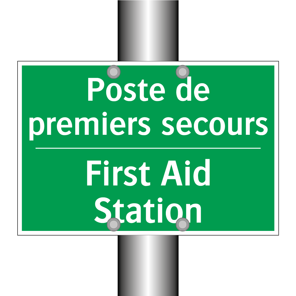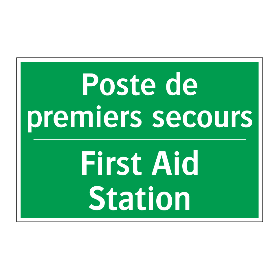 Panneau de secours bilingue avec texte en français : "Poste de premiers secours", et en anglais : "First Aid Station"