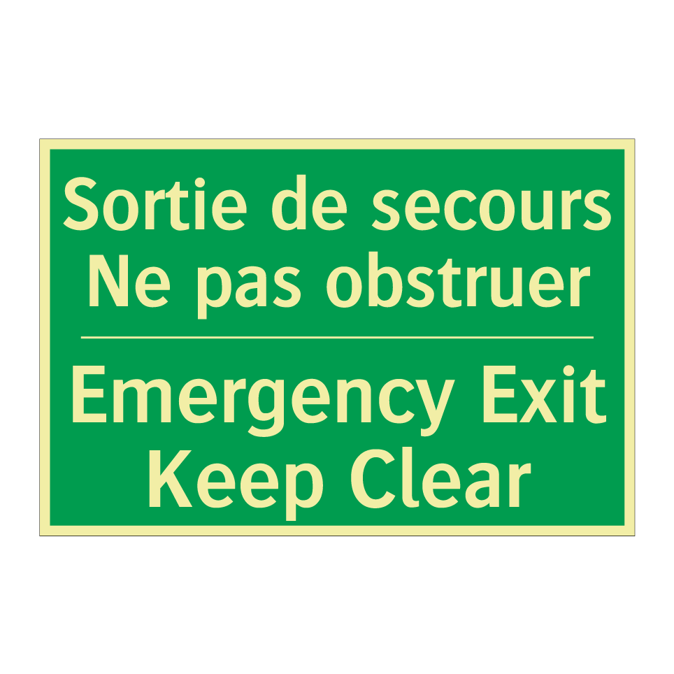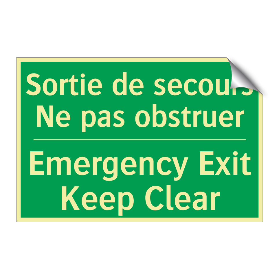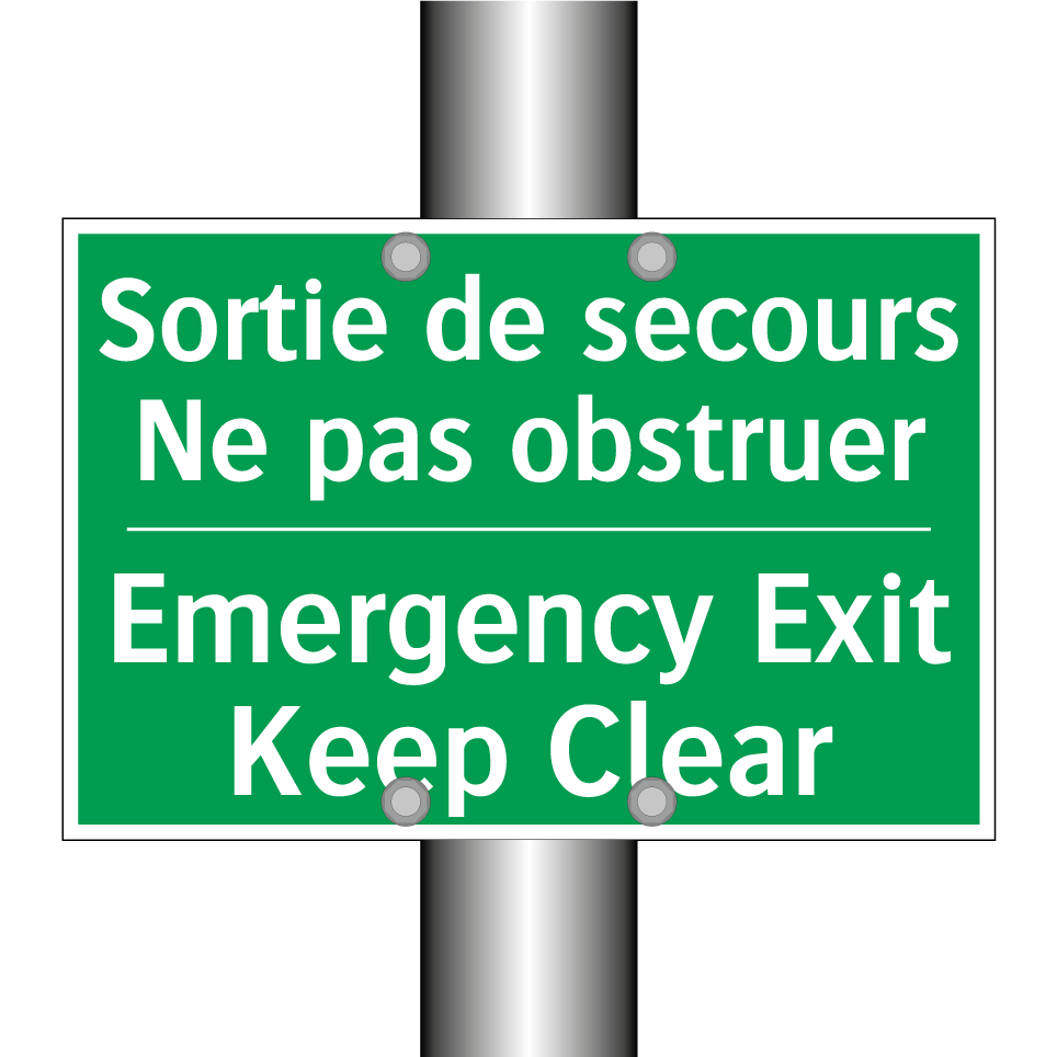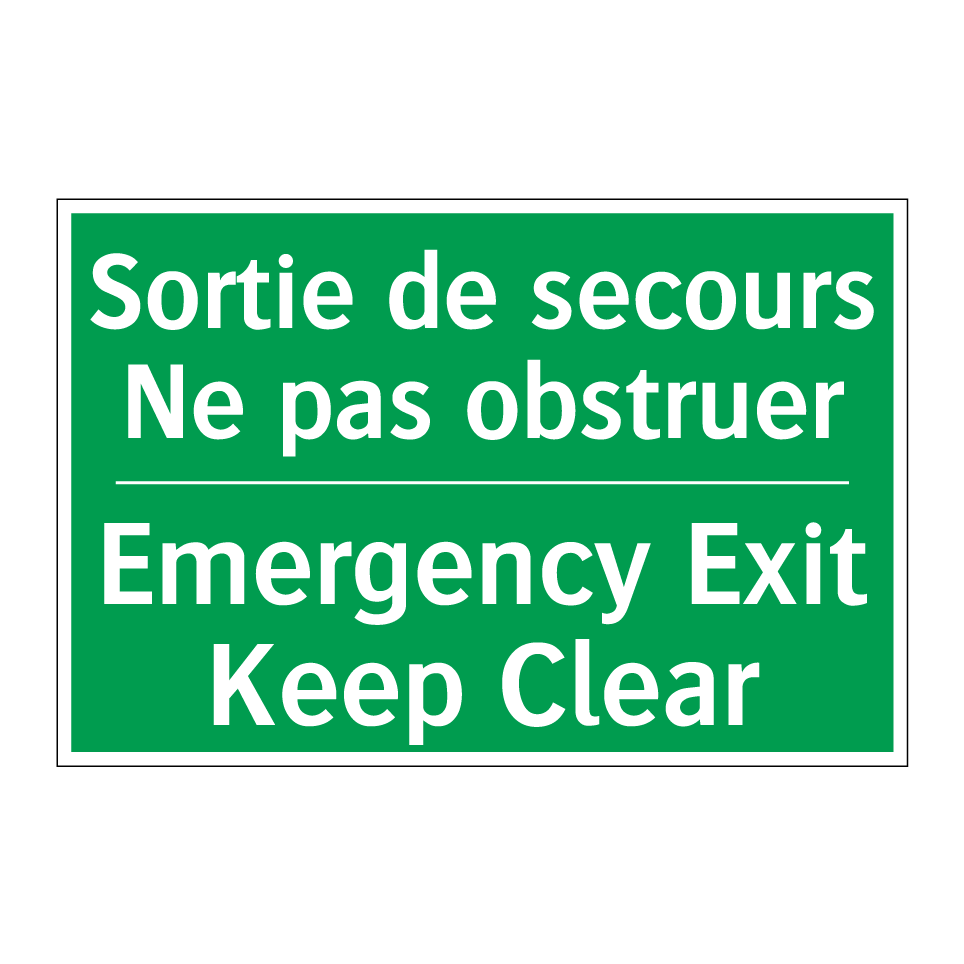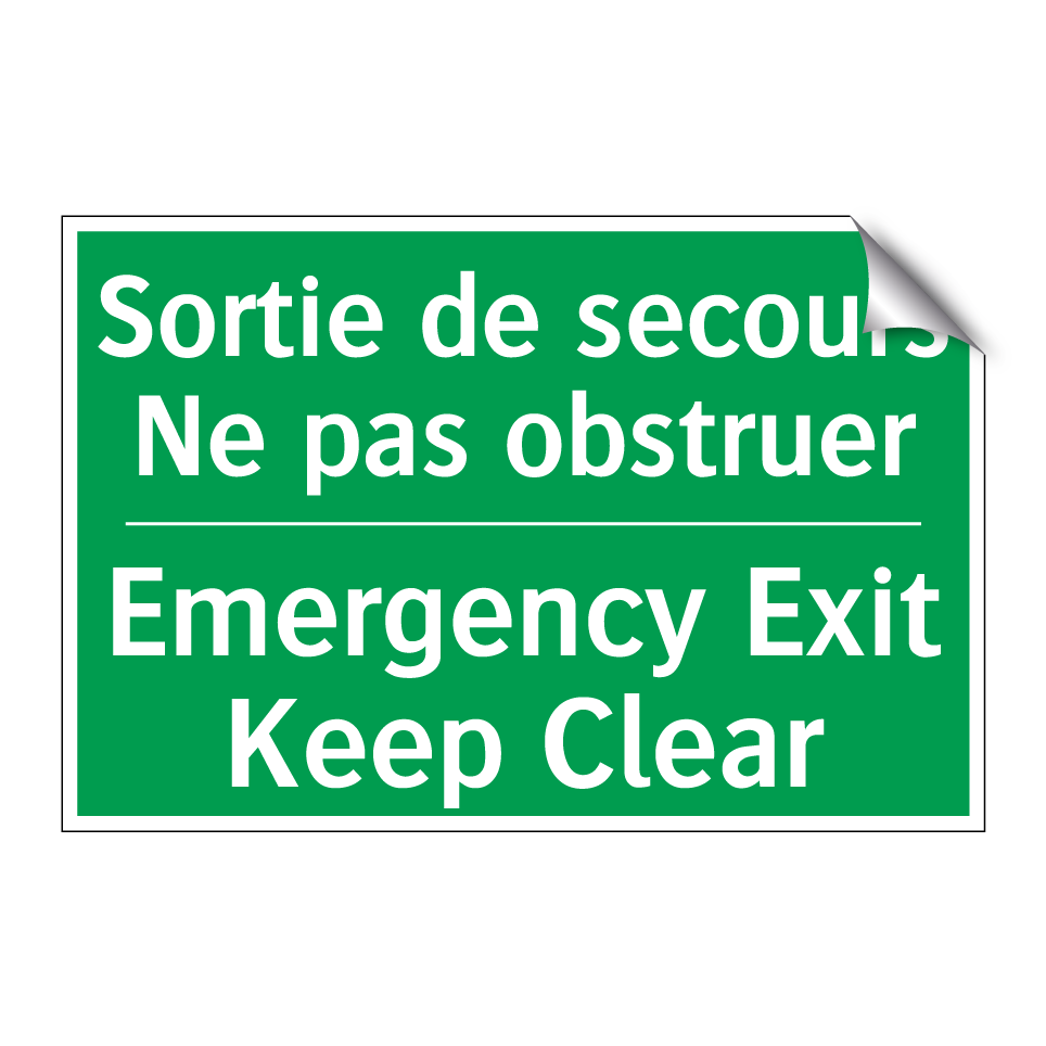 Panneau de secours bilingue avec texte en français : "Sortie de secours Ne pas obstruer", et en anglais : "Emergency Exit Keep Clear"