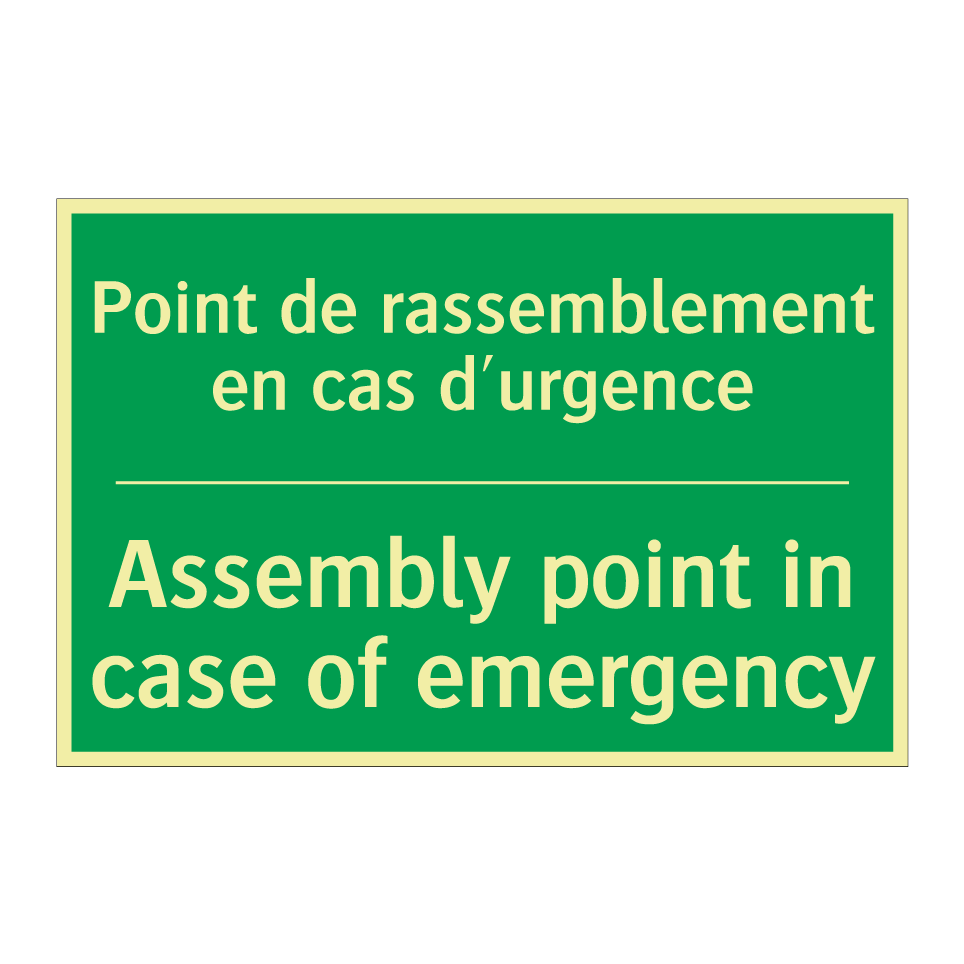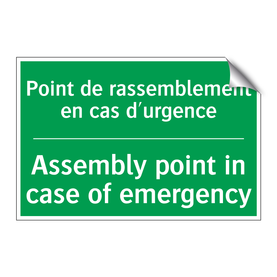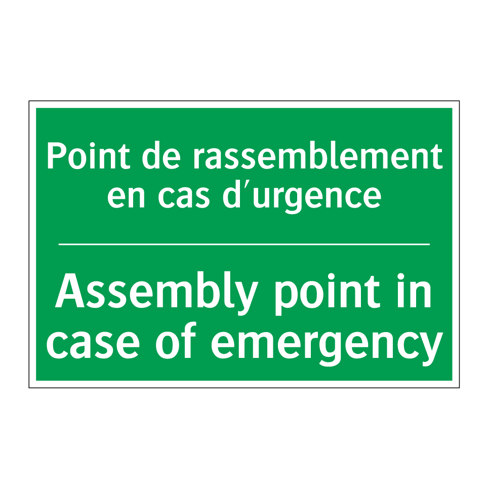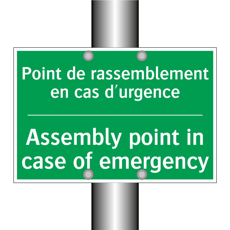 Panneau de secours bilingue avec texte en français : "Point de rassemblement en cas d'urgence", et en anglais : "Assembly point in case of emergency"