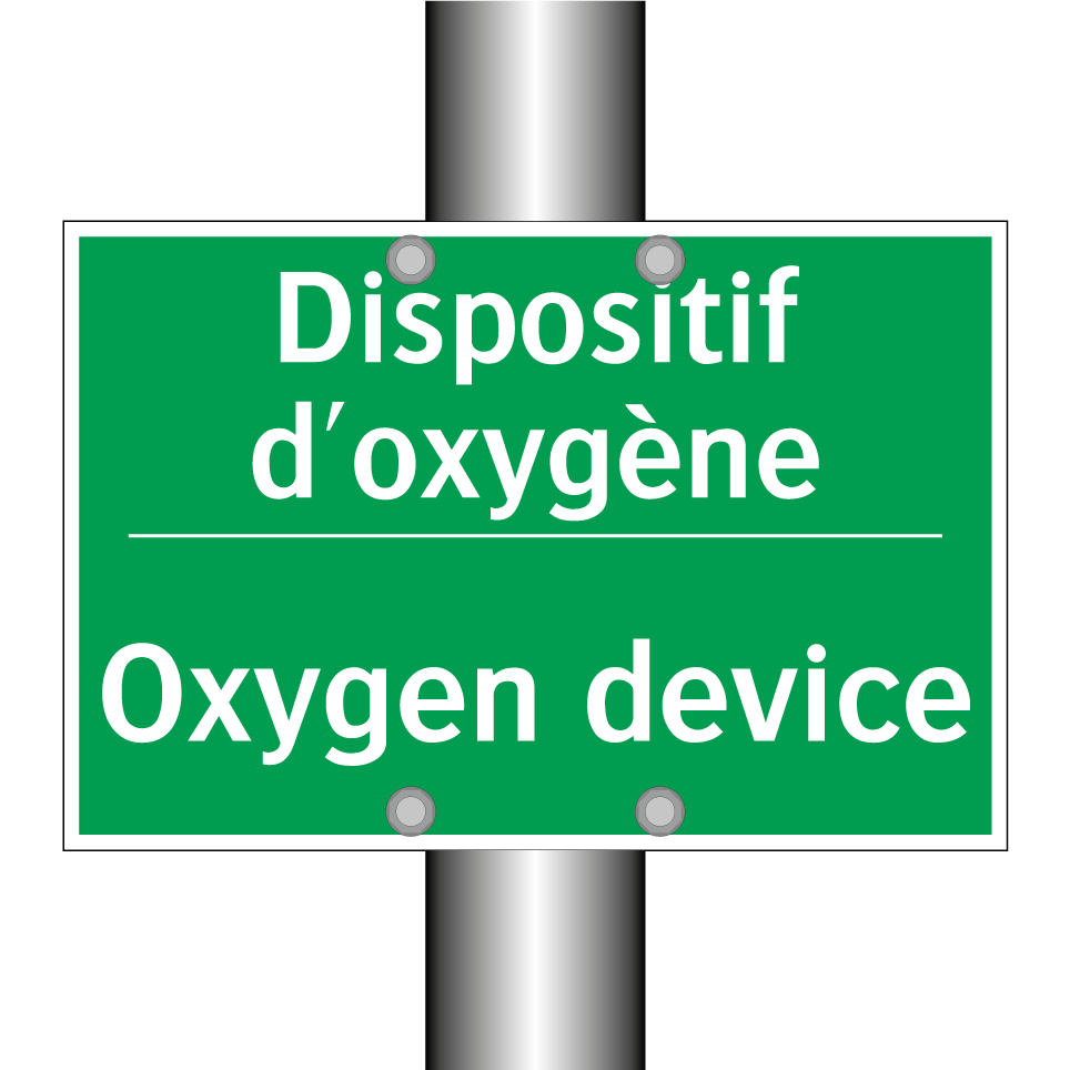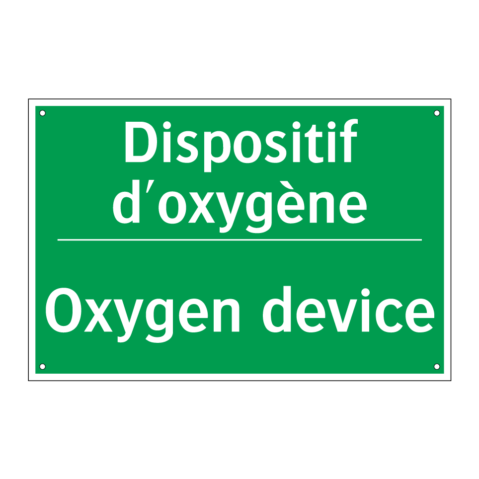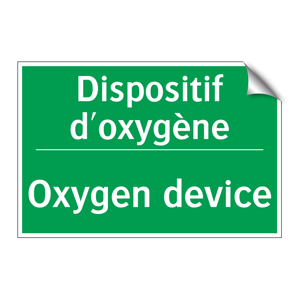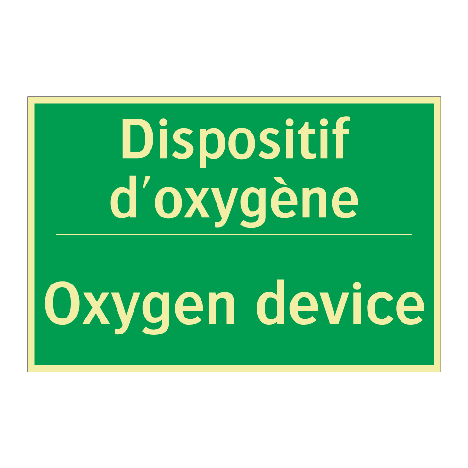 Panneau de secours bilingue avec texte en français : "Dispositif d'oxygène", et en anglais : "Oxygen device"