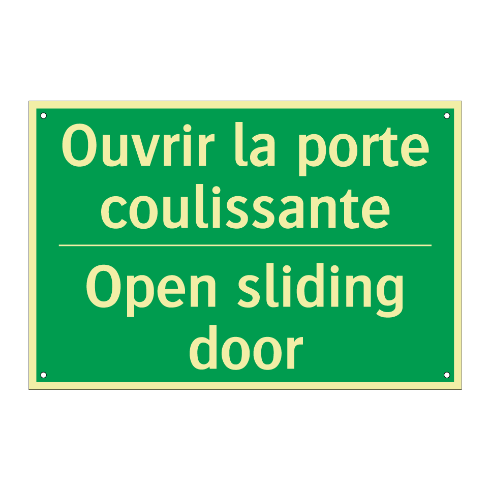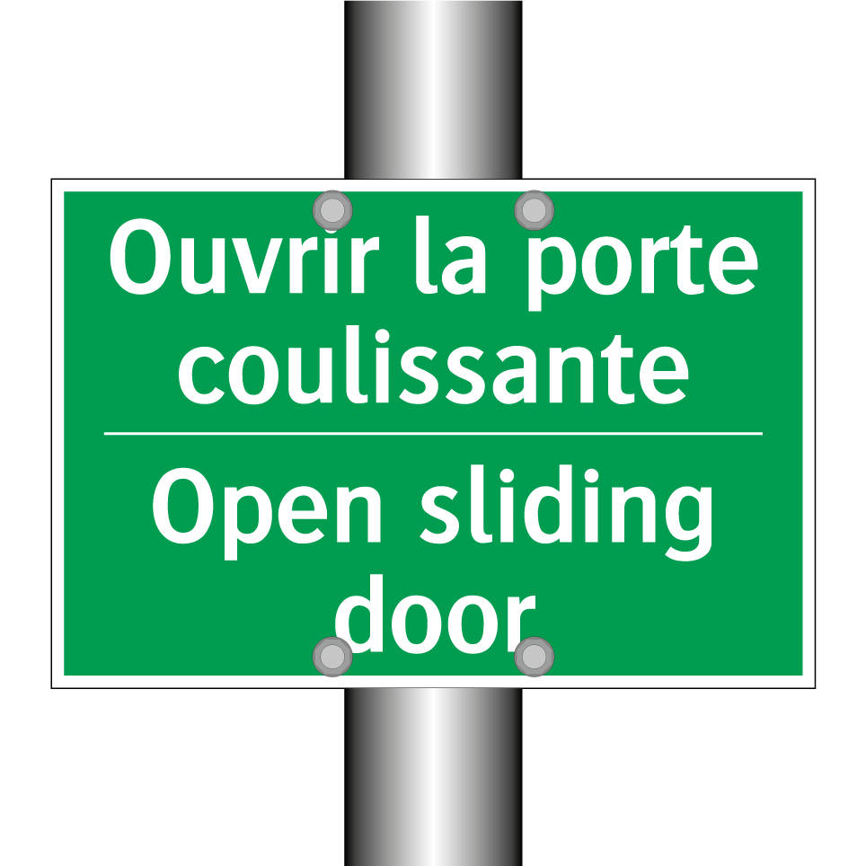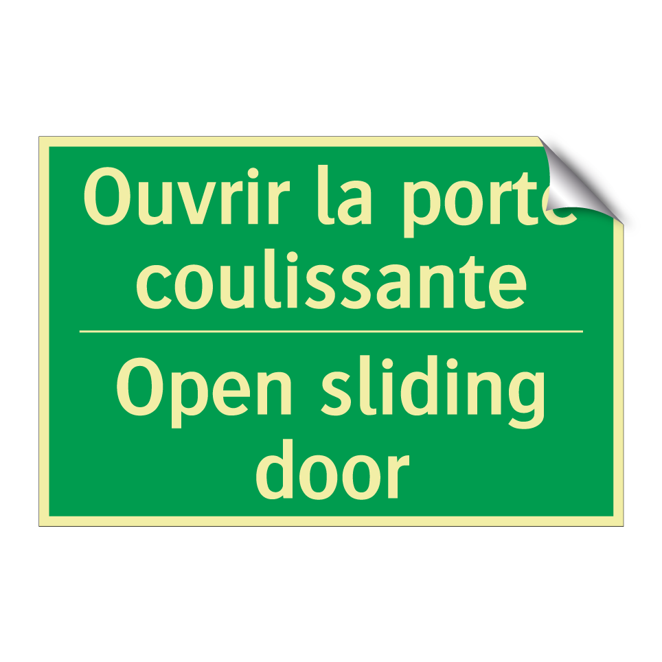 Panneau de secours bilingue avec texte en français : "Ouvrir la porte coulissante", et en anglais : "Open sliding door"