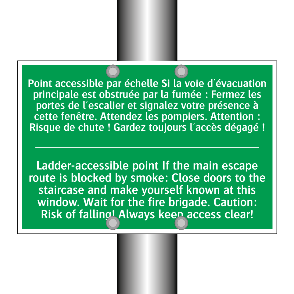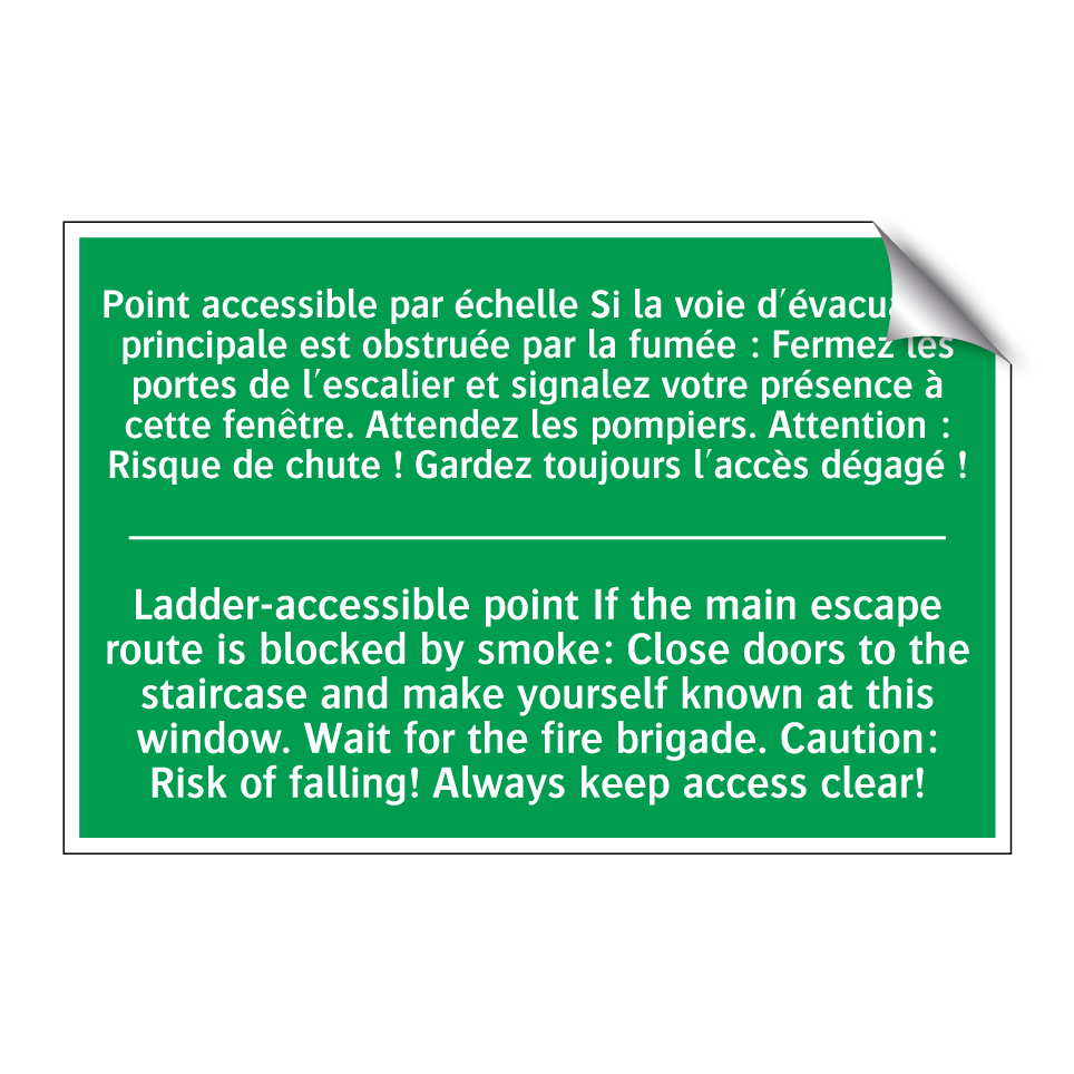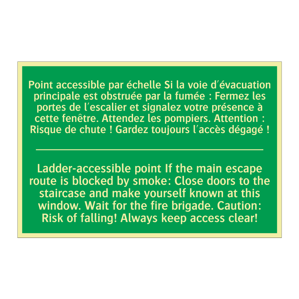 Panneau de secours bilingue avec texte en français : "Point accessible par échelle Si la voie d'évacuation principale est obstruée par la fumée : Fermez les portes de l'escalier et signalez votre présence à cette fenêtre. Attendez les pompiers. Attention : Risque de chute ! Gardez toujours l'accès dégagé !", et en anglais : "Ladder-accessible point If the main escape route is blocked by smoke: Close doors to the staircase and make yourself known at this window. Wait for the fire brigade. Caution: Risk of falling! Always keep access clear!"