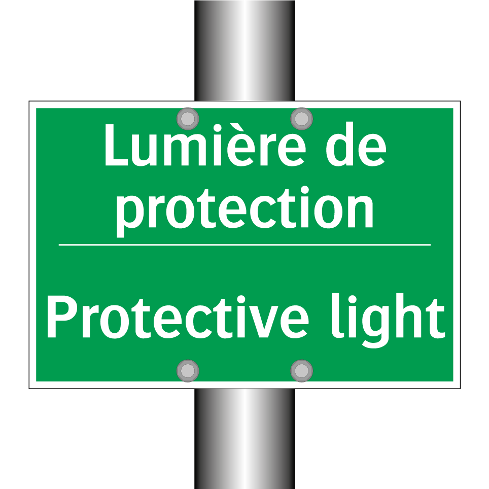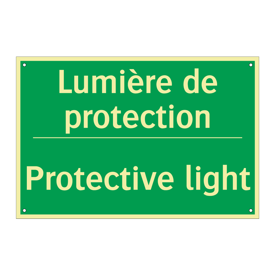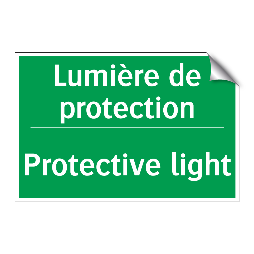 Panneau de secours bilingue avec texte en français : "Lumière de protection", et en anglais : "Protective light"