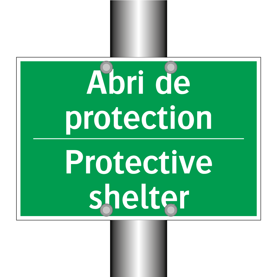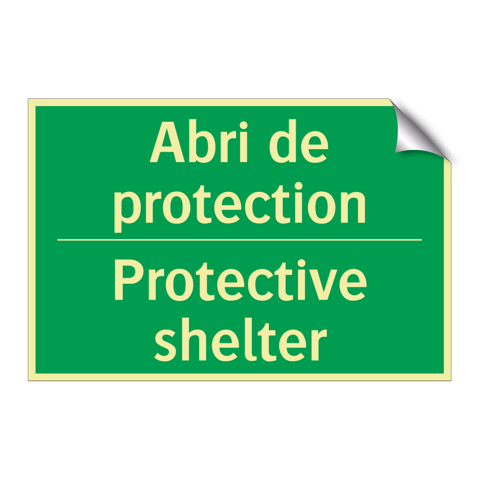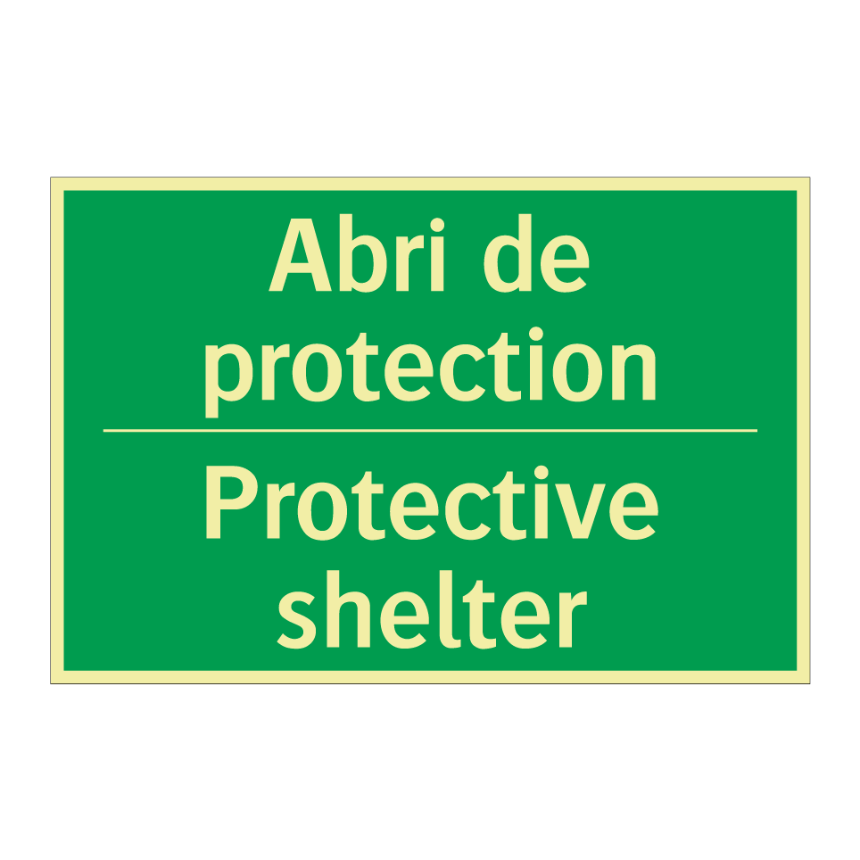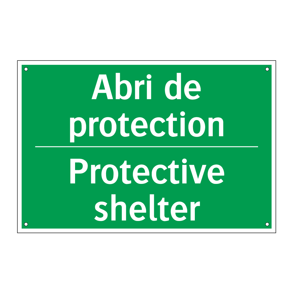 Panneau de secours bilingue avec texte en français : "Abri de protection", et en anglais : "Protective shelter"