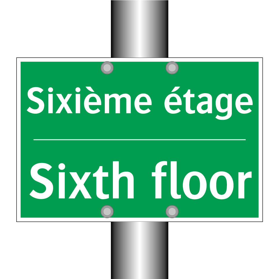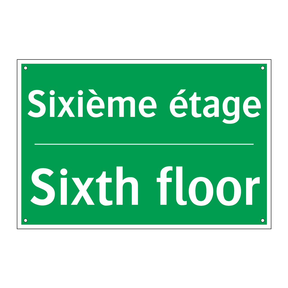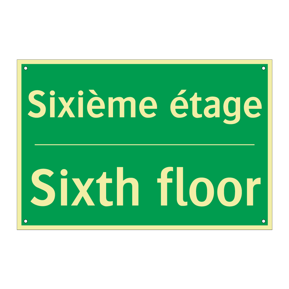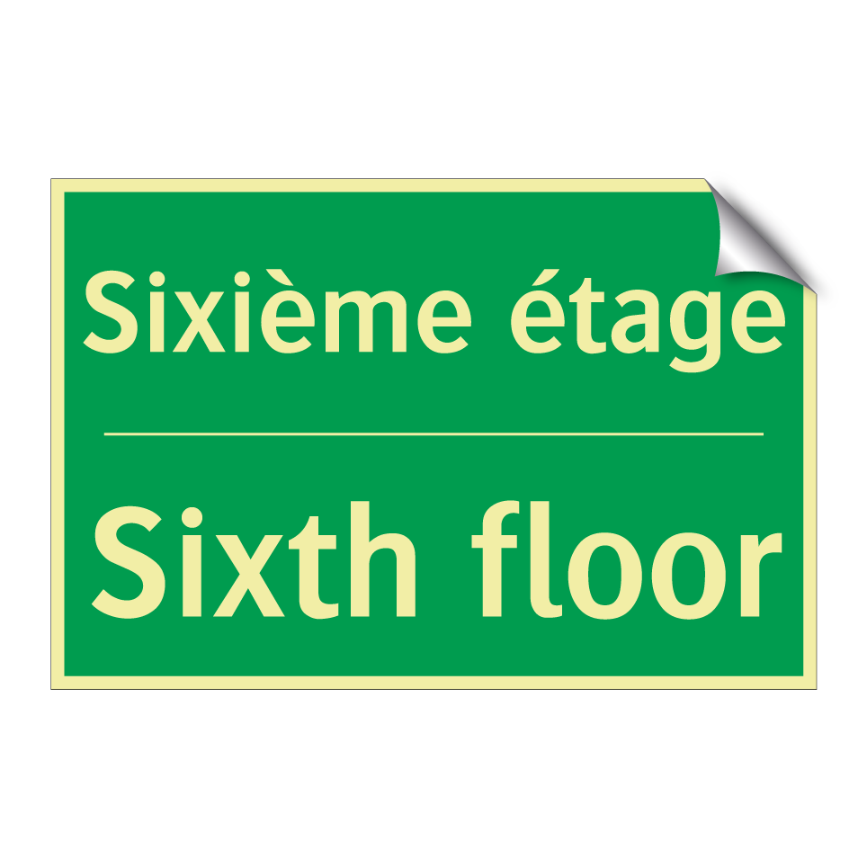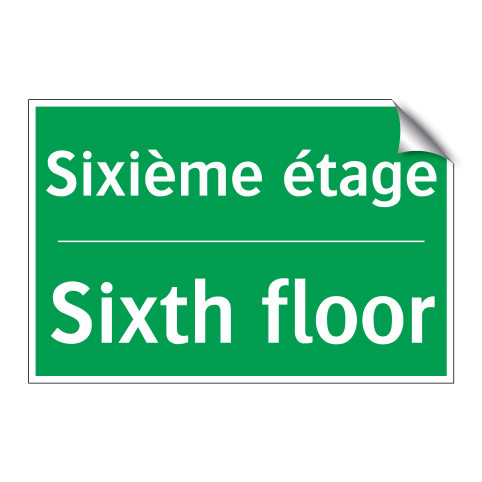 Panneau de secours bilingue avec texte en français : "Sixième étage", et en anglais : "Sixth floor"