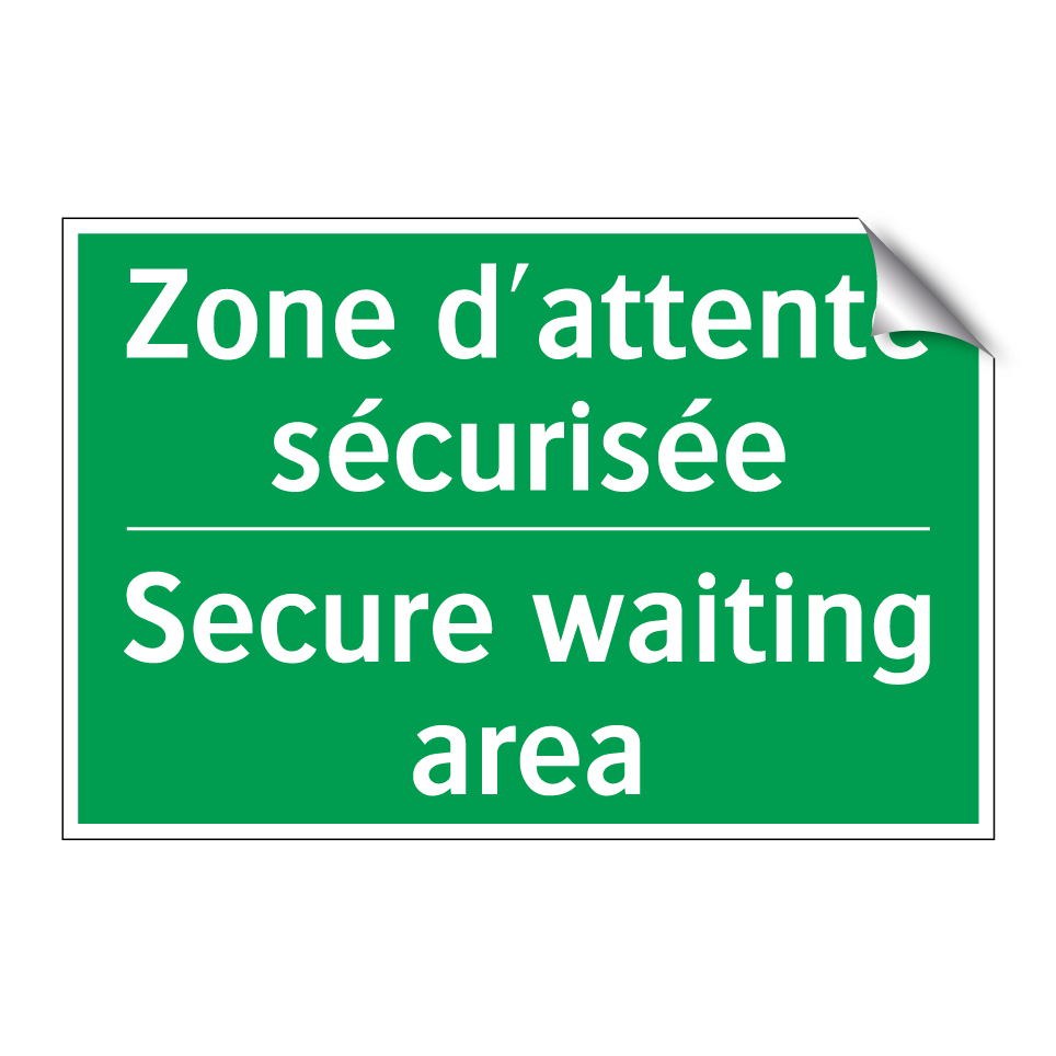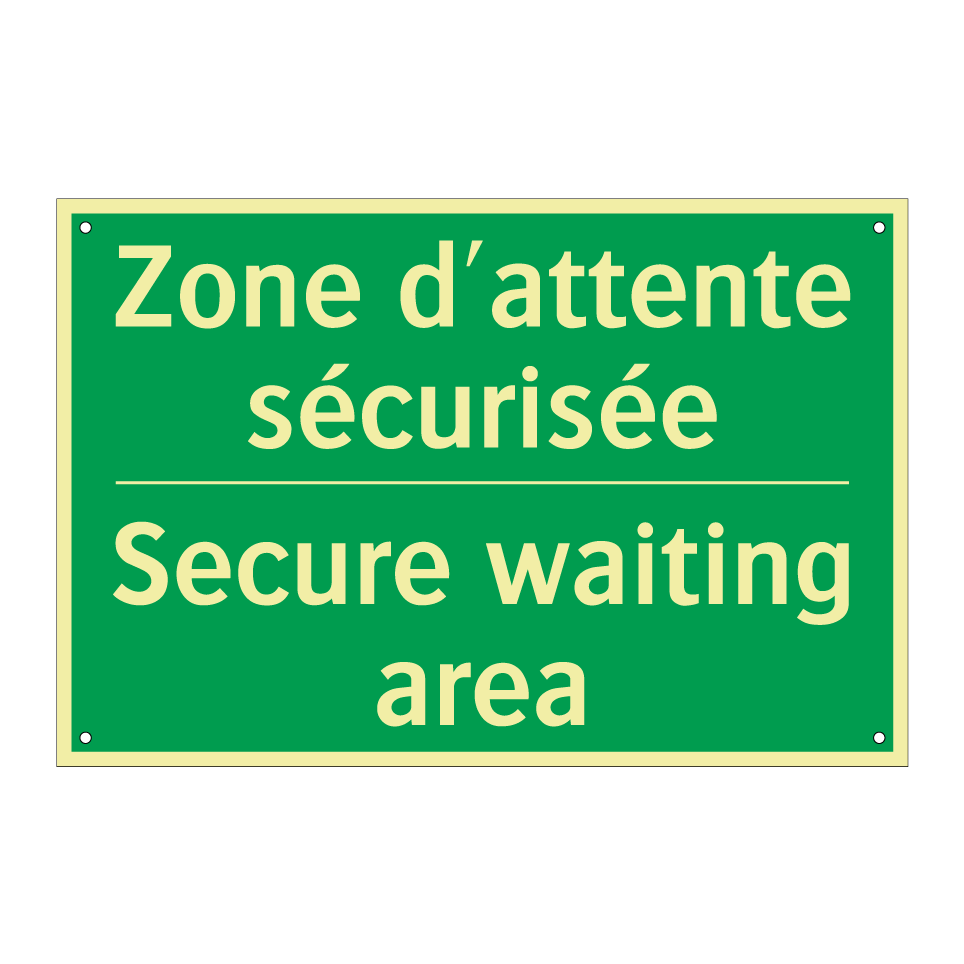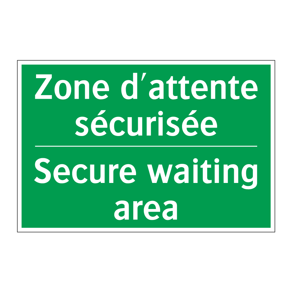 Panneau de secours bilingue avec texte en français : "Zone d'attente sécurisée", et en anglais : "Secure waiting area"